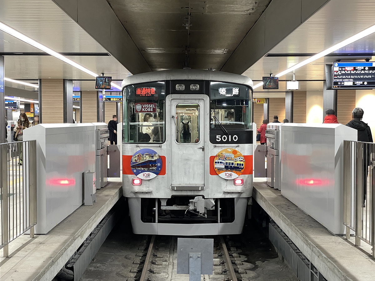 尼崎を乗り過ごし梅田に到着。山陽5000系にもヘッドマークが3つ。腰の円盤2つはゴチャゴチャしていて良く読み取れないのですが、どちらも山陽電鉄100周年のもので、4種類あるようです。向かって左側のヘッドマークは阪急電車かと思いきや、大正時代の山陽電車と分かりました。