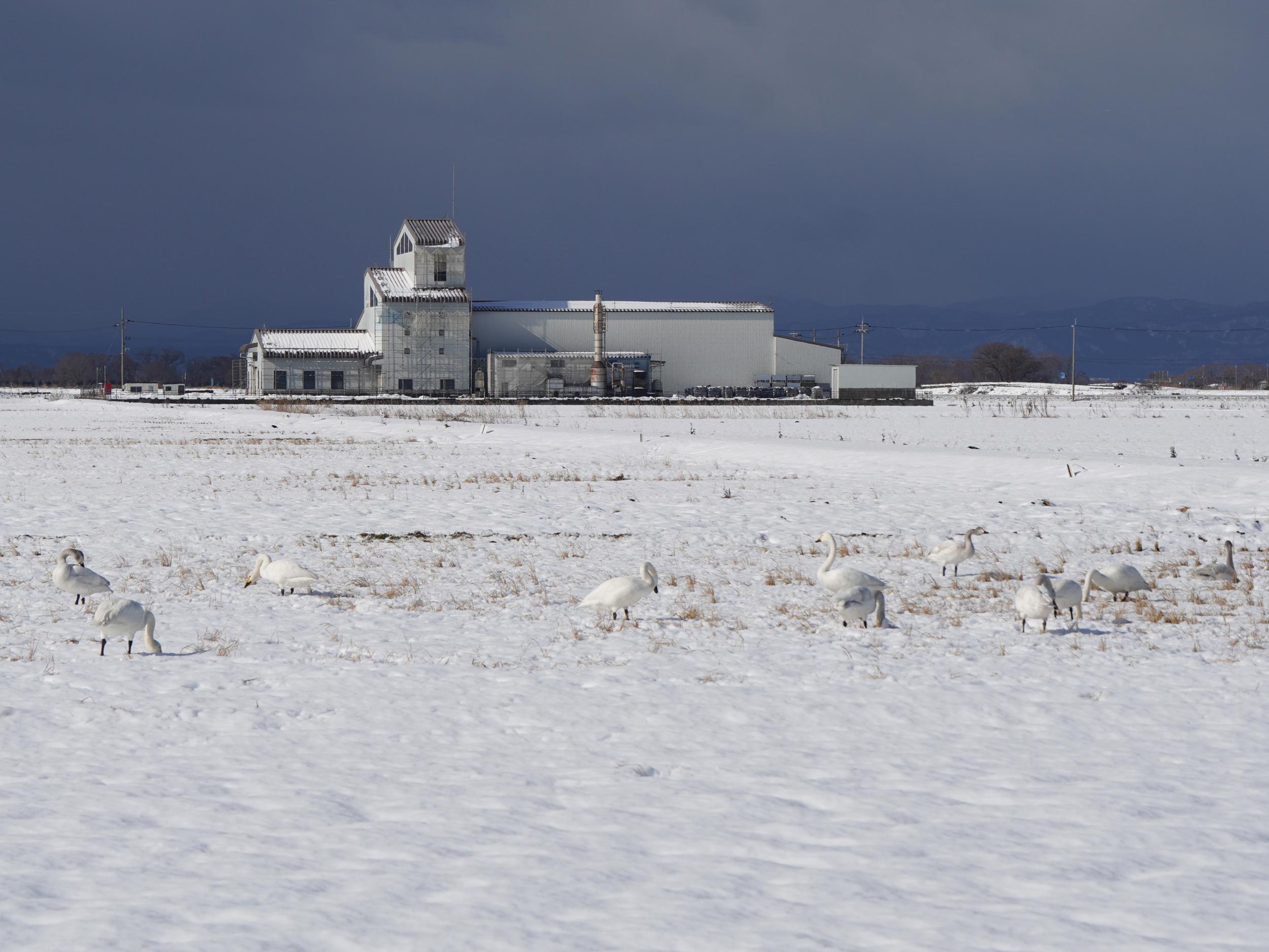 姉川を渡り、ナビを無視していつもの第1チェックポイント、JA北びわこカントリーエレベーターへ。一面真っ白でコハクチョウの姿は見当たらず、カントリーエレベーター脇の道は雪が降った時のままで歩くこともできないのですが、よーく見ると東側遠くにそれらしきが。ぐるっと1.5kmほど遠回りして東側へ移動するといました、コハクチョウが10羽。