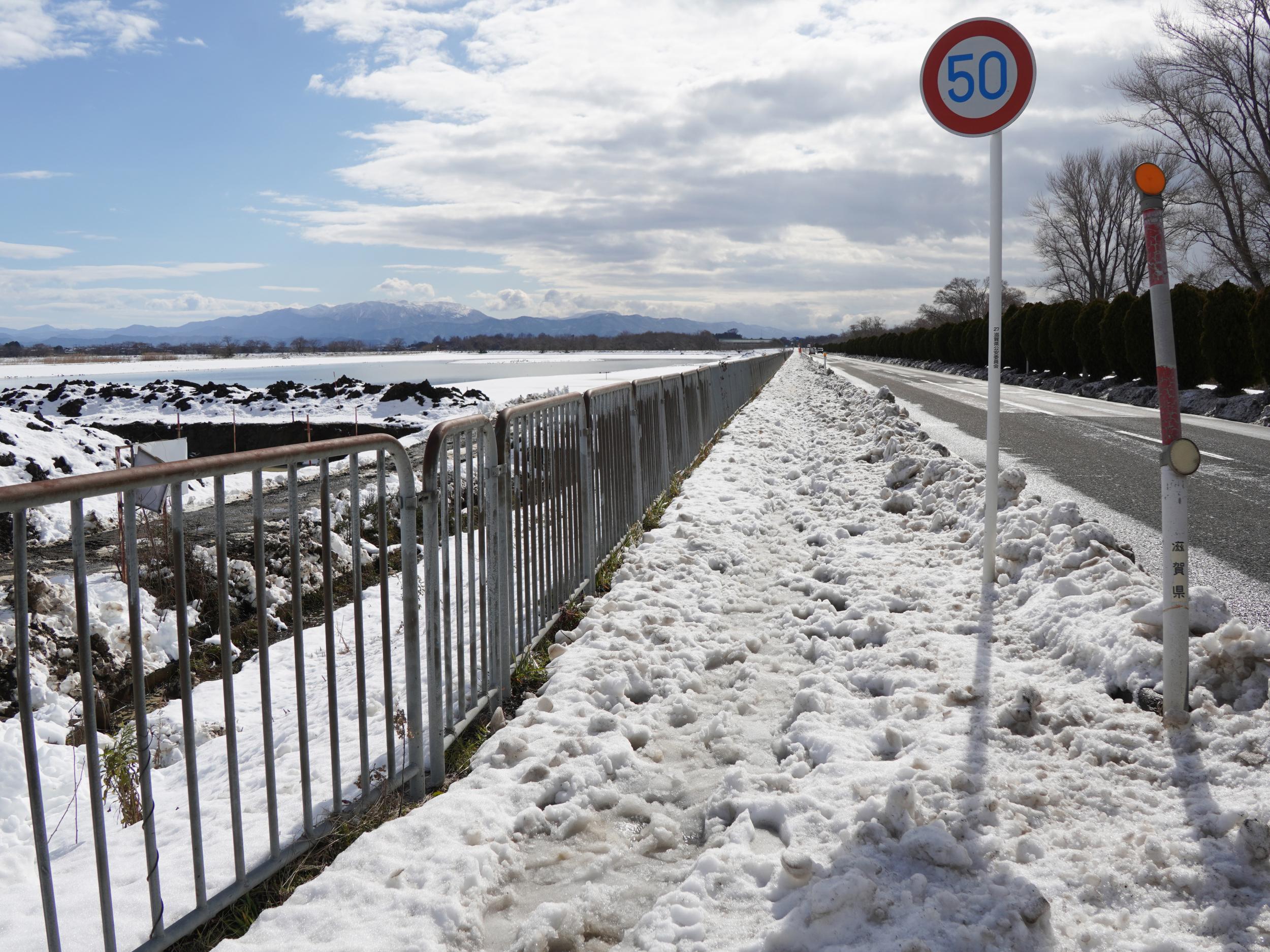 湖北野鳥センターをナビに設定して出発、天野川を越えた辺りの田園地帯から伊吹山。長浜市内に入り湖周道路を北へ。2車線あるような道路はほぼ完全に除雪されているのですが、歩道はまだほとんど雪が積もったまま、除雪された雪が車道脇に積まれ車道も狭まっているので自転車で走るのは危険です。