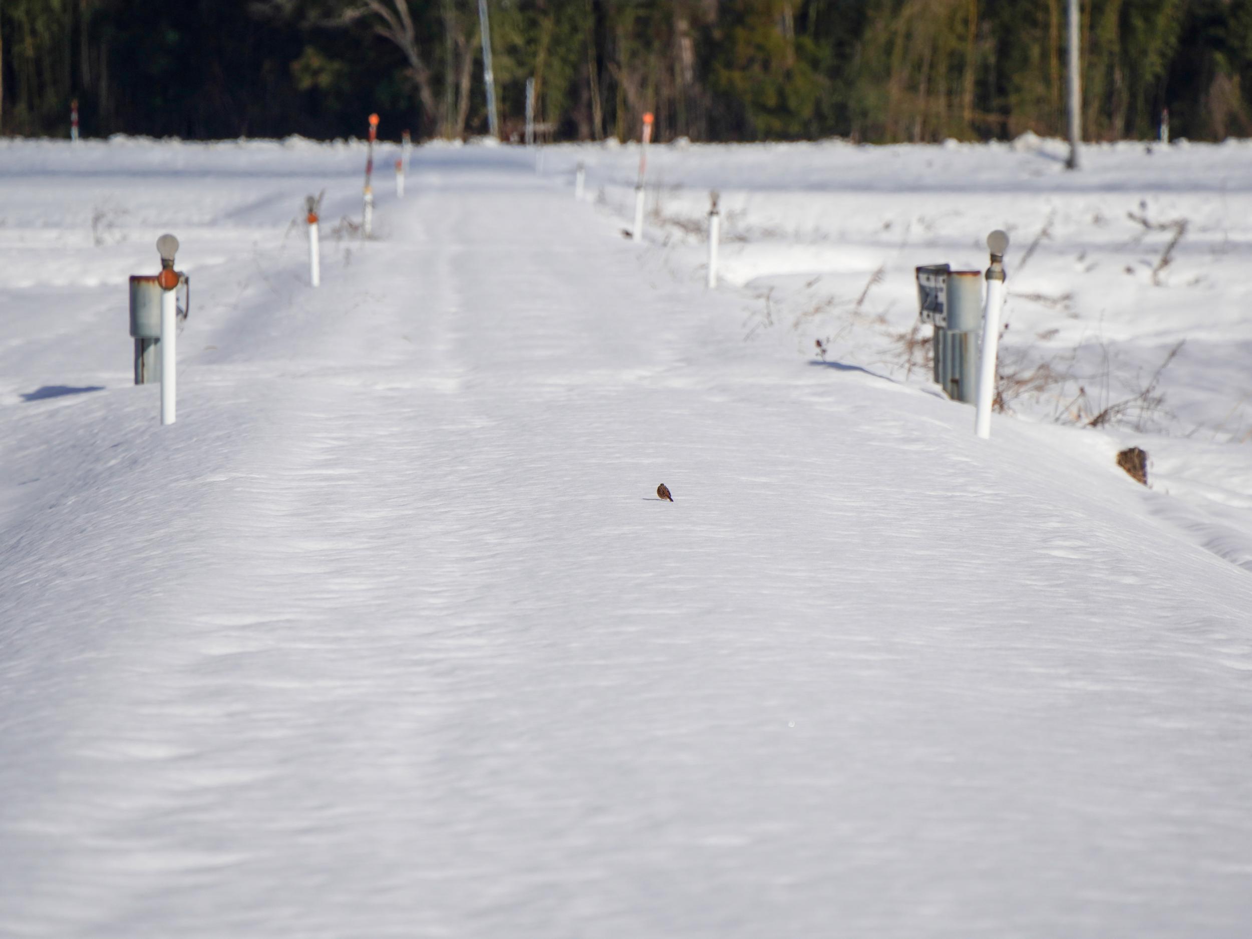 県道265が直角にクランクしている位置が現在地です。現在地から東へ伸びた除雪されていない農道にポツンと黒い点、ツグミです。