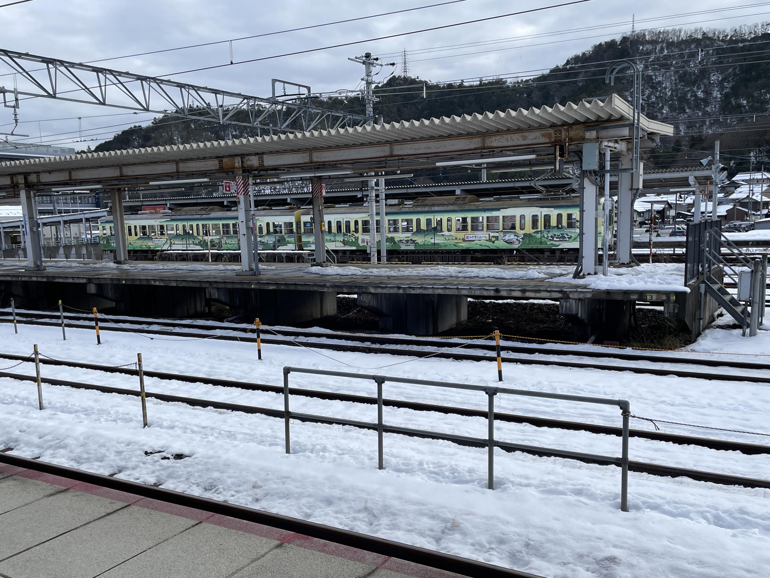 近江鉄道の電車は何やらごちゃごちゃしたラッピング、拡大すると「近江十景とれいん」とあり、ちまちまと沿線風景が描かれています。乗客の多くない路線なのでもっと遠くからの視認性を高めるべきかと。改札へ向かうといきなりエスカレーターが左並びになって久々に大阪圏の外に出てきたことを実感。
