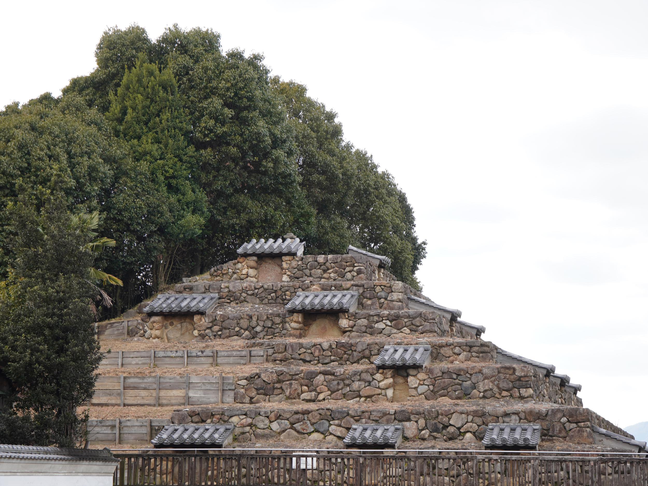 帰ってからじっくりチェックしてみたところ、頭塔とは二月堂を創建、修二会の創始者とされる東大寺の僧、実忠により築かれた仏塔(パゴダ)と分かりました。瓦屋根の祠のそれぞれにレリーフの石仏が安置されていて、上の写真を拡大すると石仏が確認できます。発掘調査の後、北半分だけが奈良文化財研究所により復元されたそうです。そのため瓦屋根だけが新しいです。石仏は各面に11基ずつ合計44基設置されていたと推測され、ほぼ完全にピラミッドの形をしていたようです。