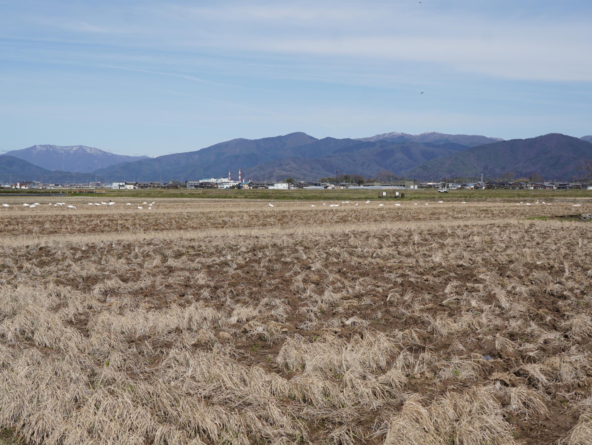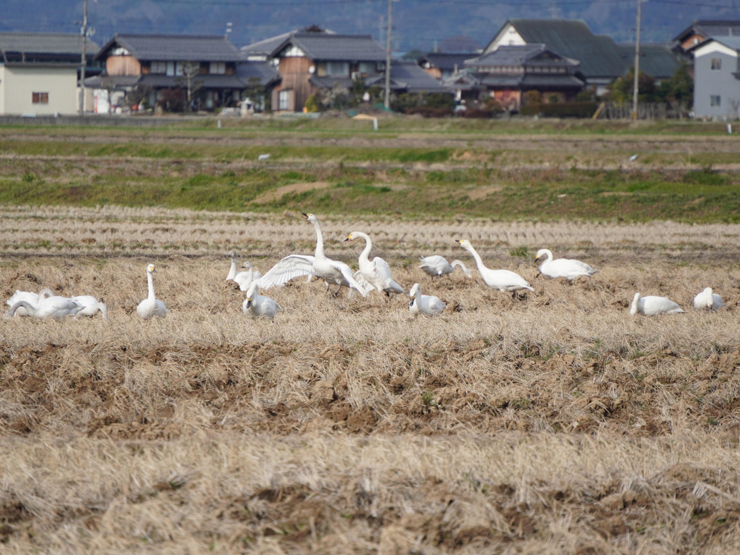 全部で50羽くらい、500mほど離れた東の方にもまとまった数が見えます。湖北野鳥センターのレンジャーのお姉さんの教えてくれた通りです。
