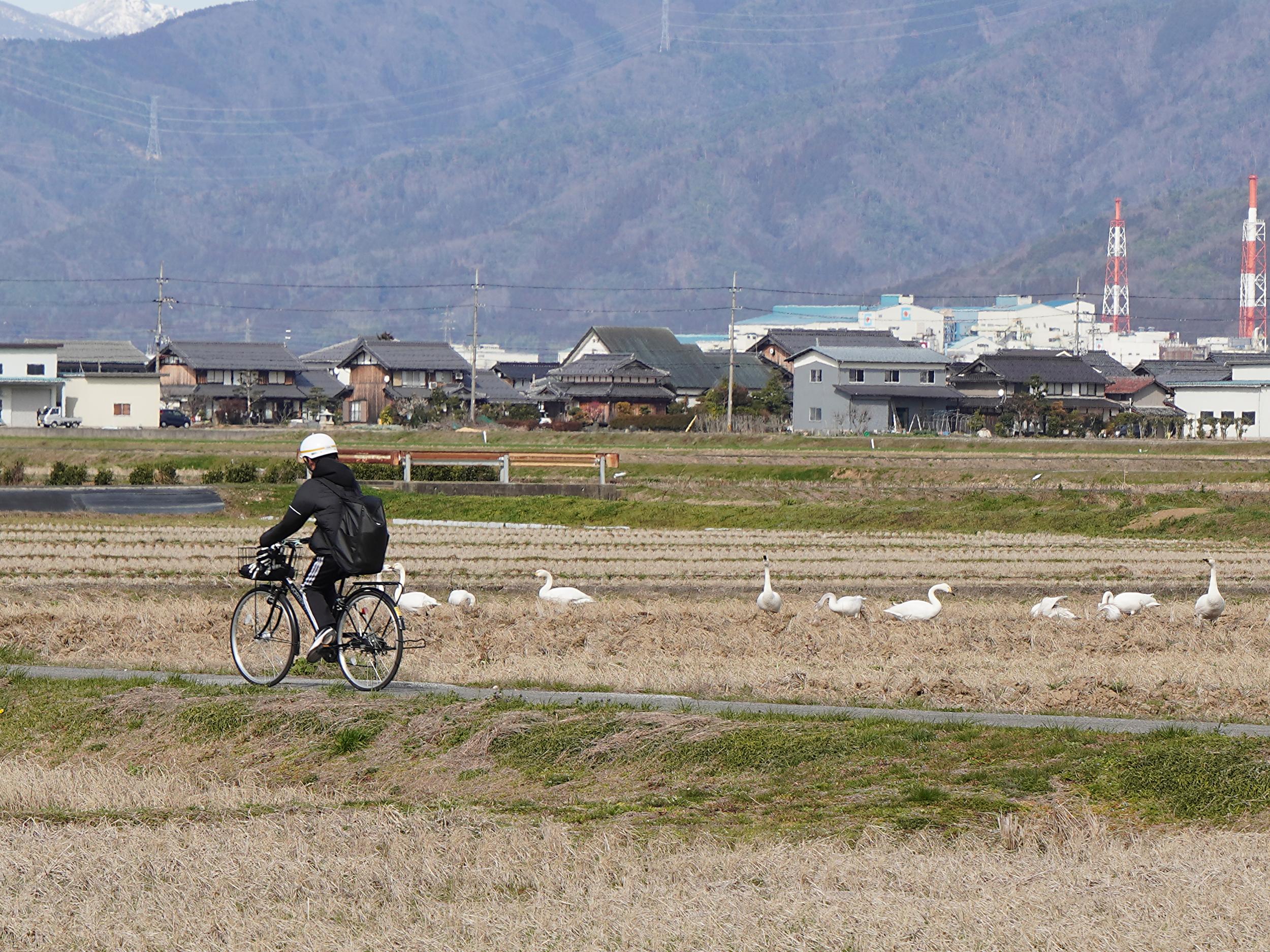 自転車の少年が通過、コハクチョウたちまで10mほどですが動じる様子はありません。長浜えきまちテラスの壁画に描かれた「自転車の自分」そのものの景色です。
