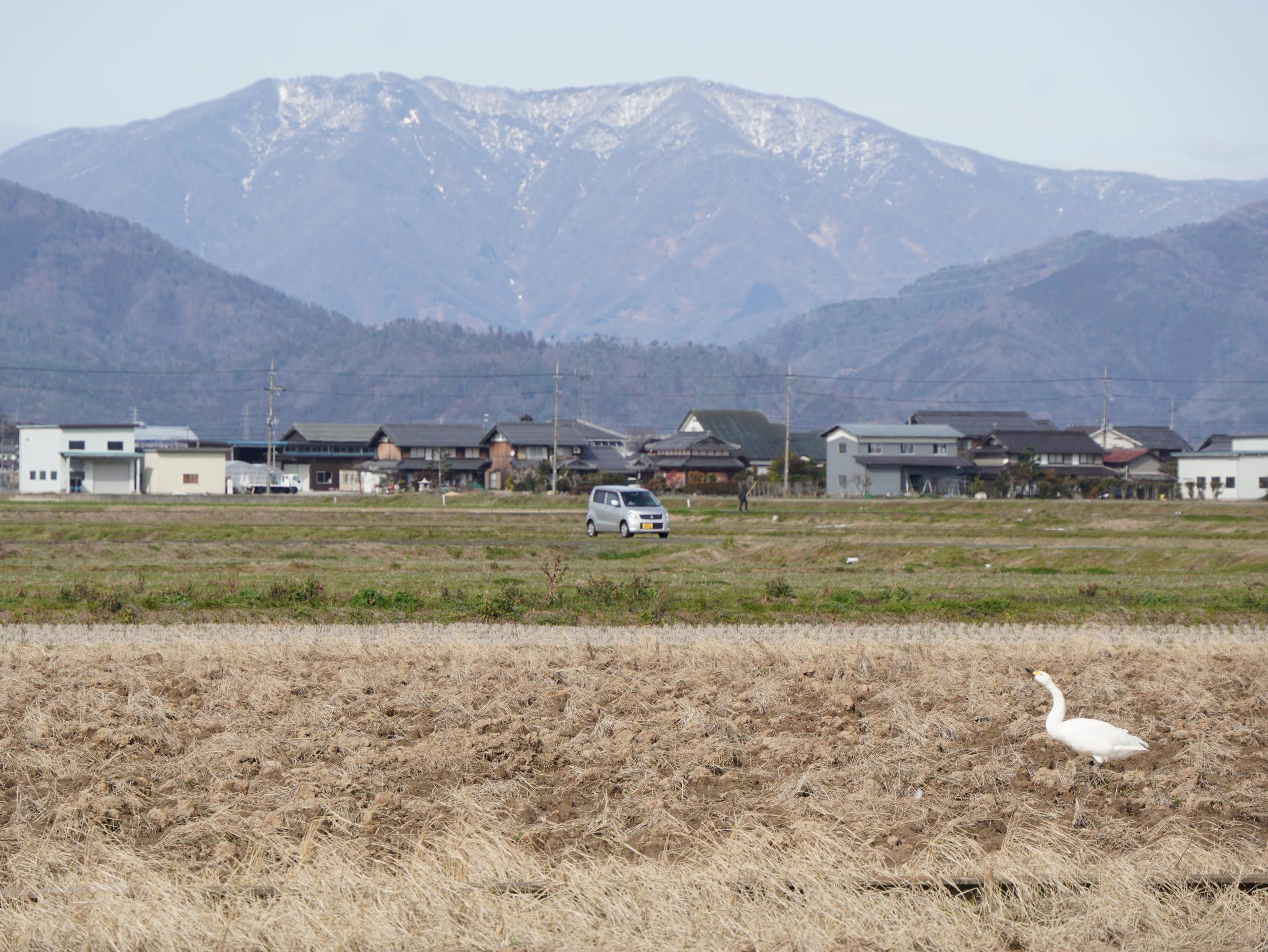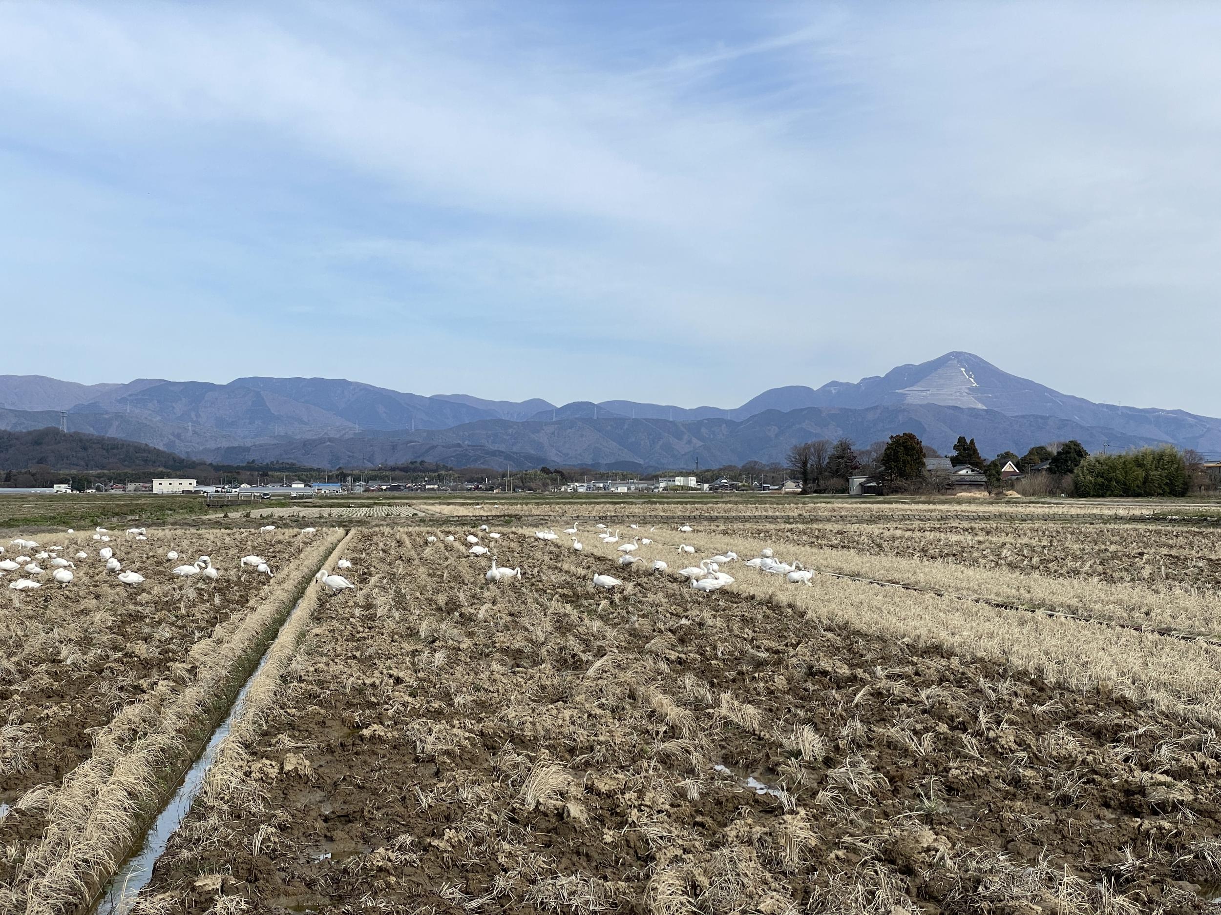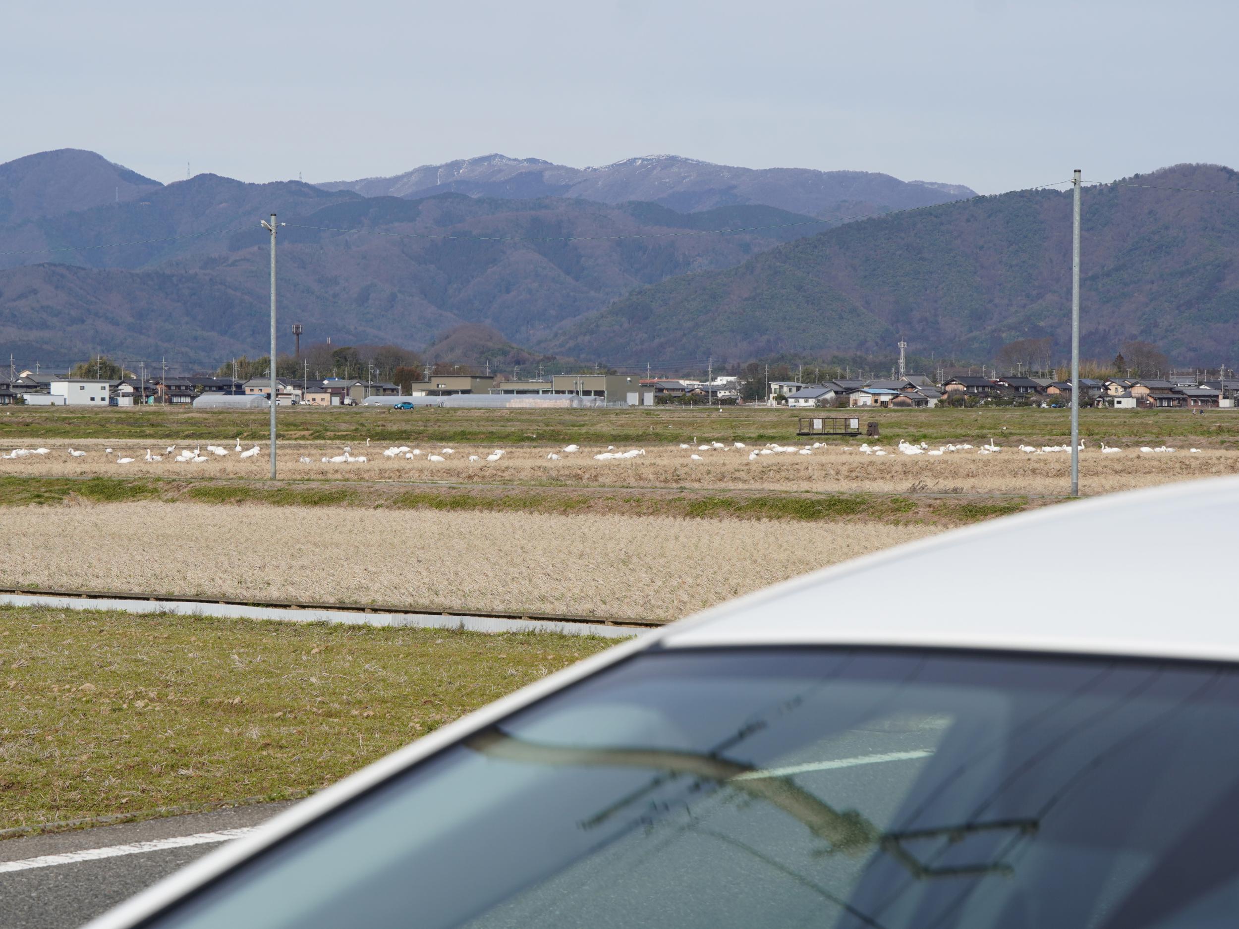 来た道を辿り、2年前の3月にコハクチョウたちと遊んだ高月町宇根辺りで目を凝らして探すも見つからず。上掲のコハクチョウなうマップの青いマーカー周辺も見当たらず、今日はダメかと弱気になったら、その少し南、コハクチョウなうマップの紫色マーカーの辺りで白い点々、漸く漸く会えました。