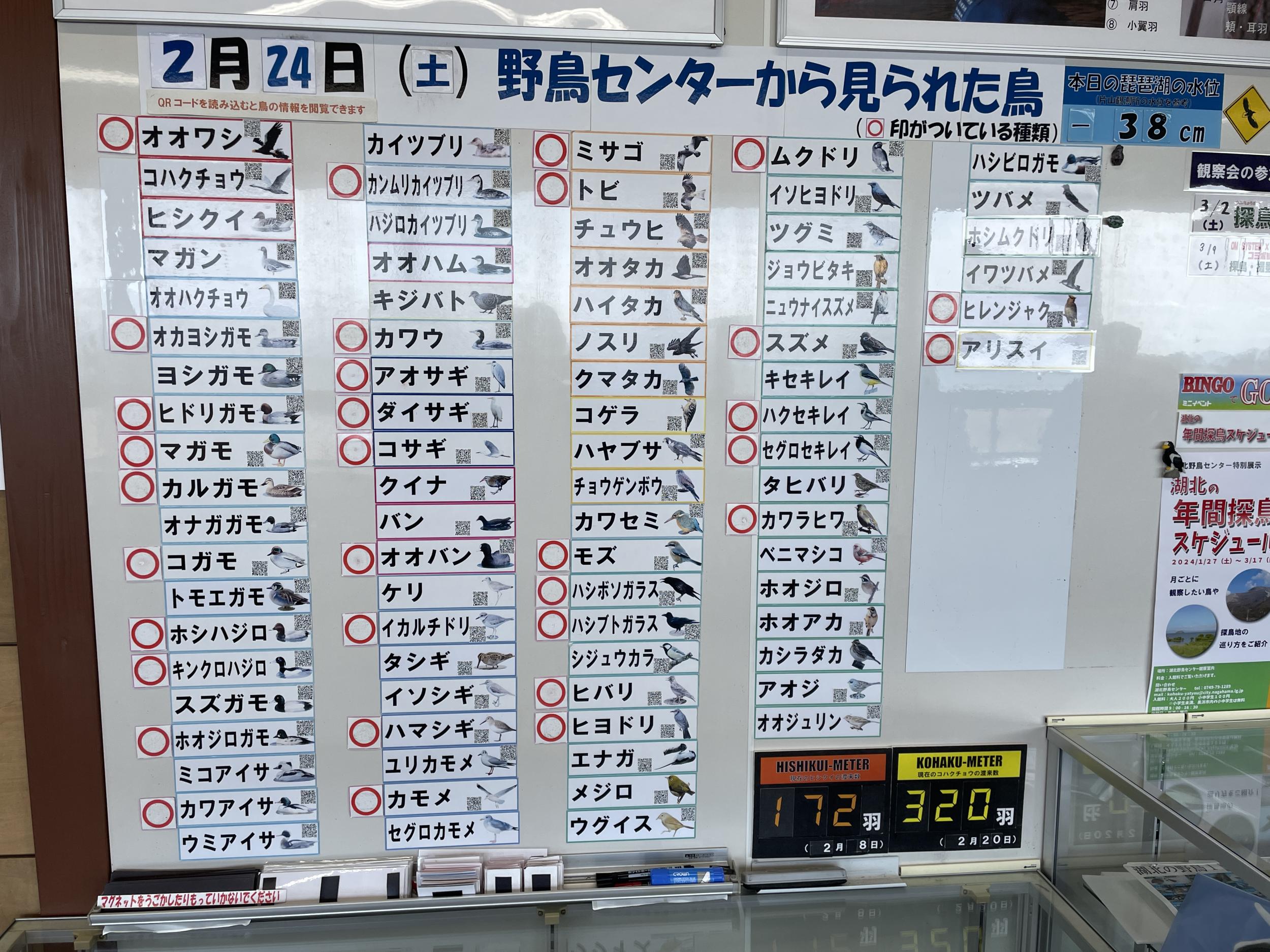 湖北野鳥センターのホワイトボードのコハクチョウに◯印が付いていないのですが、右下のKOHAKUCHO METERには320羽とあります。若い女性レンジャーさんに尋ねてみたところ、コハクチョウたちの塒はセンター前から早崎内湖に移動してしまったとのこと。