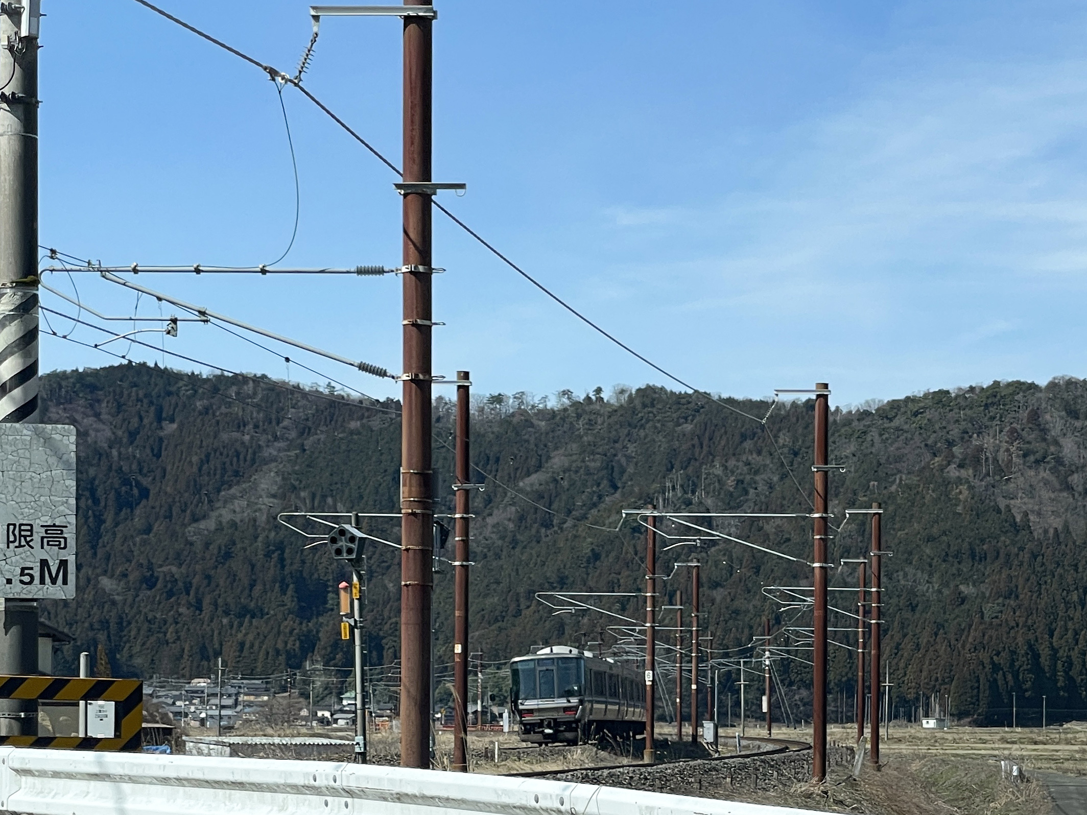 余呉湖口交差点を左折、県道西浅井余呉湖線に入ると踏切が鳴り出し近江塩津行新快速が通過。