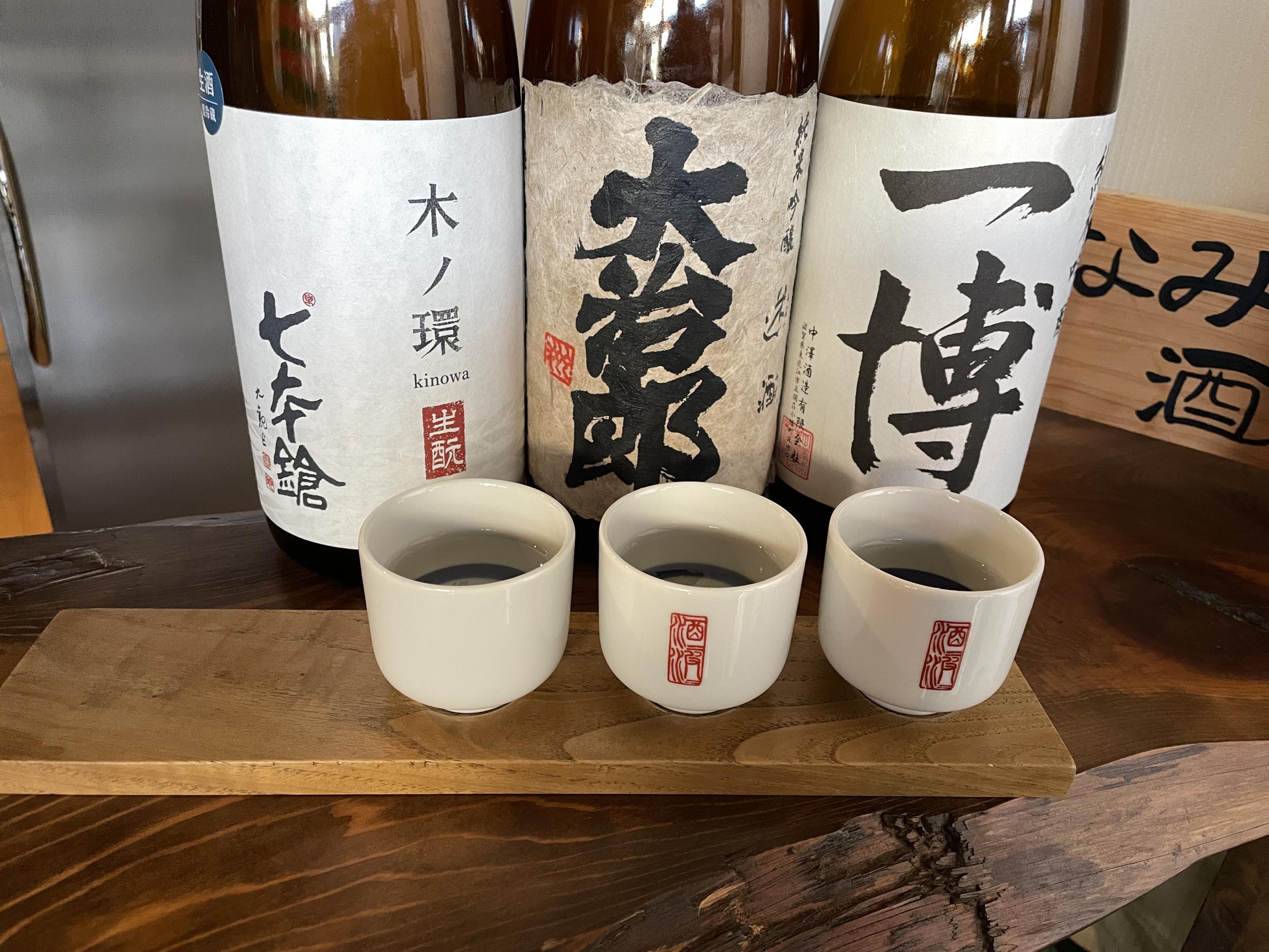 マップに行ってみたいマーカーを付けておいた「さざなみ酒店」、膨大なお酒のコレクションが陳列された一画にこじんまりとした角打ちコーナーがあり、3種類試飲セット。何十種類もある県内外の地酒から3つ選べます。アテは小鮎の甘露煮。