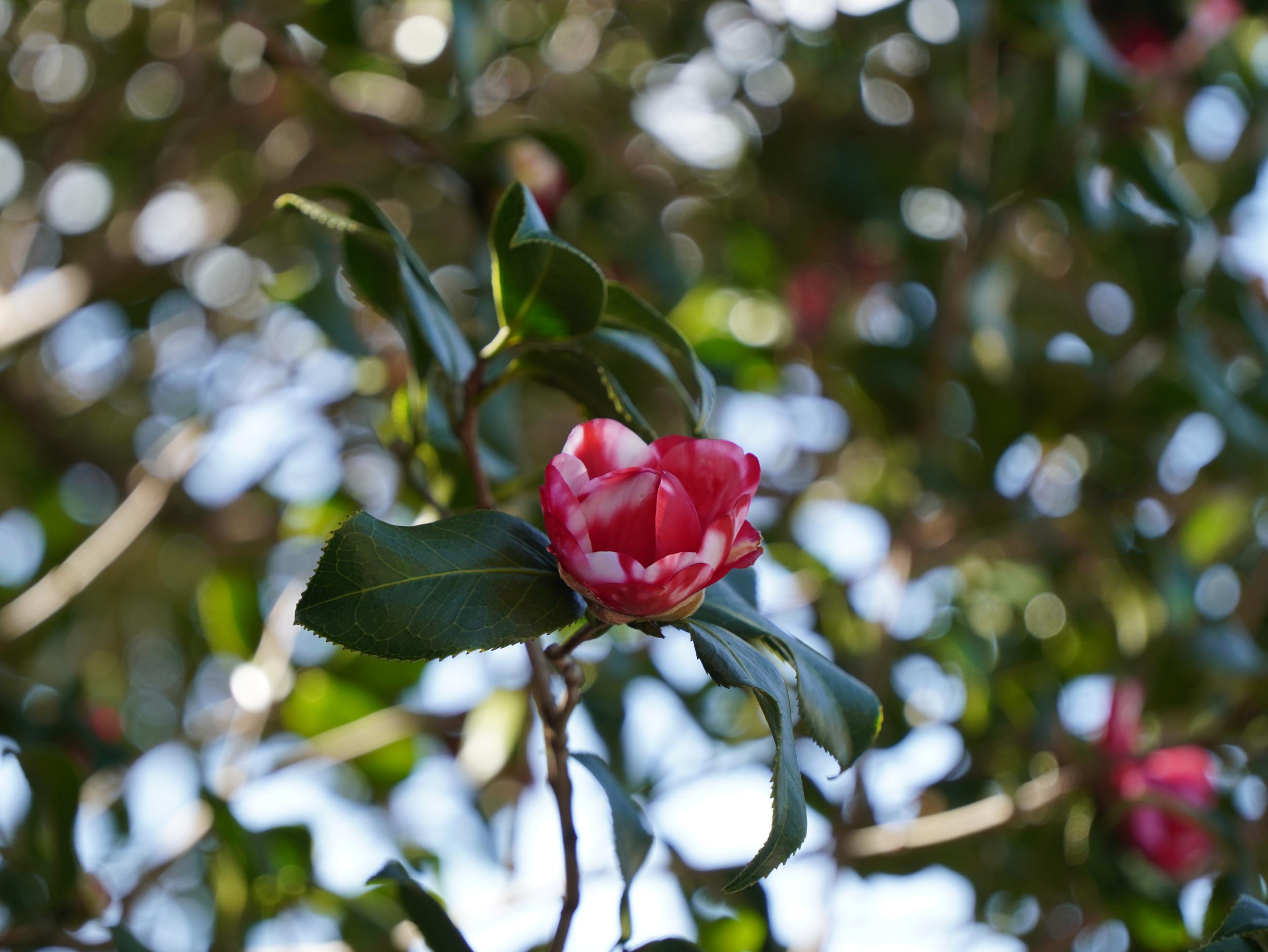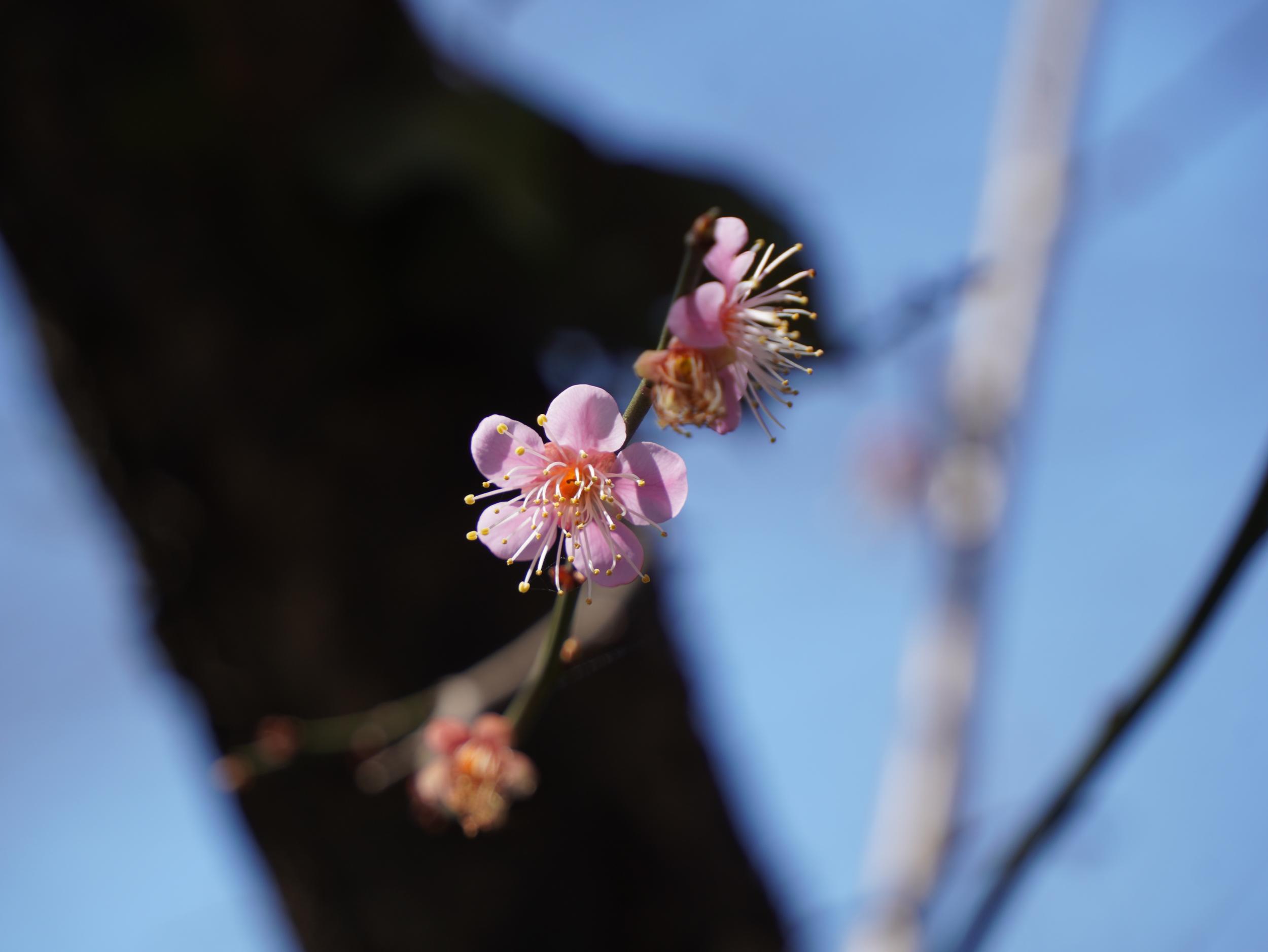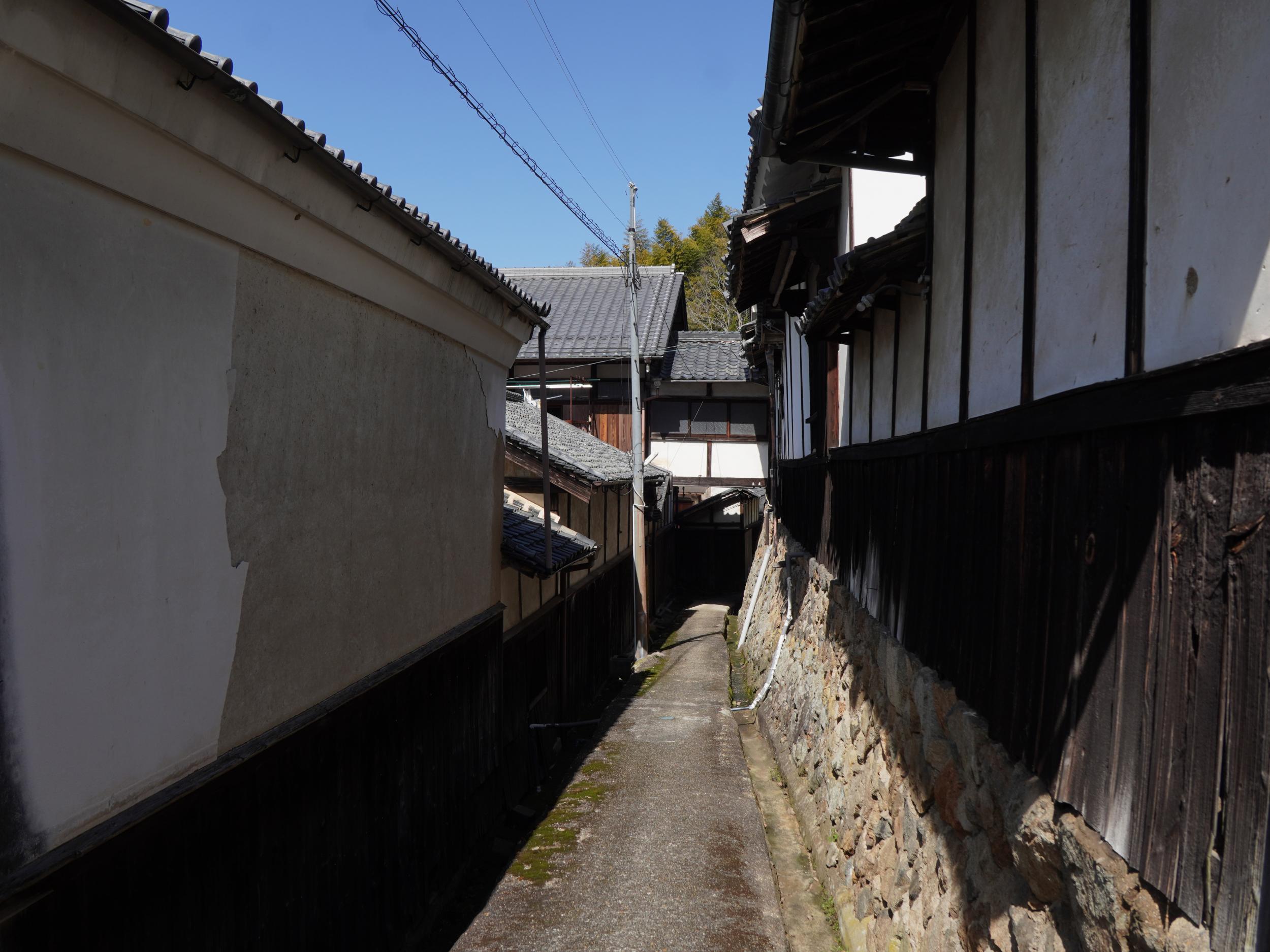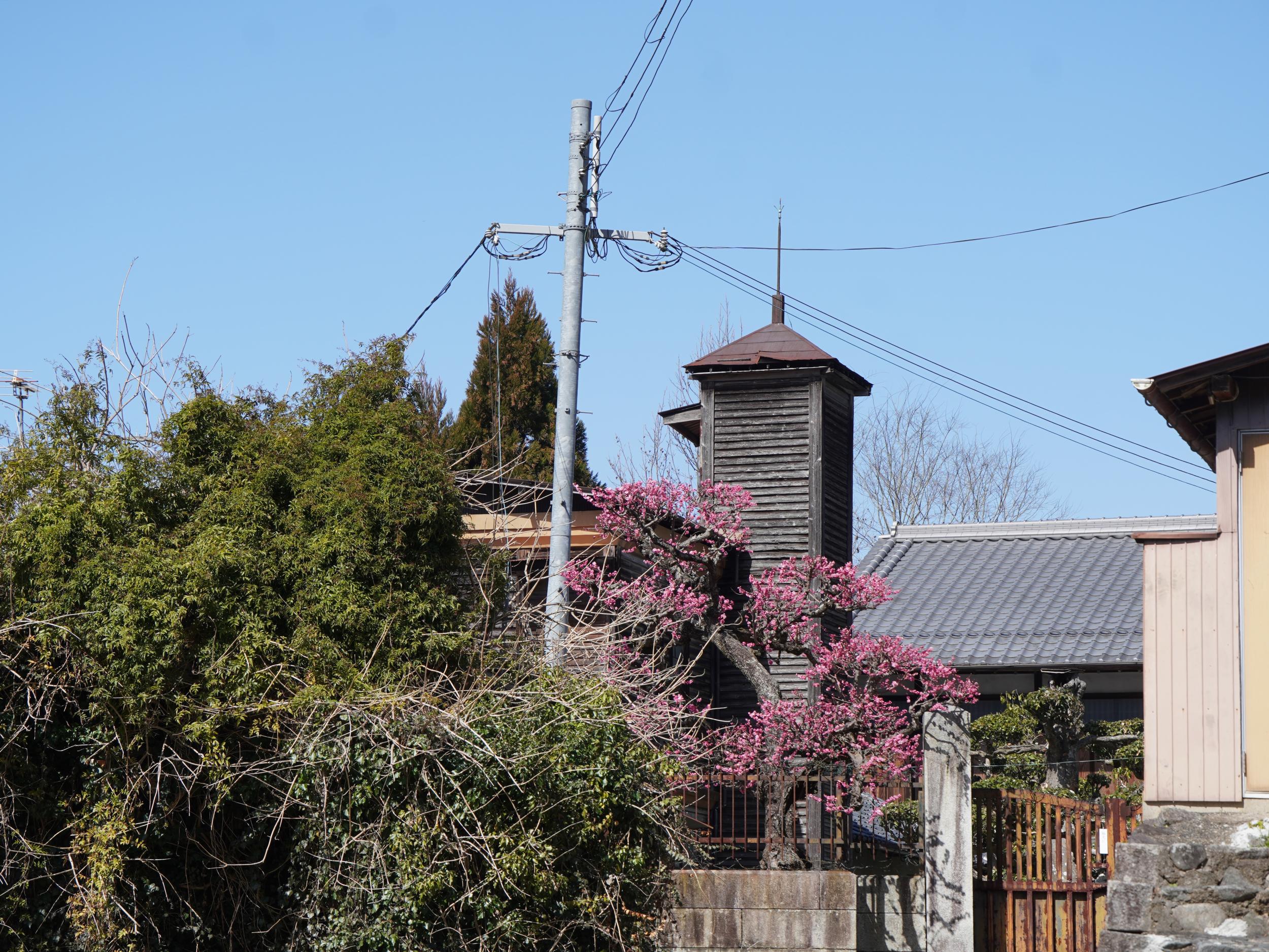 木造の塔のある家の蔵と梅、電柱がちょっと残念。蔵と右手の建物の間に細い道が続いていて、何と右手の建物と左手の建物が渡り廊下で結ばれています。