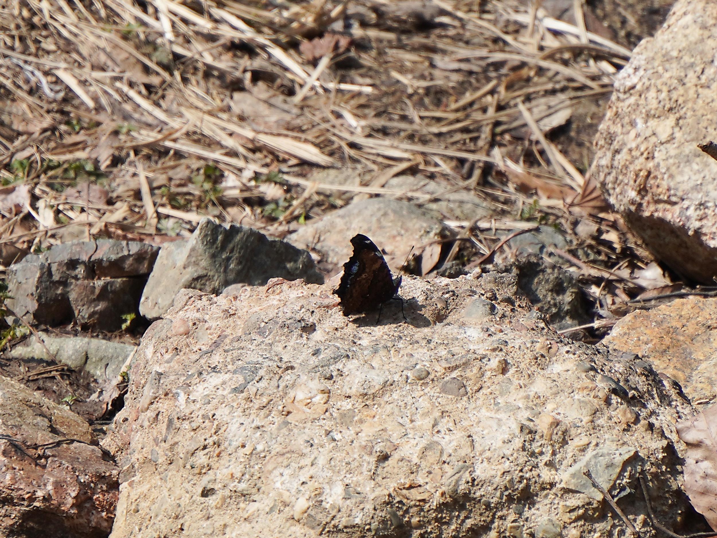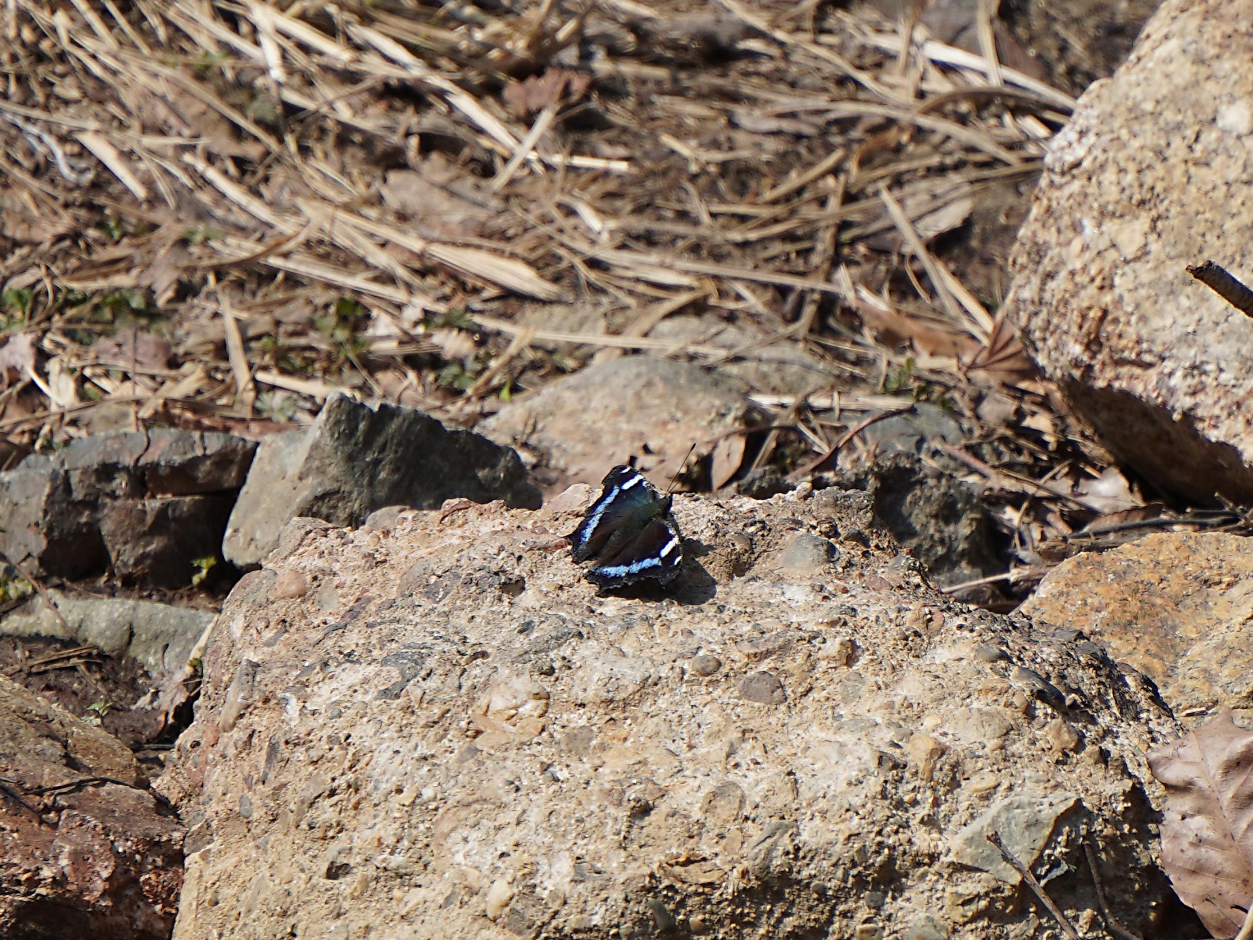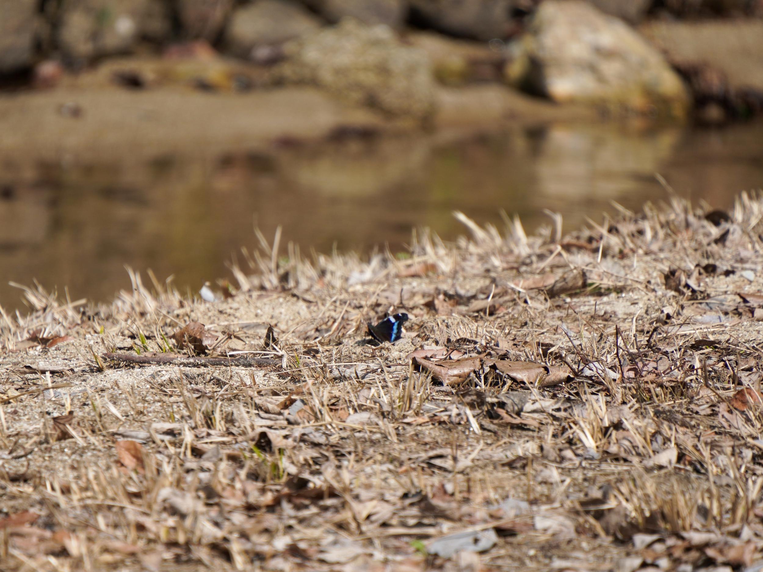 上空を舞う黒い蝶、よく見るとコバルトブルーがチラリ、しばらく目で追いかけていると河原に下りてくれました。やはりルリタテハ。
