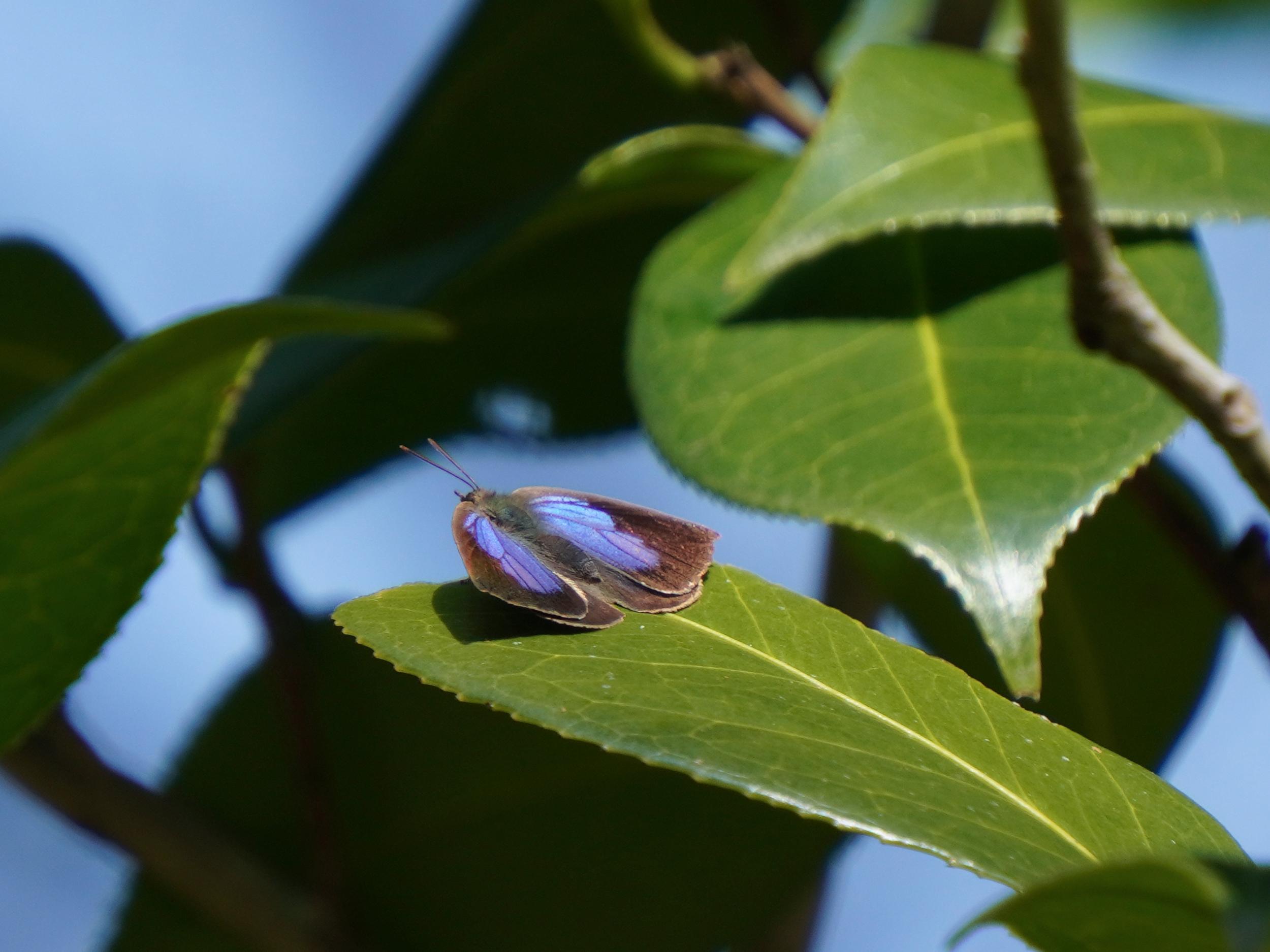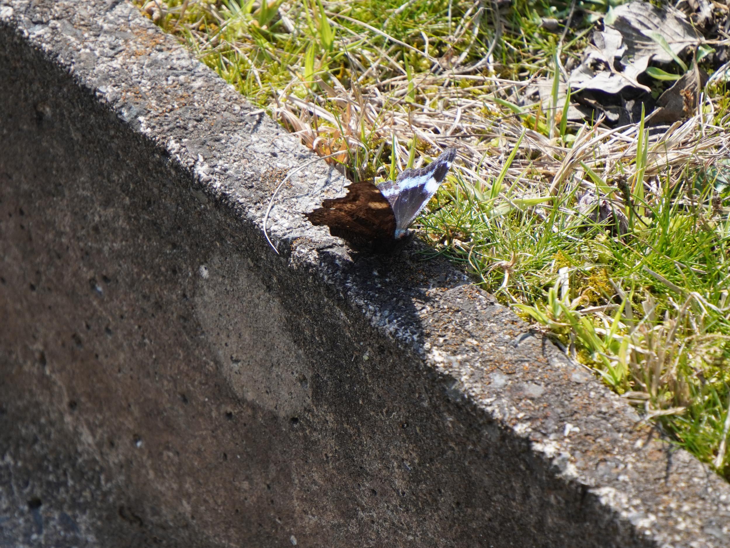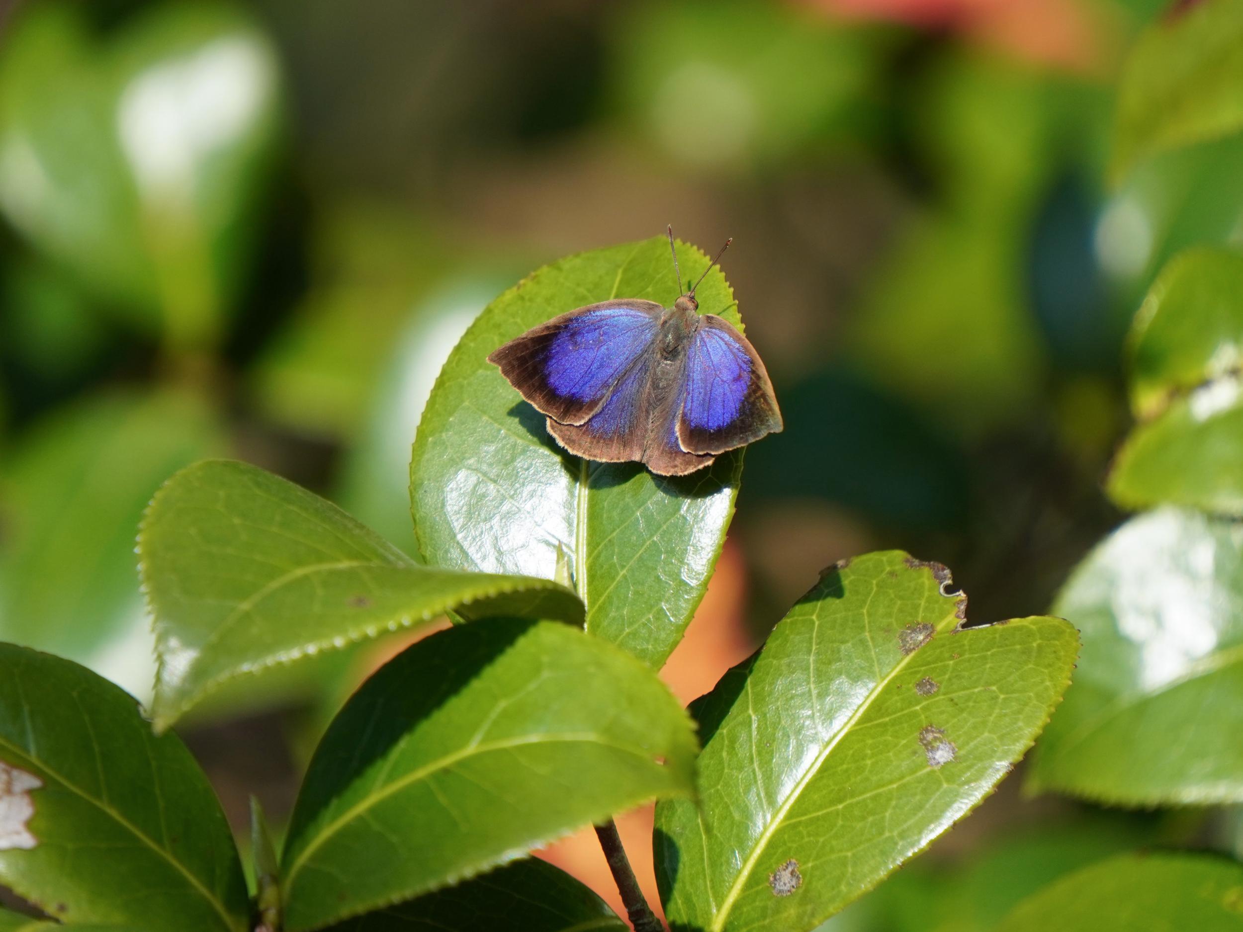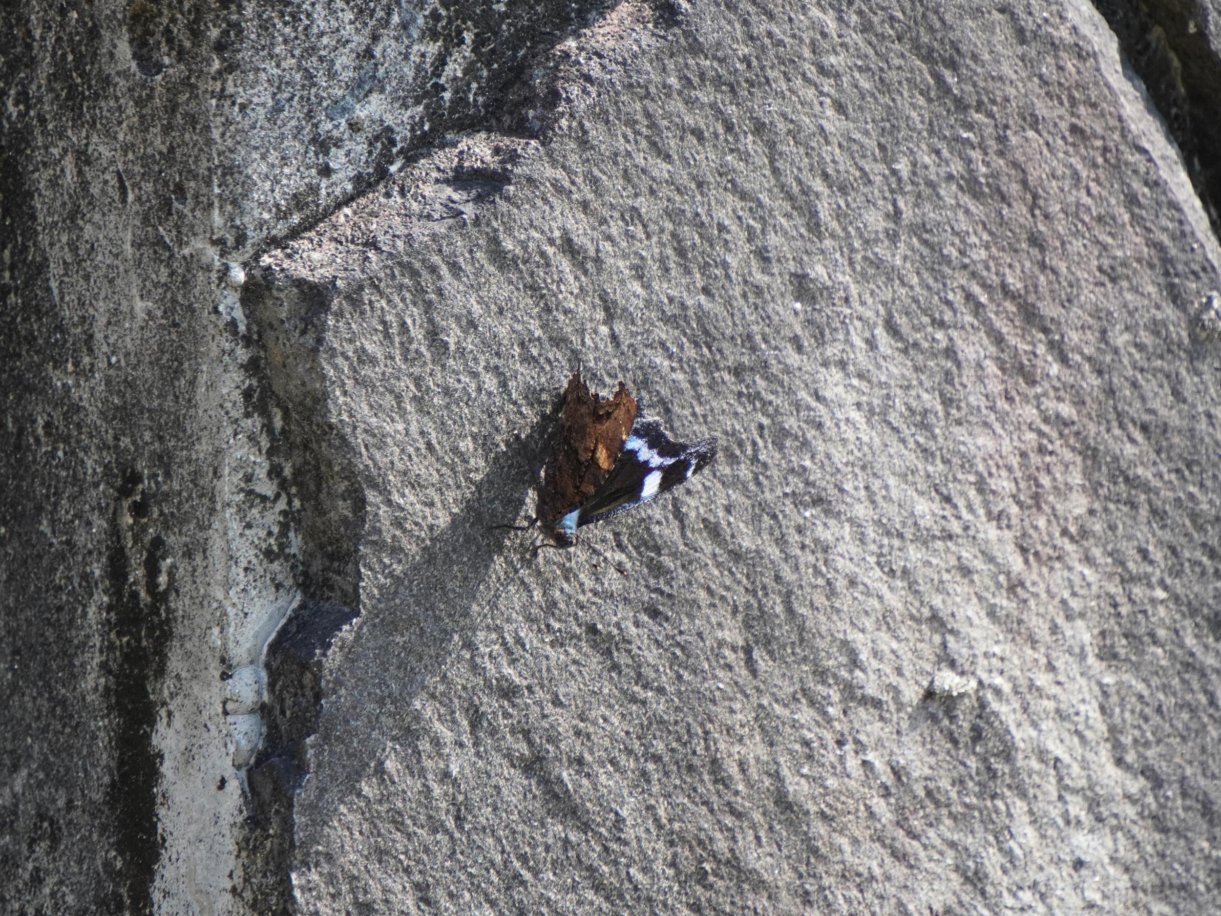 上空を舞う黒い蝶、よく見るとコバルトブルーがチラリ、しばらく目で追いかけていると河原に下りてくれました。やはりルリタテハ。