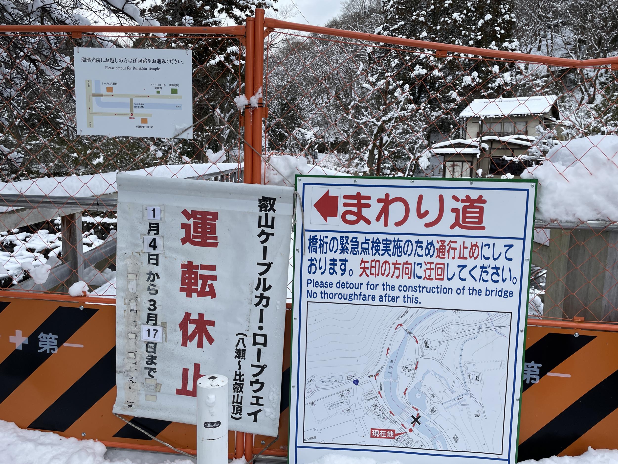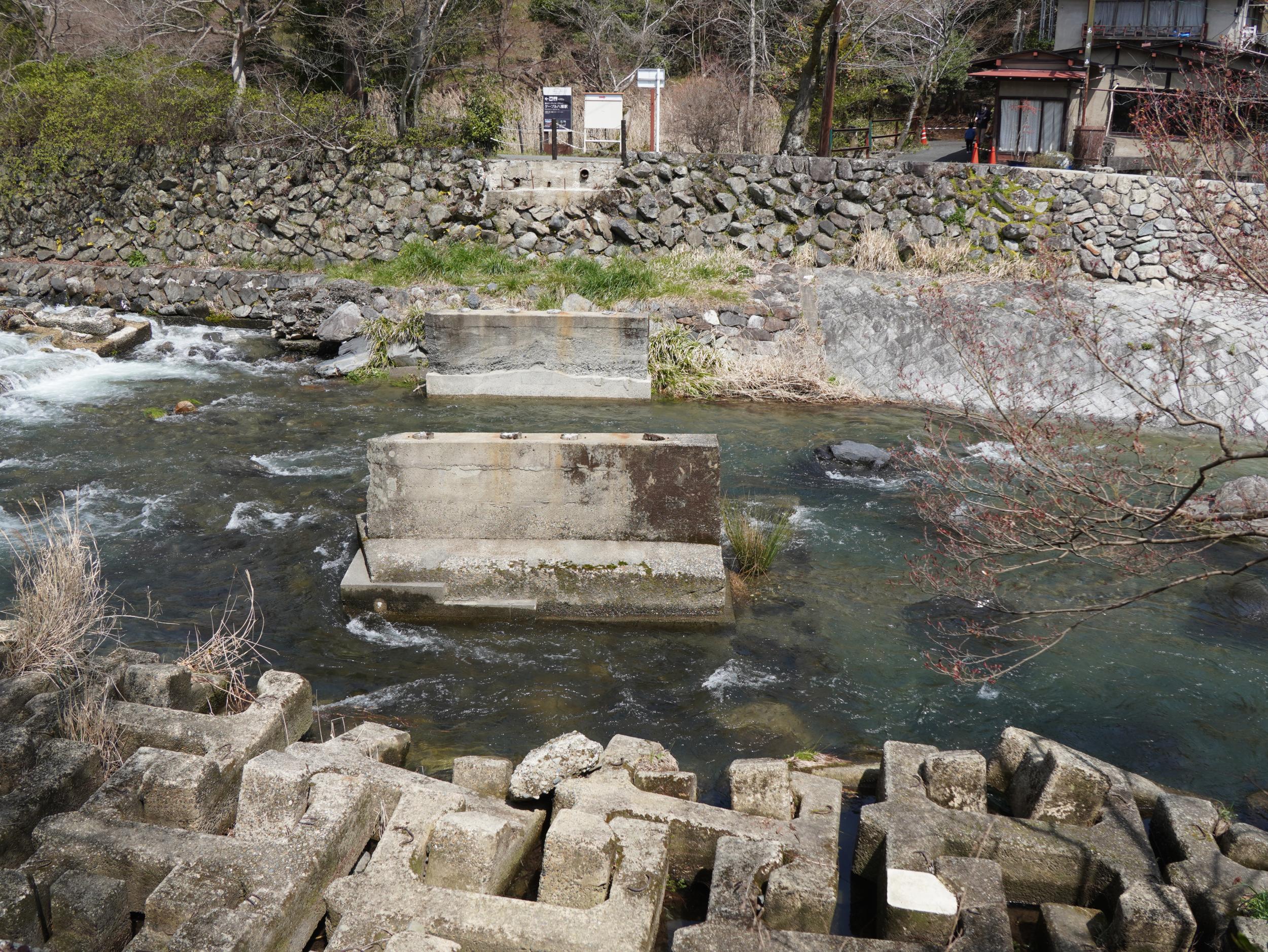 一年前には「橋桁の緊急点検実施のため通行止め」になっていた橋が完全に撤去されていてビックリ、どうやら点検の結果、完全に架替えすることになったようです。ケーブルカーに乗るにはかなり遠回りになります。