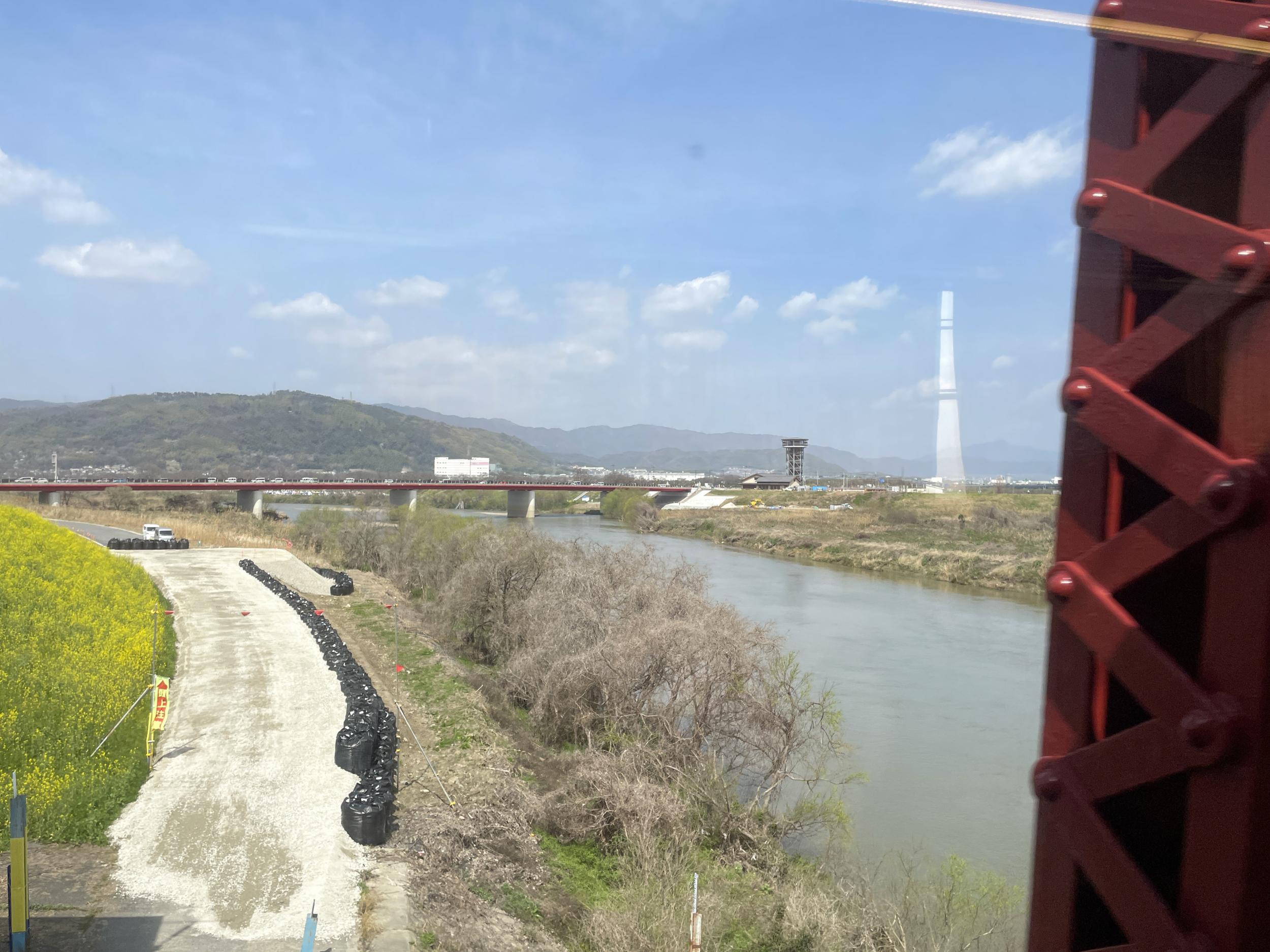 天満橋駅3番線に下りると臨時特急と掲げた6000系、春の行楽シーズンで今日から運行されている臨時特急ですが、やはりロングシートはつまらないので3分後の8000系特急にしました。前回投稿の淀川左岸を自転車を漕いでやって来た木津川の土手には菜の花がいっぱい。