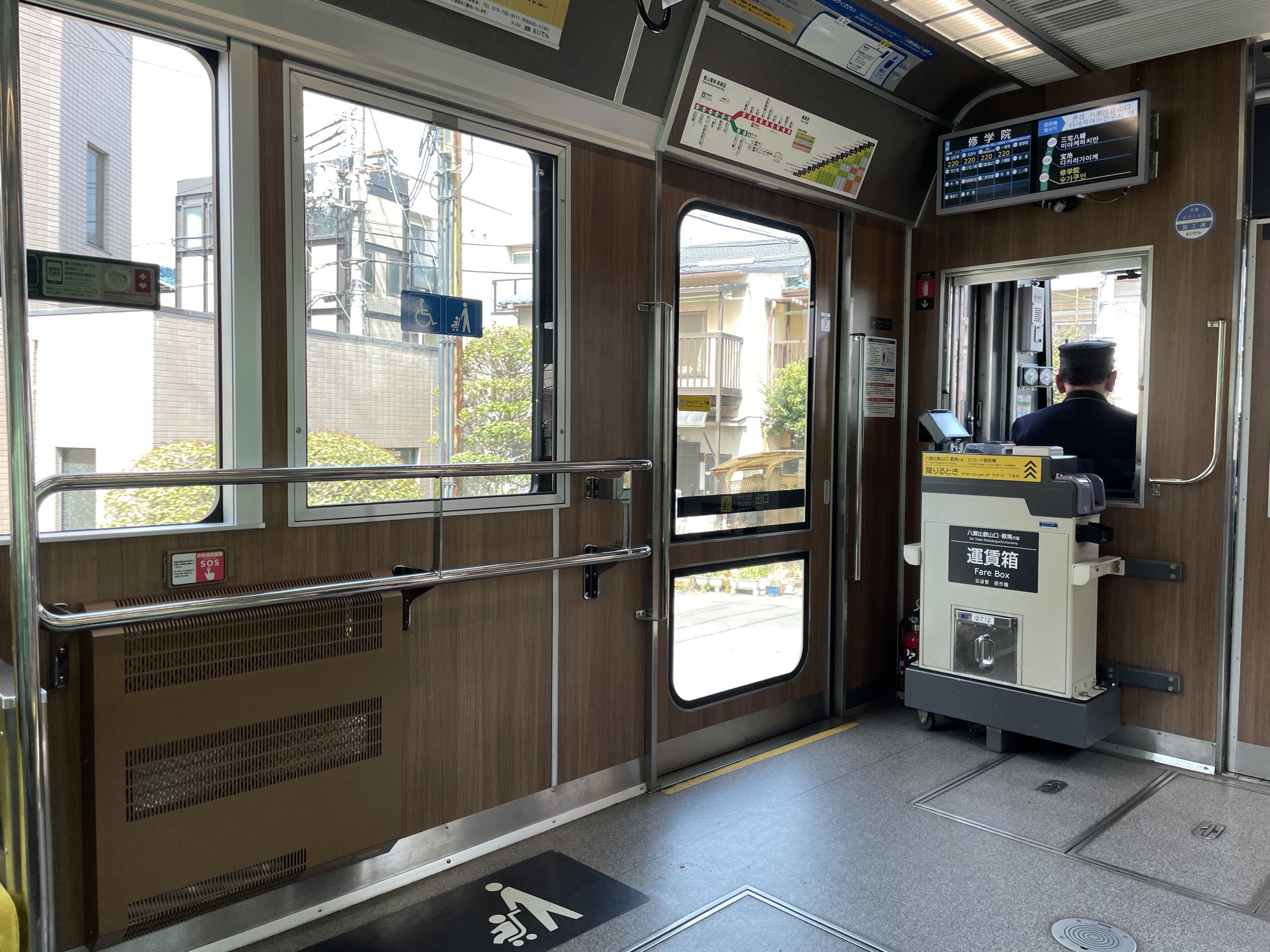 出町柳で乗り換えた叡電700系712、徹底的にリニューアルされた内装は新車レベルです。