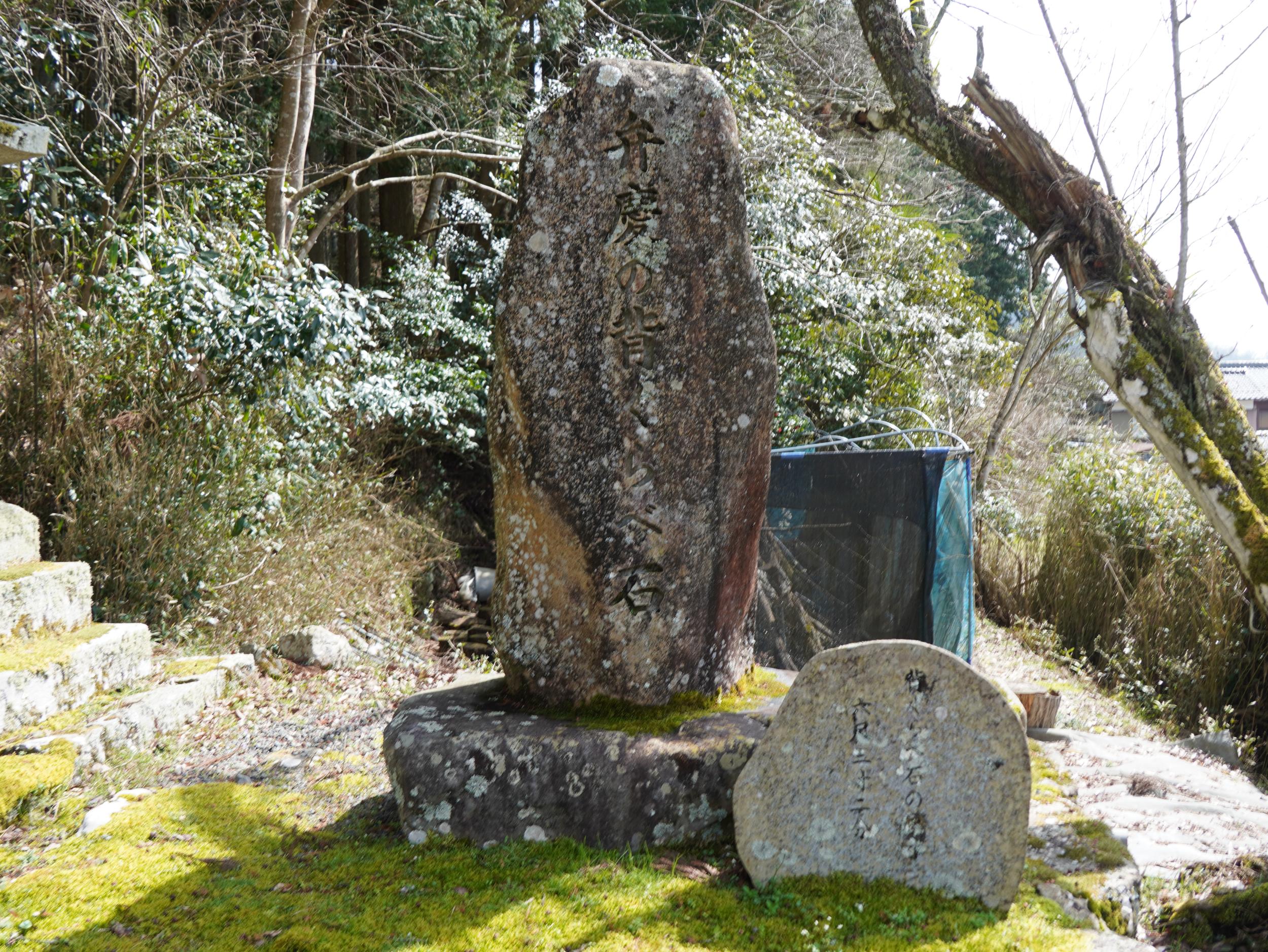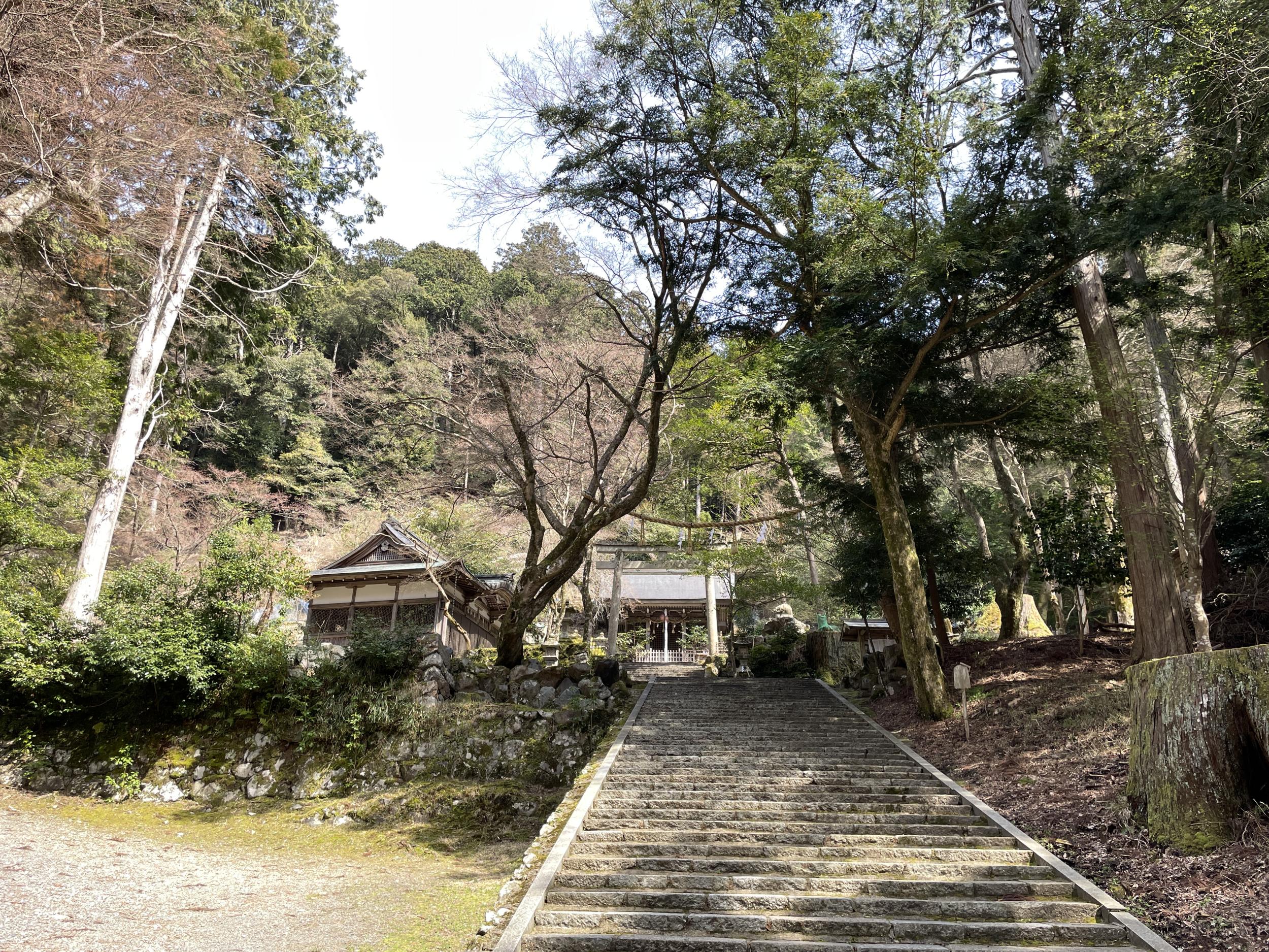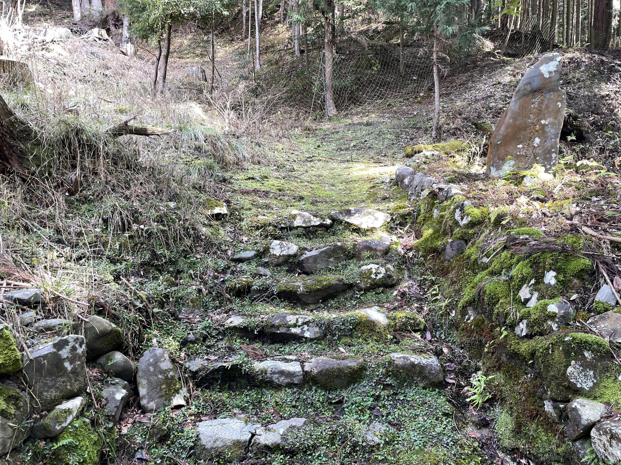 本殿の裏山に続く石段の脇に石碑、「後醍醐天皇御旧跡」と刻まれています。1336年(建武3年、延元元年)、足利尊氏に追われた後醍醐天皇が八瀬の村人に守られこの地を通り比叡山に逃れています。