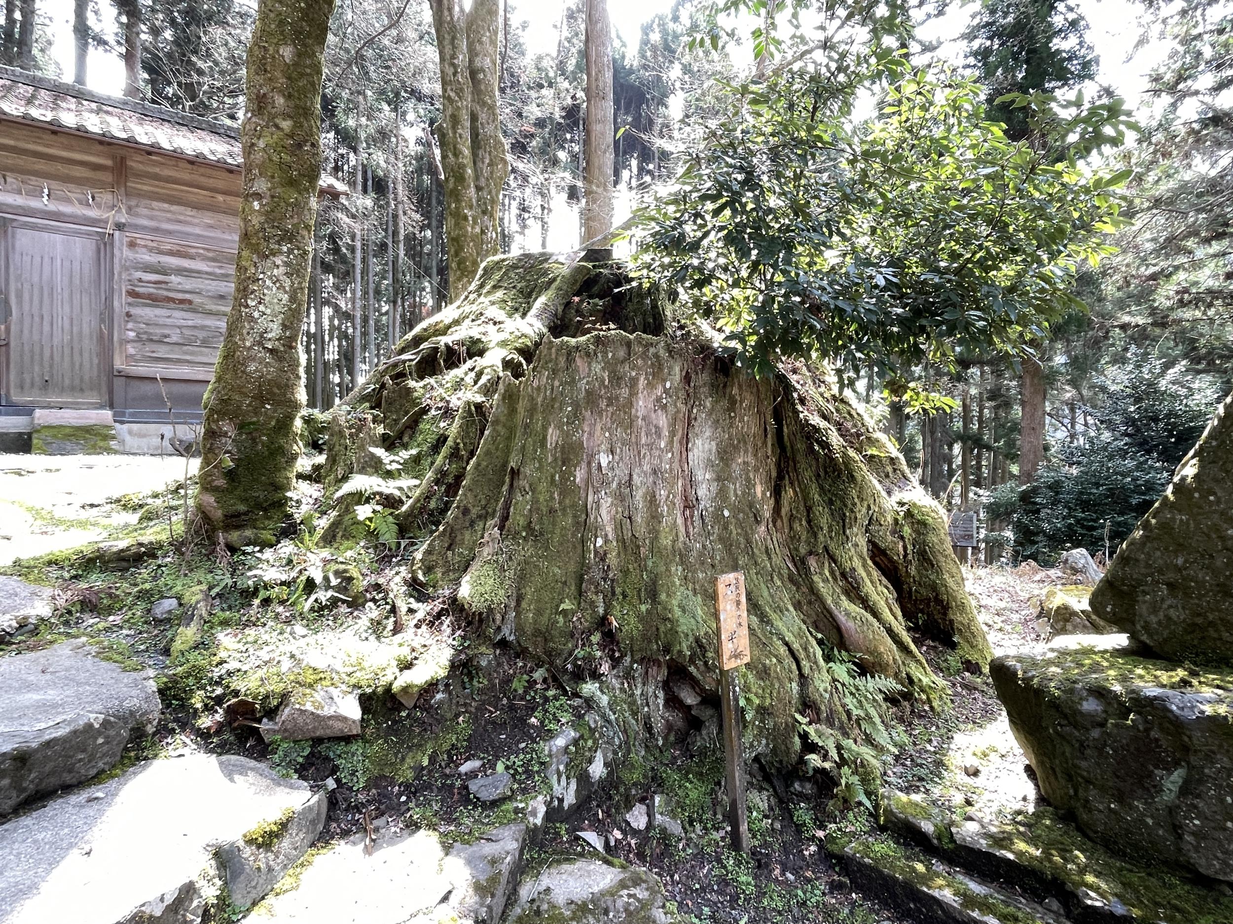 切り株だけの杉の木に「区民の誇りの木」とあります。「花と火の帝」に度々登場する千年杉のことかと思ったのですが、小説ではもっと山の奥にあるような表現なので違うようです。