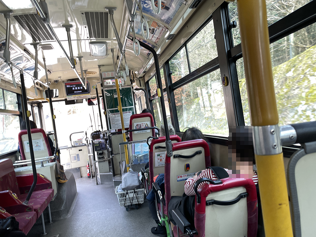土日のバスは1時間に4本あるのですが、13:51のバスは待っても待ってもやって来ず、2時を回って13:51のバスなのか、次の14:02のバスなのか分からないバスに乗り込み狭い谷を進みます。