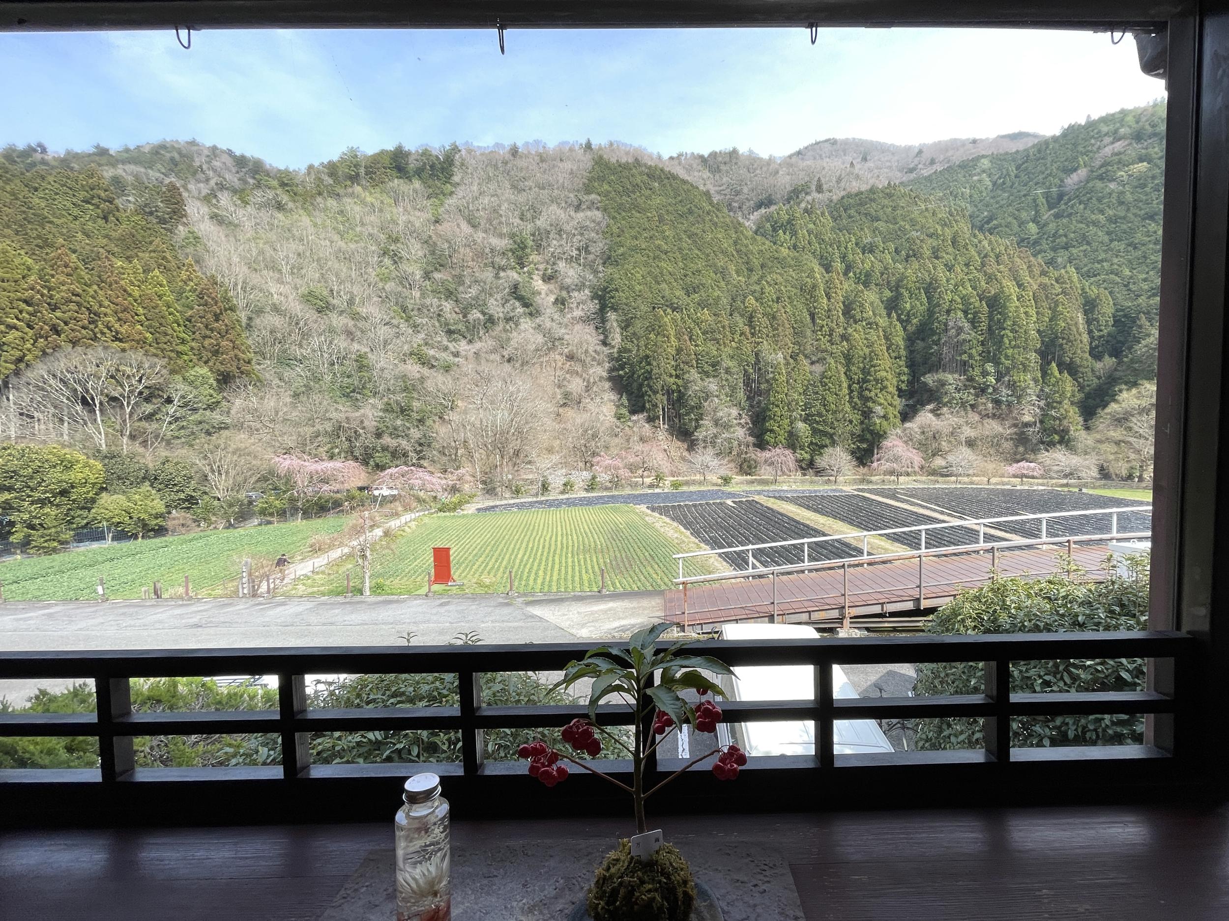 半端な時間だったので窓際の特等席、窓の外に土井志ば漬本舗の農園が広がっています。窓框に置かれた苔に挿されたマンリョウも素敵。