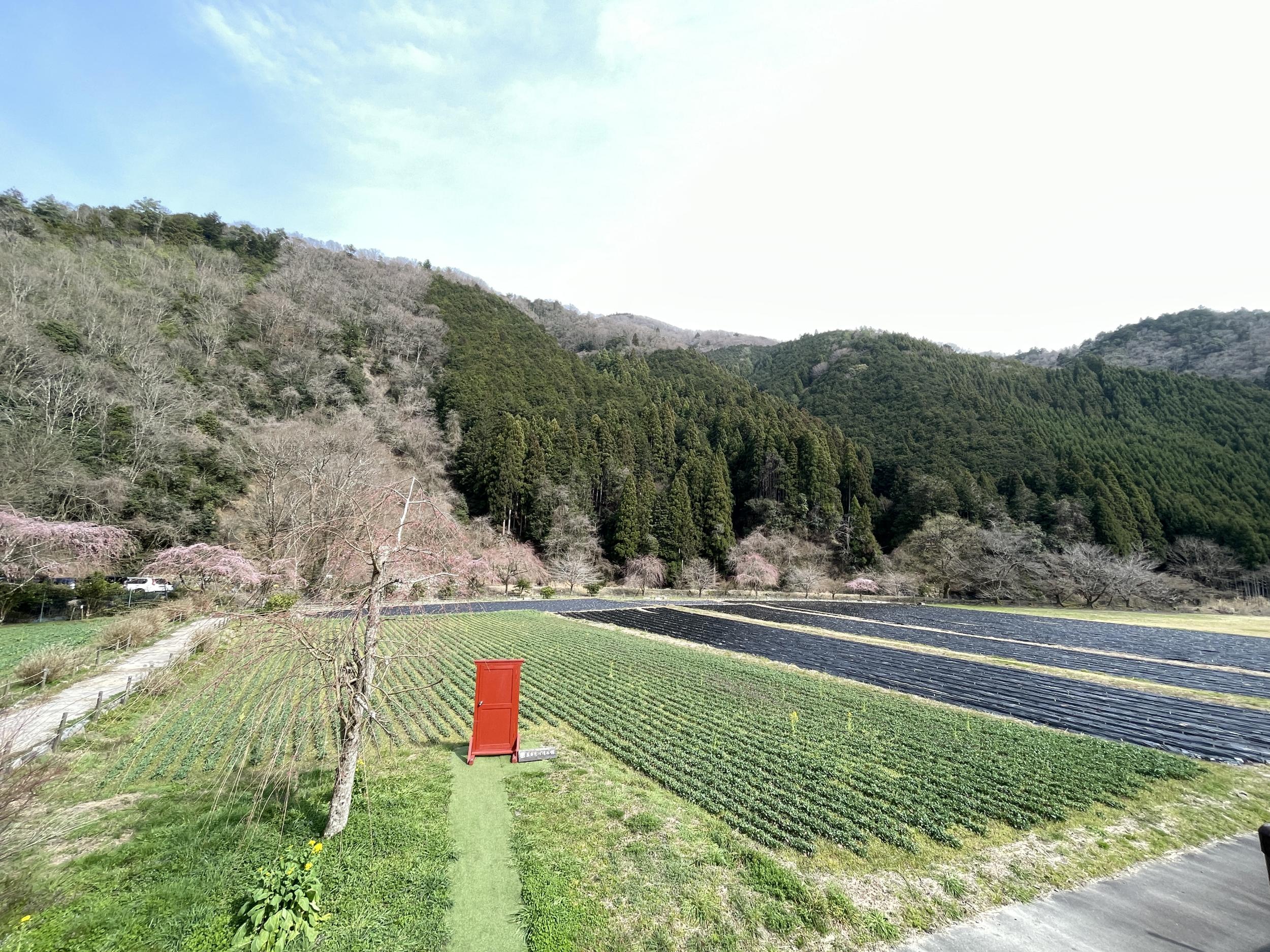 満腹して農園「志季彩の道」を散歩します。記念撮影用のどこでもドアが置かれています。