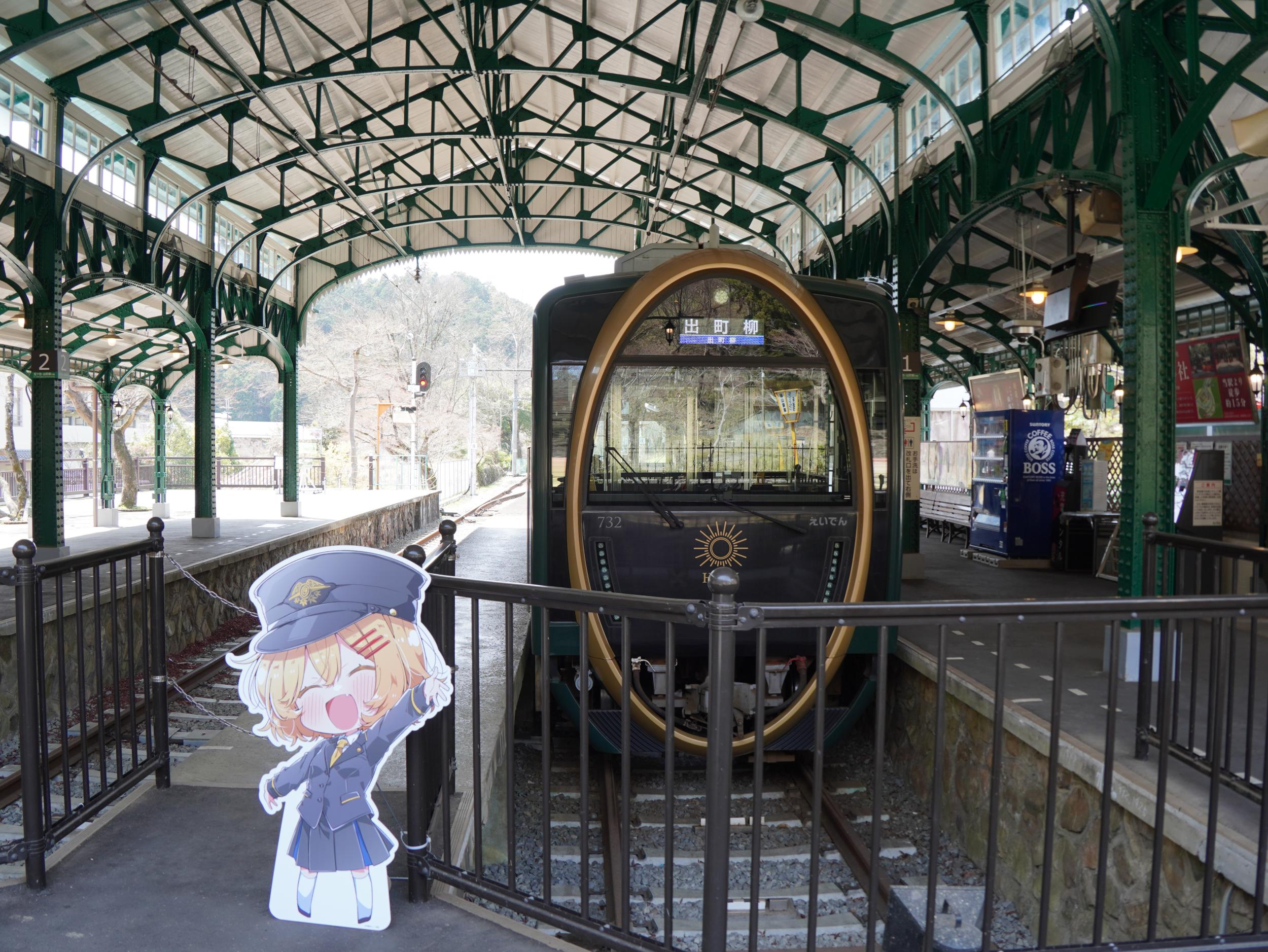 鞍馬行が2両編成、八瀬比叡山口行は単行なので、鞍馬方面が本線ぽいですが、宝ヶ池駅で八瀬比叡山口行は直進、本線であることを誇示しています。