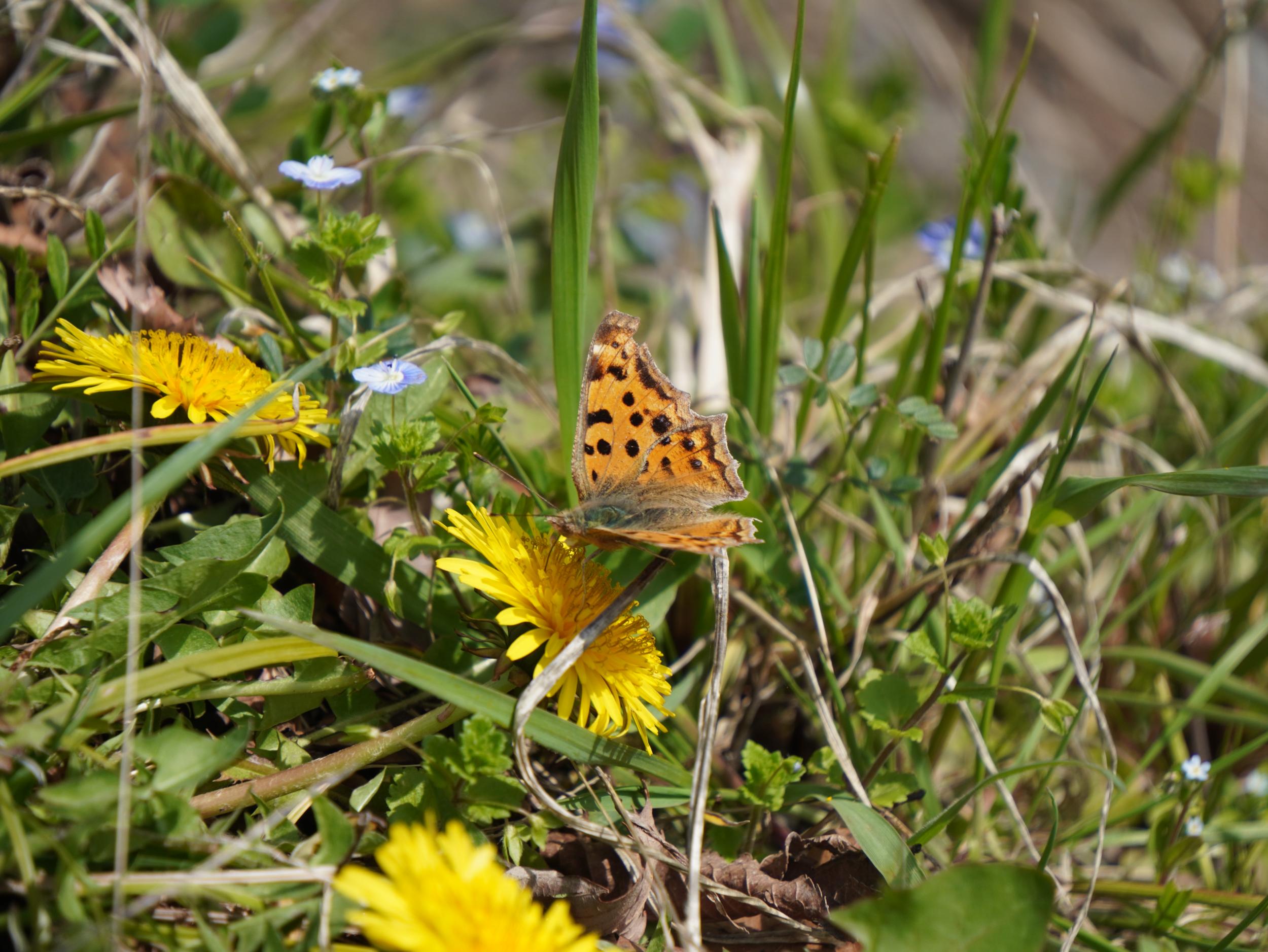 タンポポの蜜を吸ってるキタテハ。