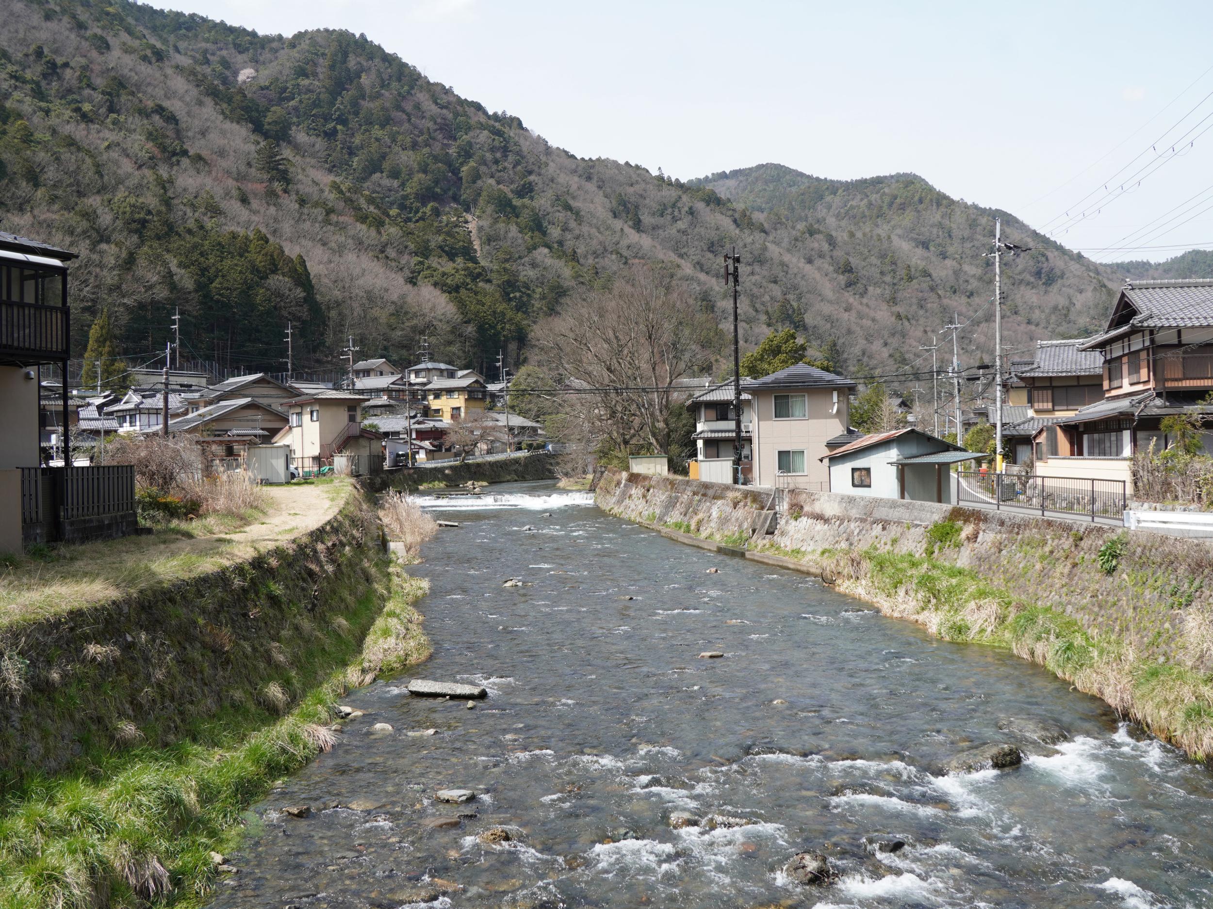 穏やかになった高野川に架かる元井出橋から振り返った八瀬の谷です。