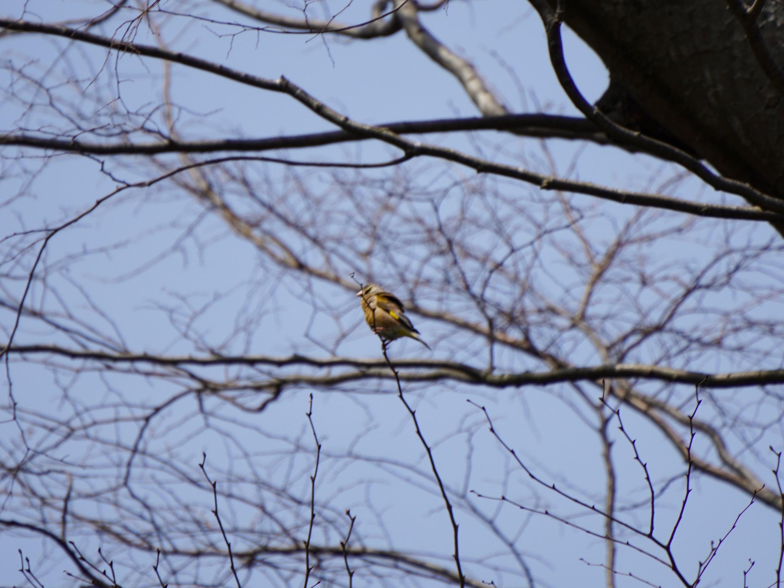 ヤマちゃんが電線から木の枝に移動したと思ったらカワラヒワに変身していました。