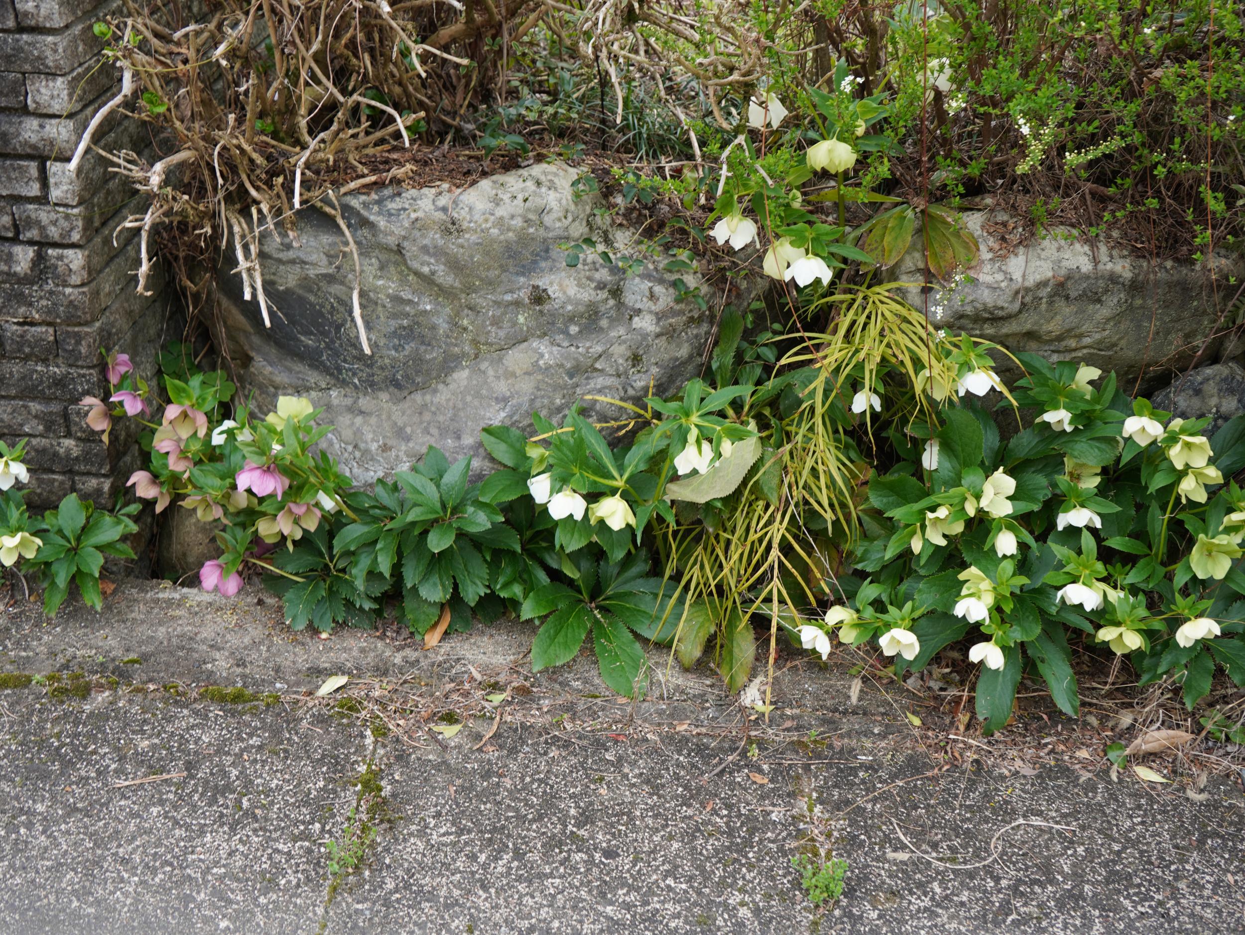 「寂光院、左へ」の道を進みます。クリスマスローズがまだ綺麗。