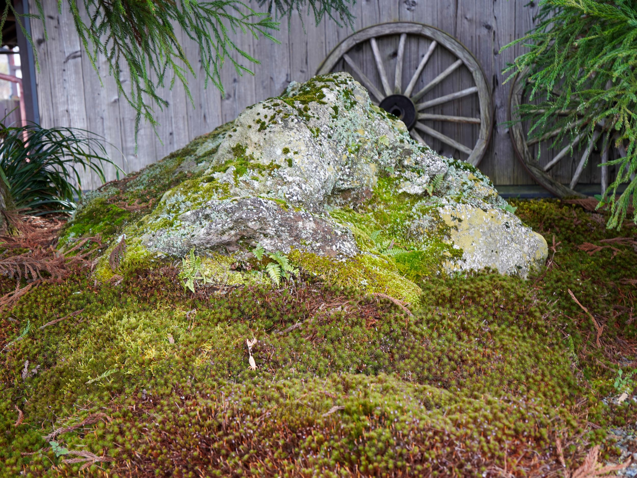民家の石垣の上にスギゴケとハイゴケ、苔に覆われた岩。後ろの車輪は大八車のものでしょうか、牛車かも知れません。