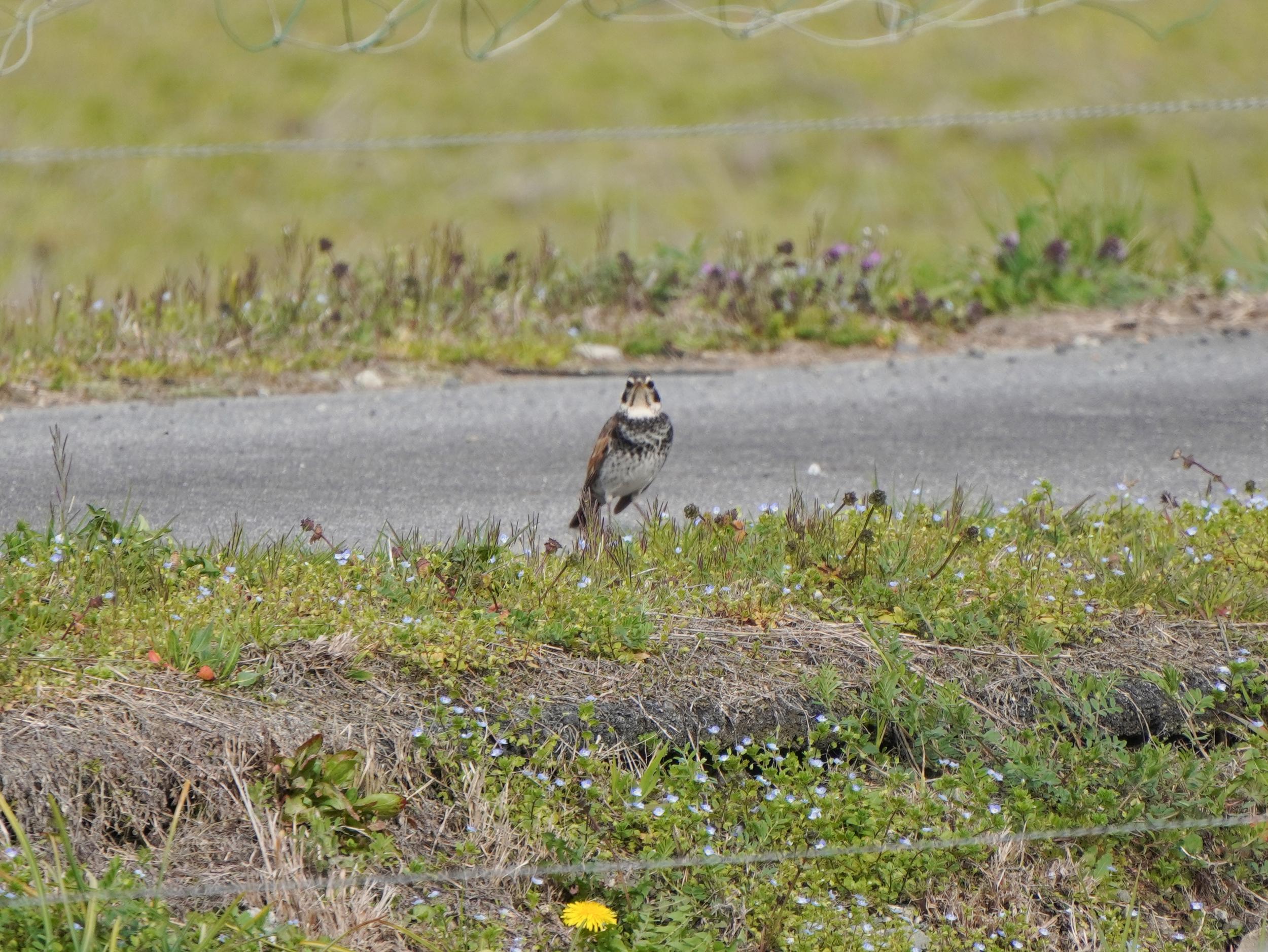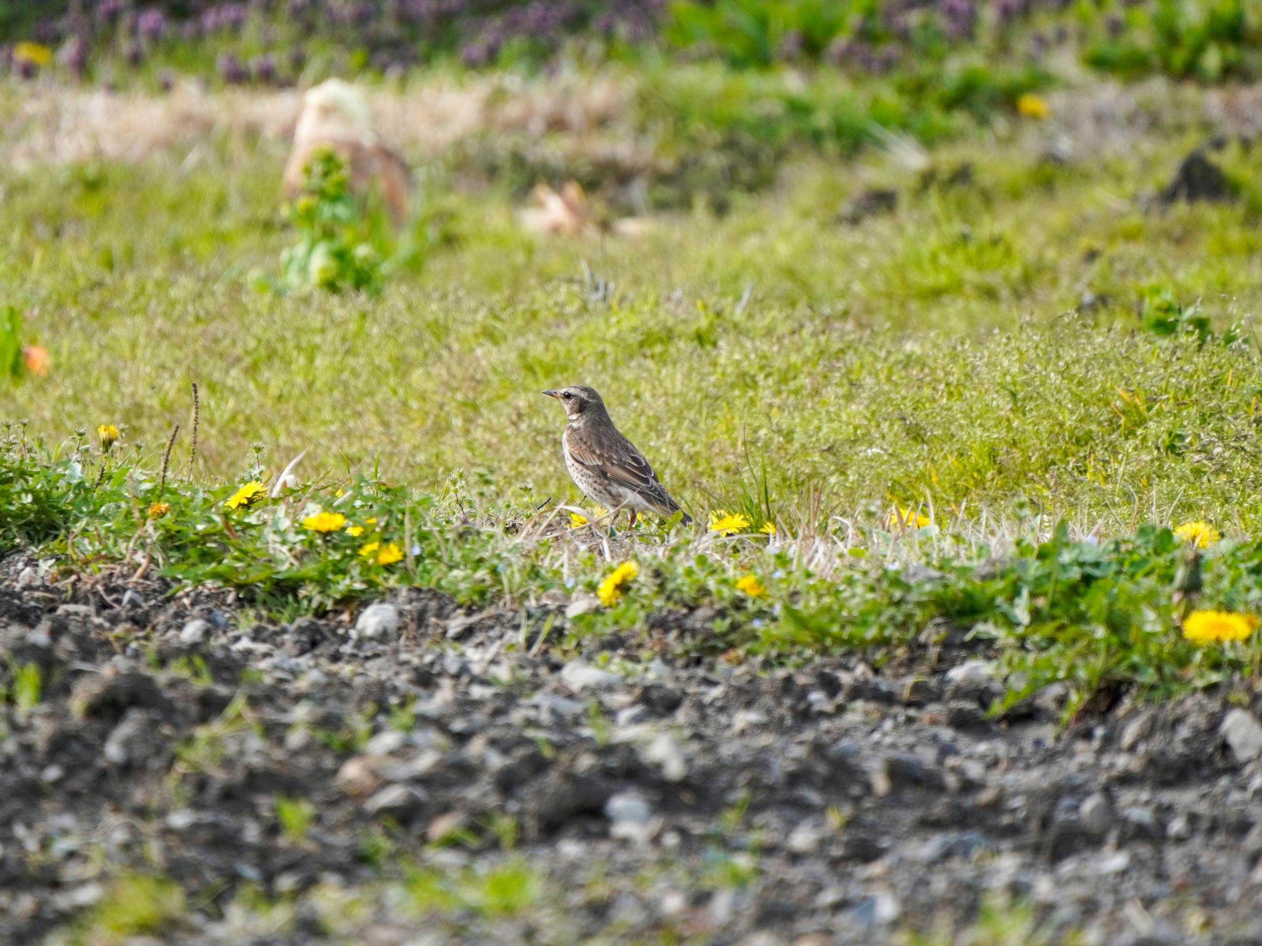 タンポポとツグミ。もうツバメがしきりに空を舞っているのでツグミたちは急いで南の国へ渡らなければならないはずですがまだのんびりモードです。