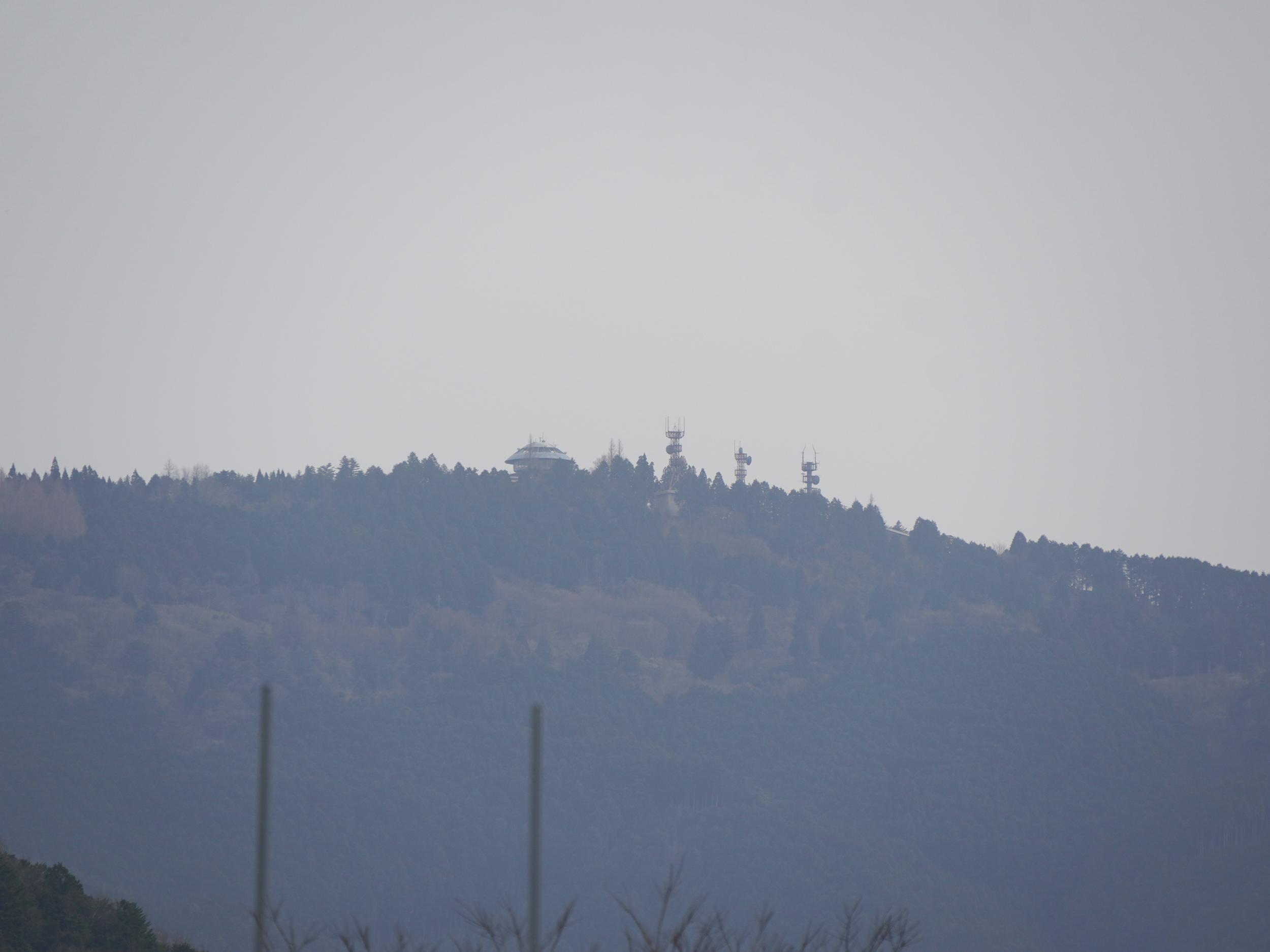 菜の花畑の向こうにぽっこり見えるのは蓬莱山1174m、振り返ると比叡山頂の展望台が見えます。