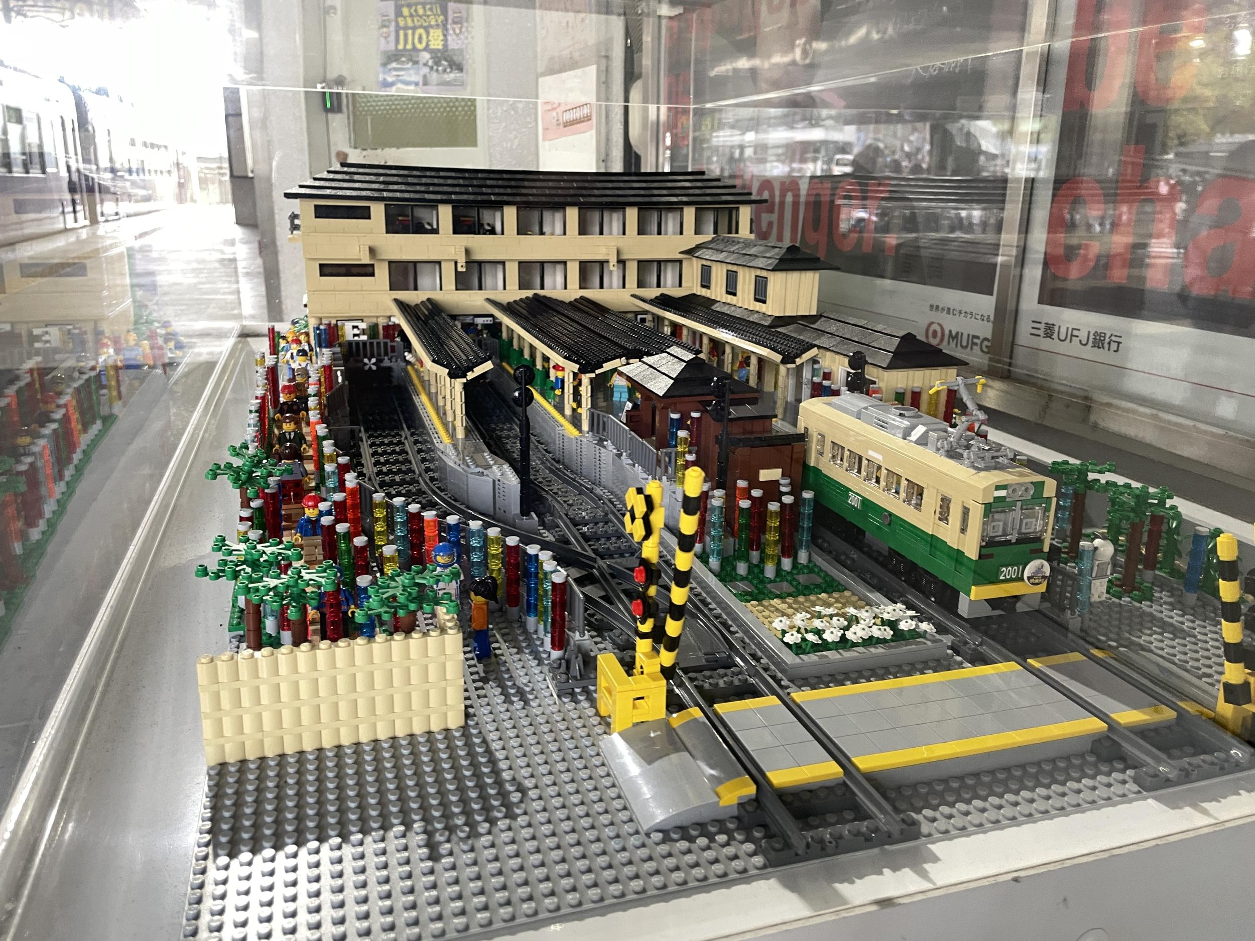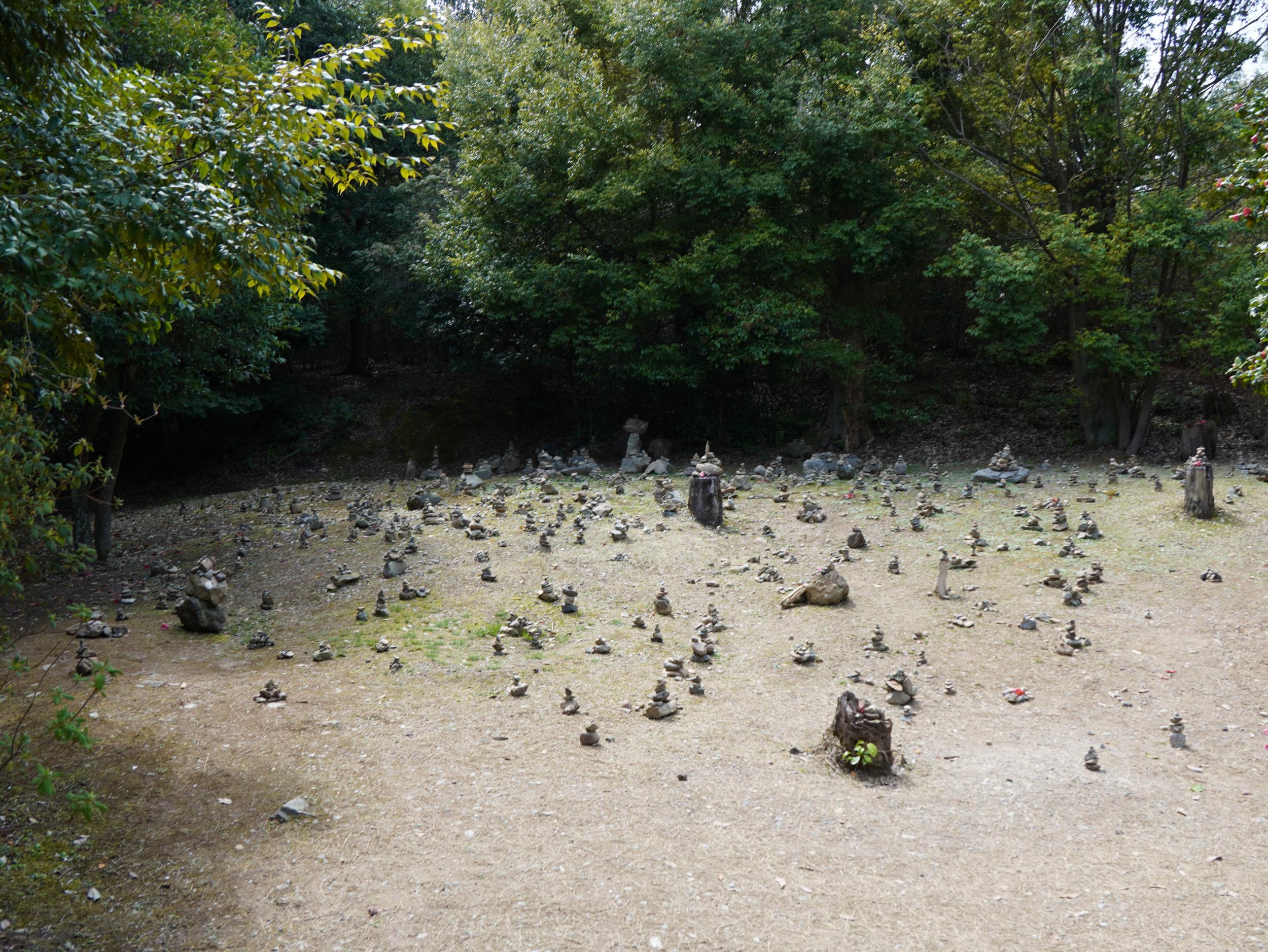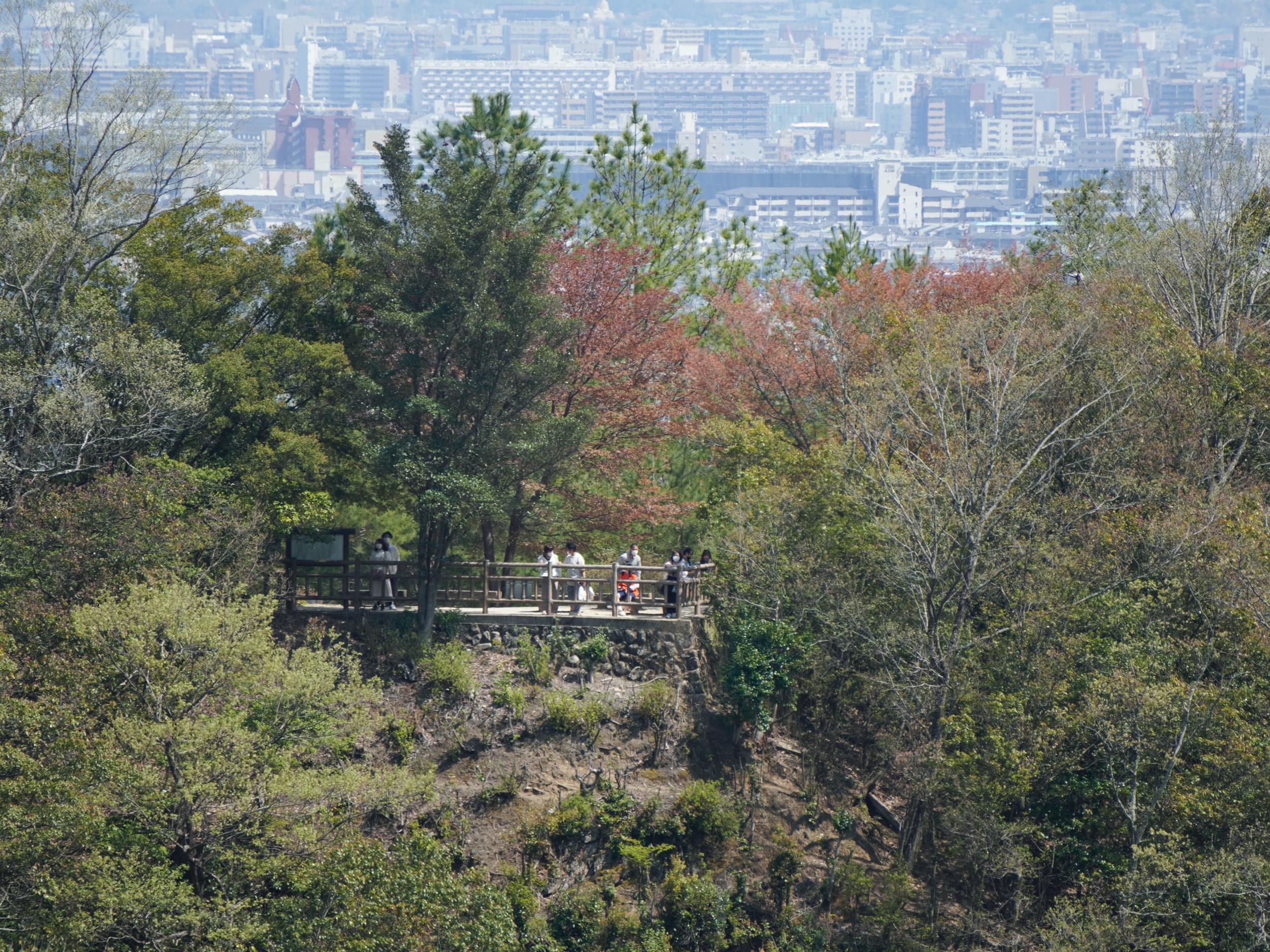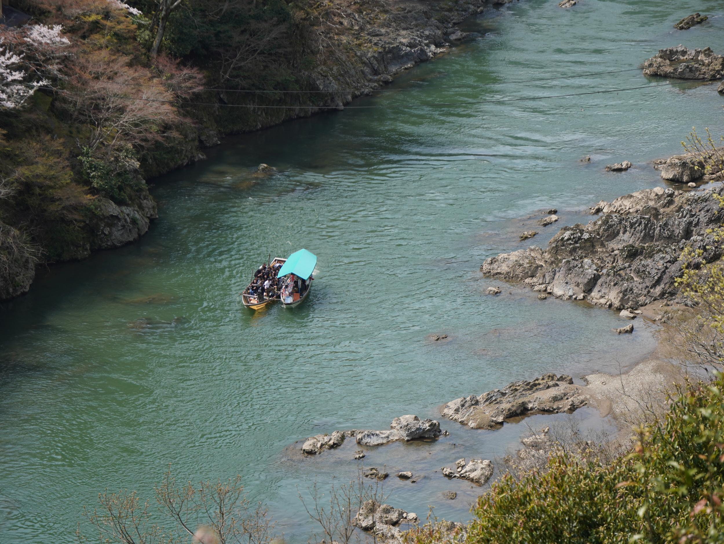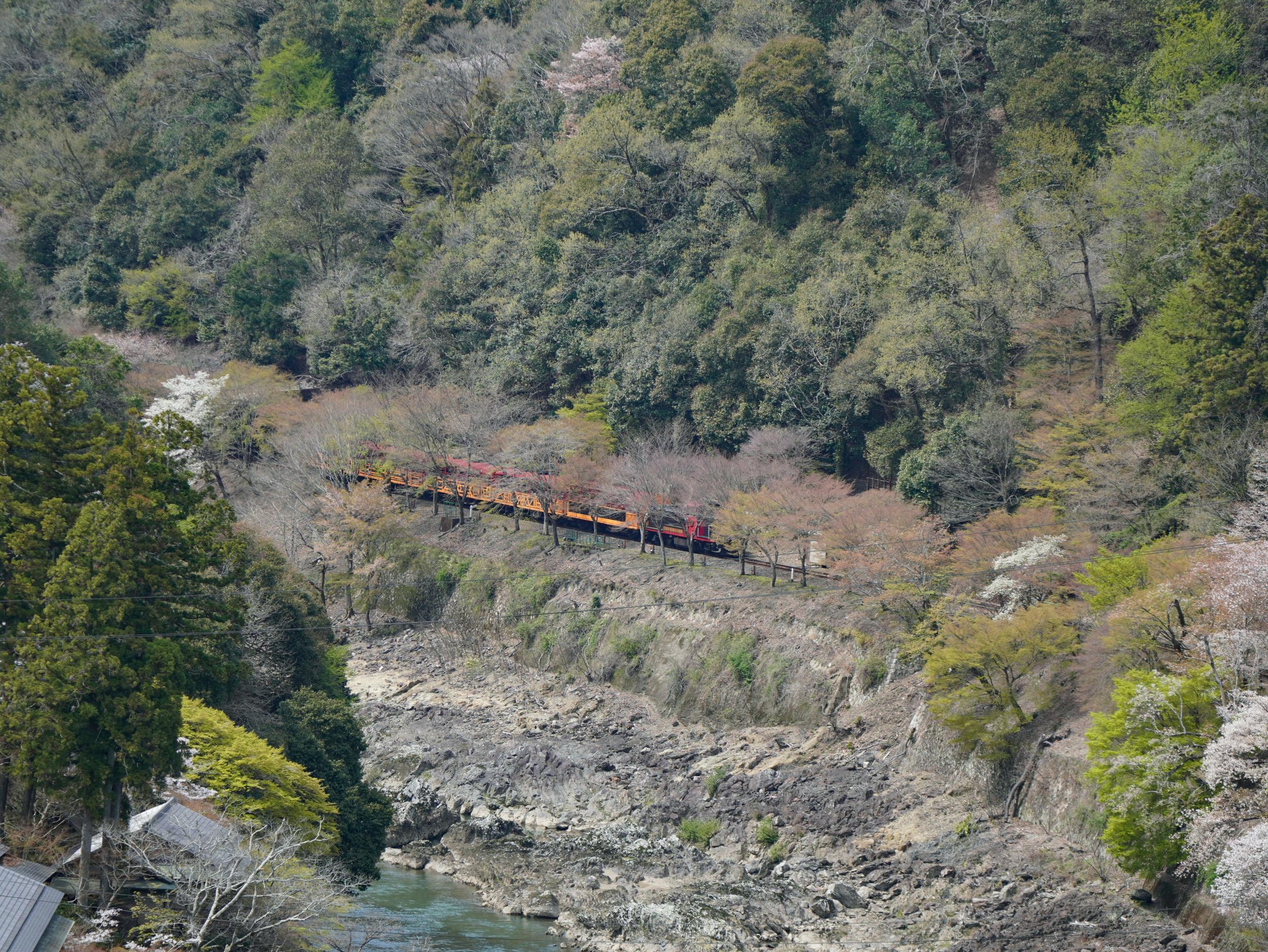 大悲閣千光寺からこちらを撮った写真です。この写真の左手に見える案内板の表面はトロッコ列車の時刻表で、現在地はトロッコ嵐山駅すぐ近くなのに、上り列車の案内はトロッコ保津峡駅の発車時刻が掲示されていました。スマホで上り列車のトロッコ嵐山駅の時刻をチェックした自分の方が正確なはず。