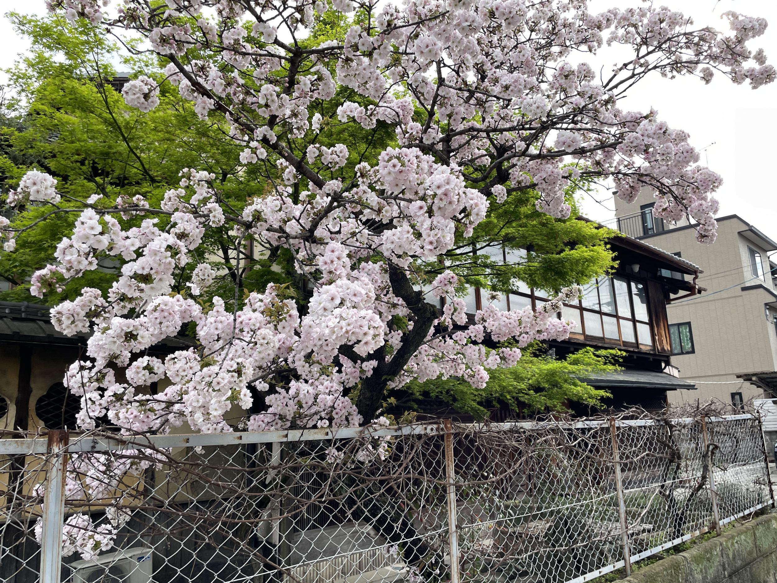 ガラス障子の並ぶ木造2階建てを背景にヤエザクラと新緑のコントラストが美しい。