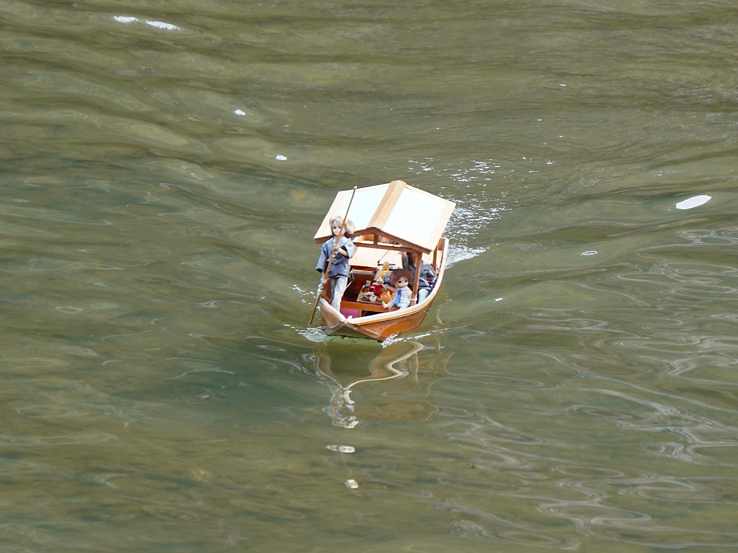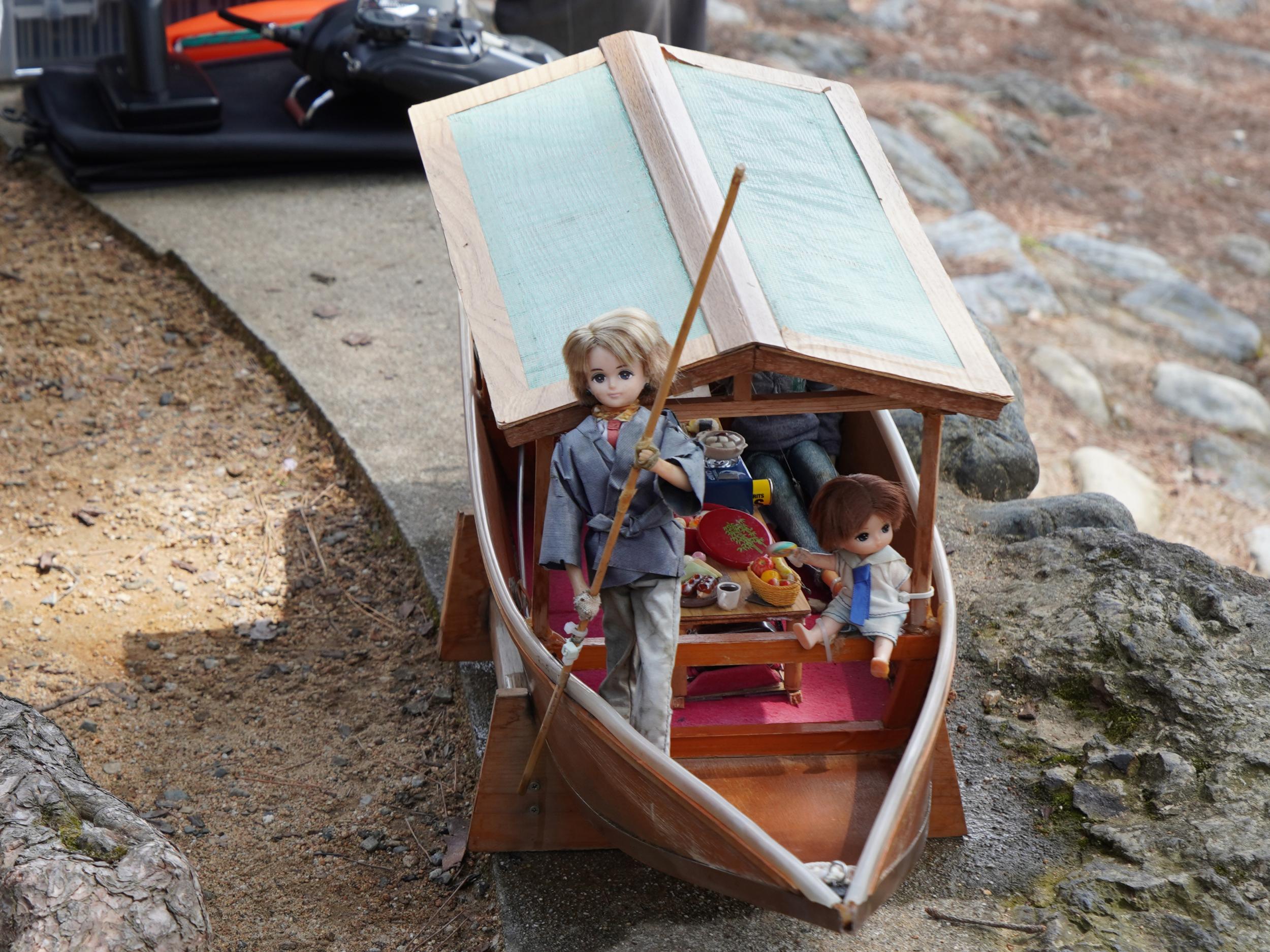 川辺に置かれていたのはラジコンの屋形船、船頭はリカちゃん。一言断って撮らせてもらいました。