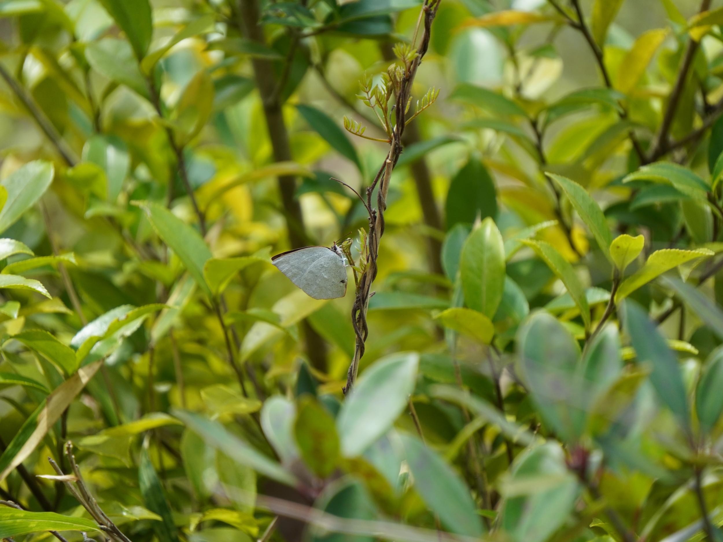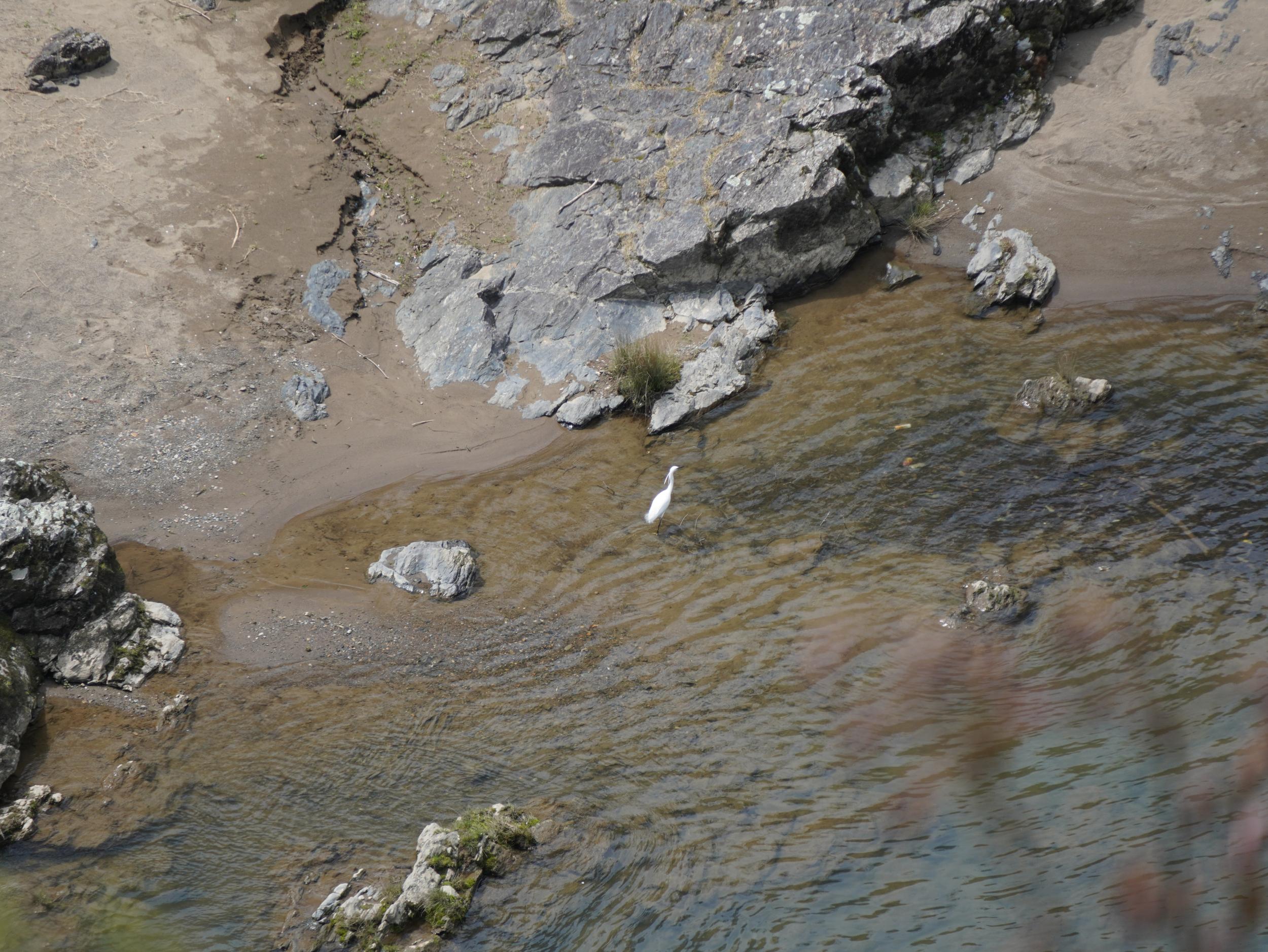 保津川の河原にダイサギが下り立ちました。展望台の外の木立にウラギンシジミ。