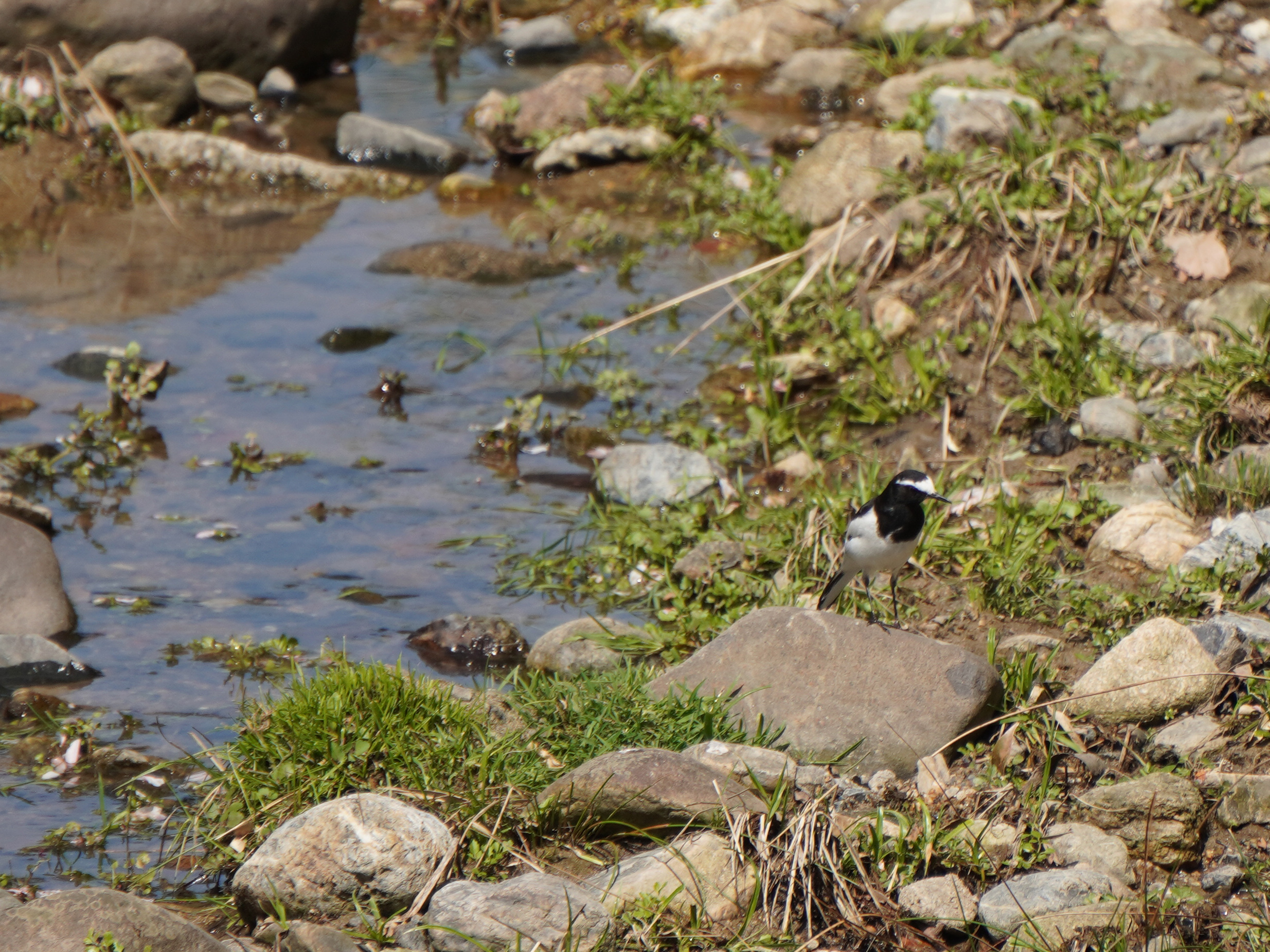 佐保川の土手の道が途切れたところで川面を覗くろセグロセキレイ。