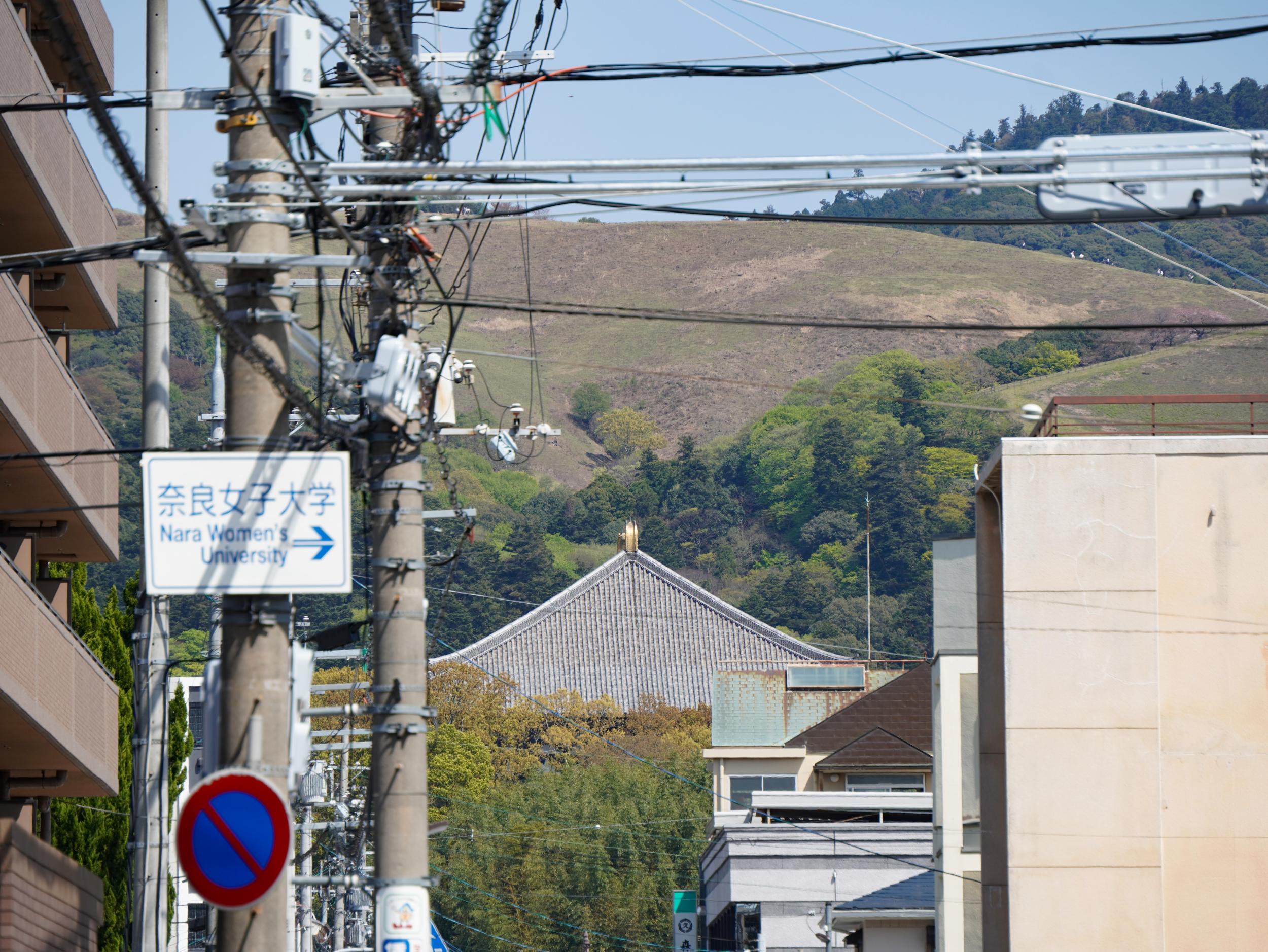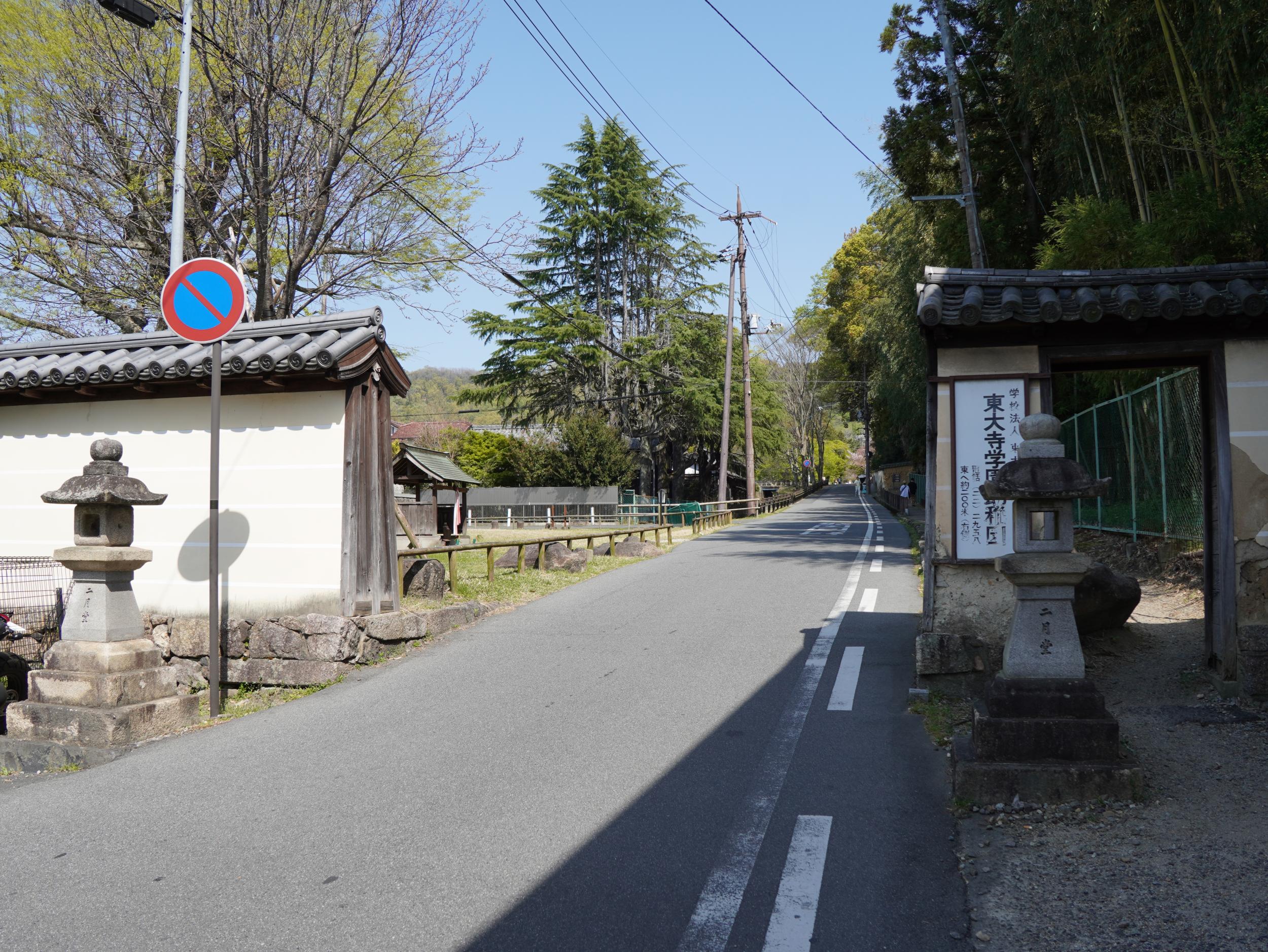 奈良女の北側の道をまっすぐ東へ進みます。正面に大仏殿と若草山。