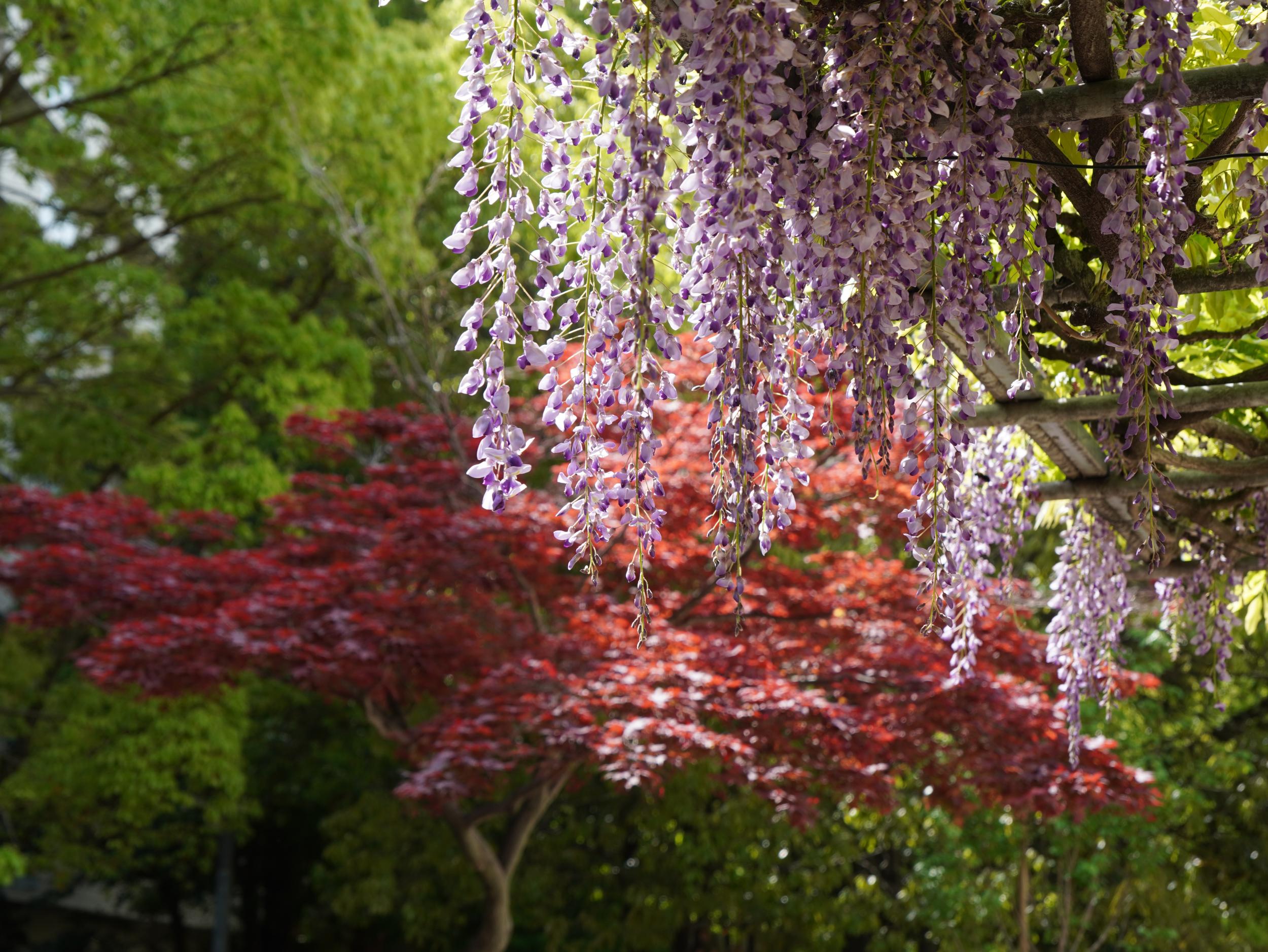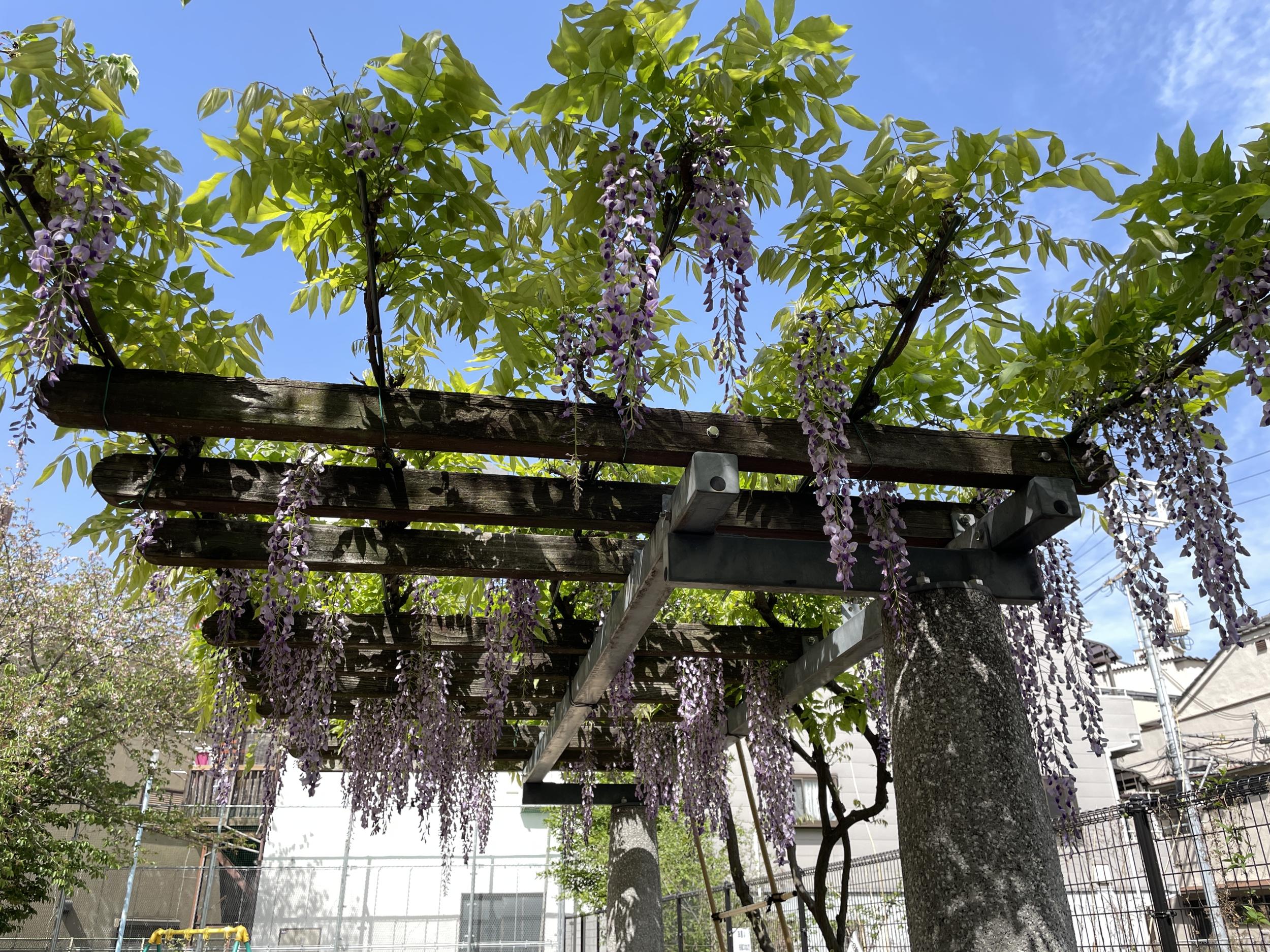 桜が終わるとお次は藤。奈良公園の萬葉植物園か、宇治の平等院か、と調べていると福島区の春日神社がヒット。規模は大きくなさそうですが由緒ありげです。