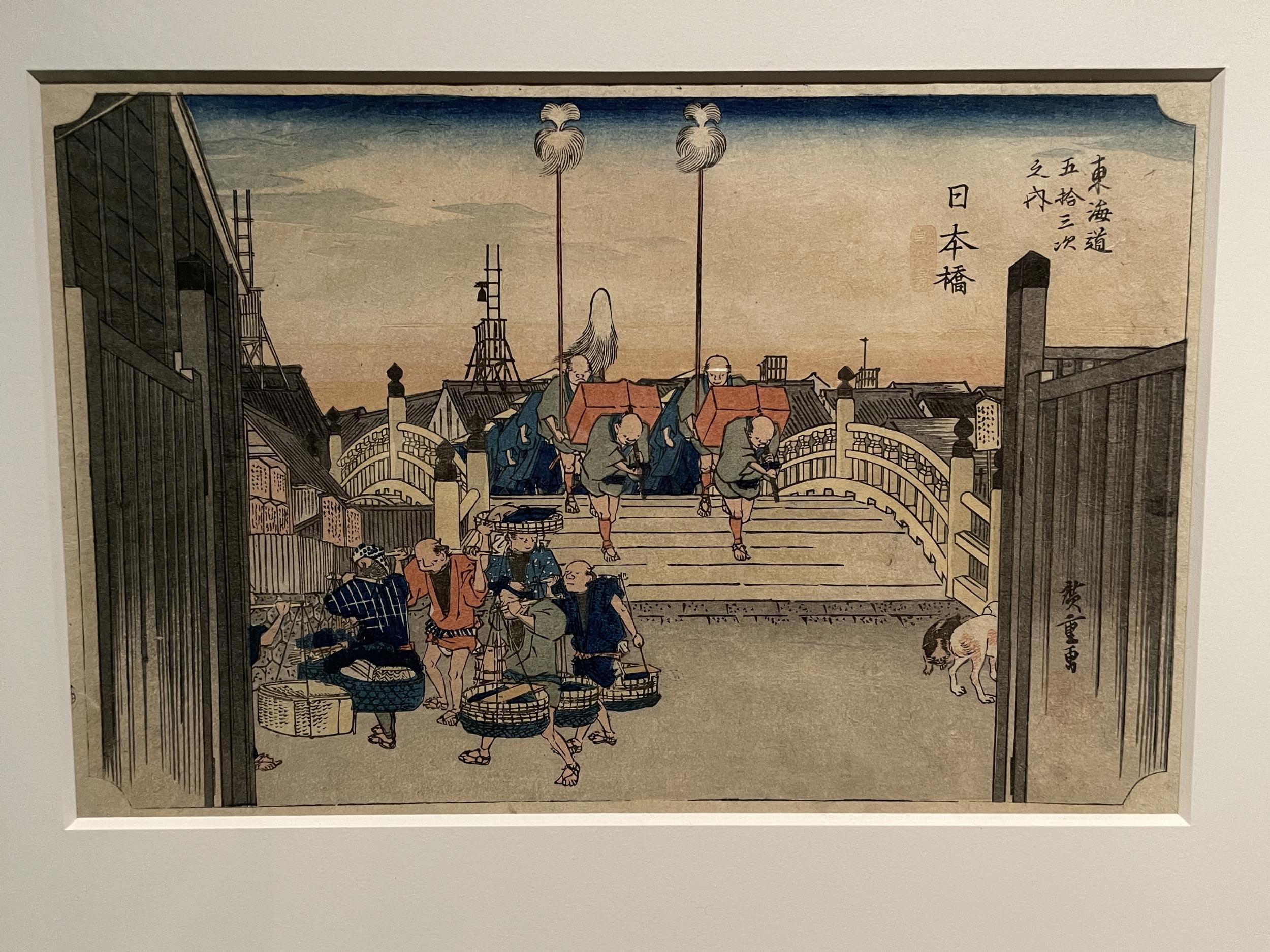 歌川広重といえば東海道五十三次、日本橋朝之景。奴さんたちを先頭に大名行列、橋の袂には棒手振りたちが、土下座するでもなく屯しています。頻繁に大名行列に出会う江戸では土下座は必要なく、下にぃ下に、は将軍家や御三家、御三卿だけだったそうです。