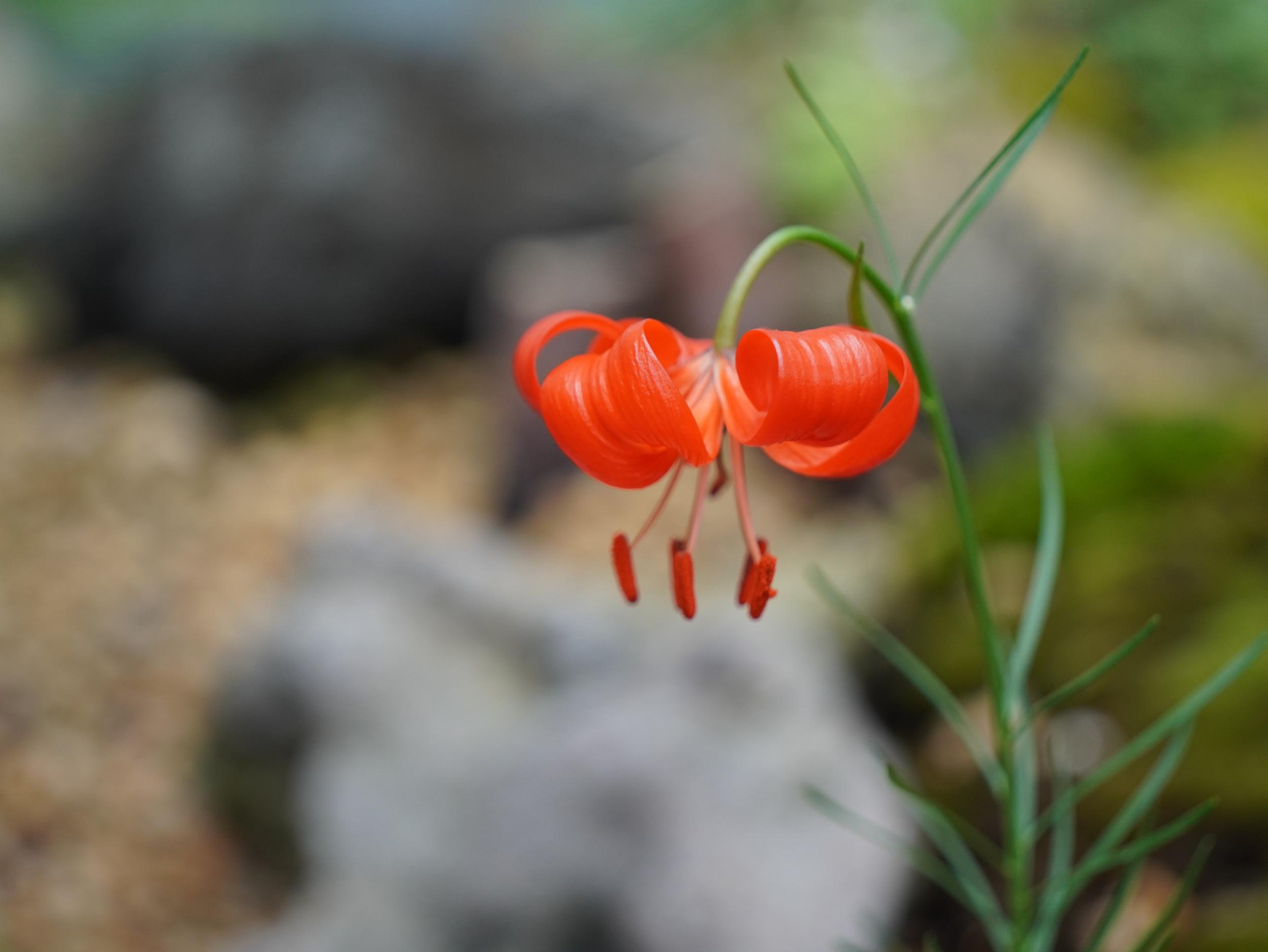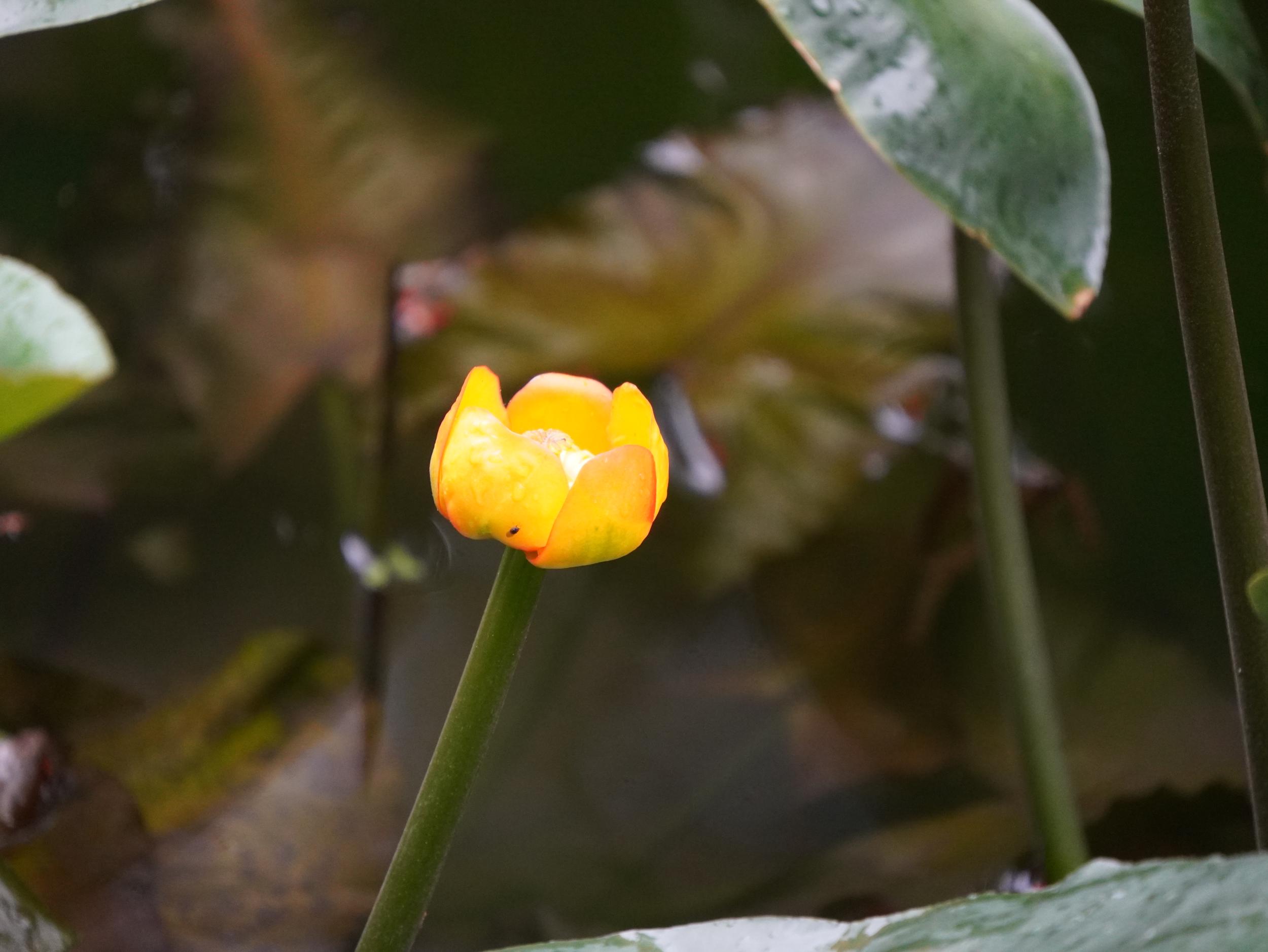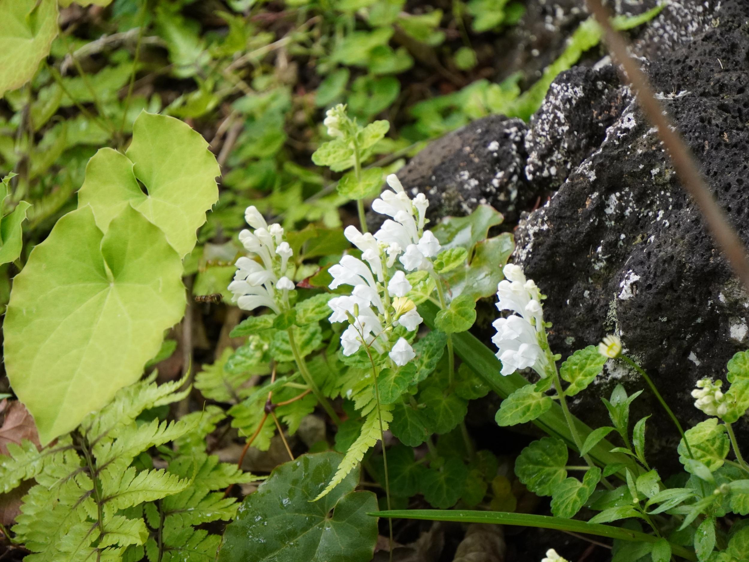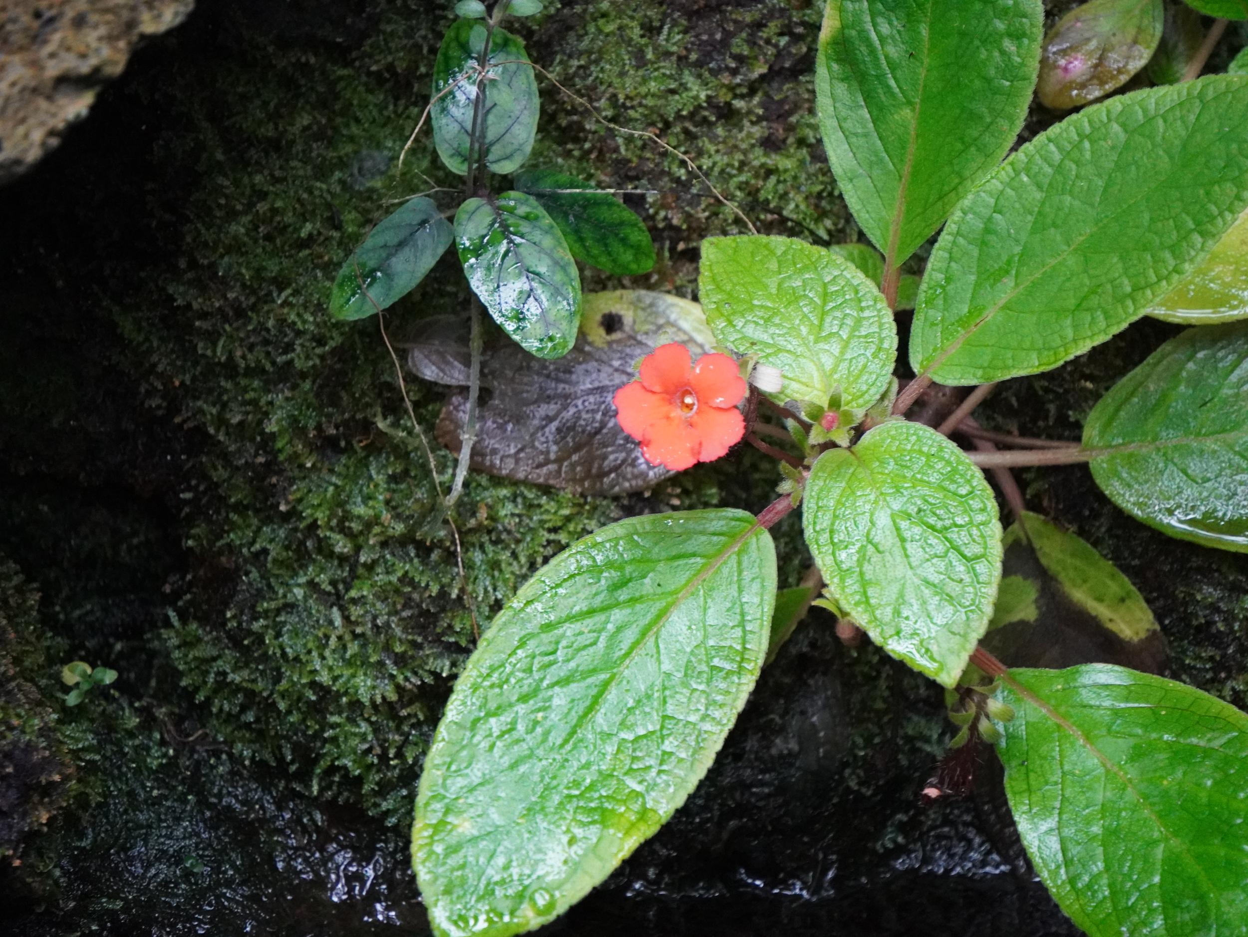 緑一色の滝壺に紅一点はエビスキア、この角度ではわかりませんが、縦に長い花です。