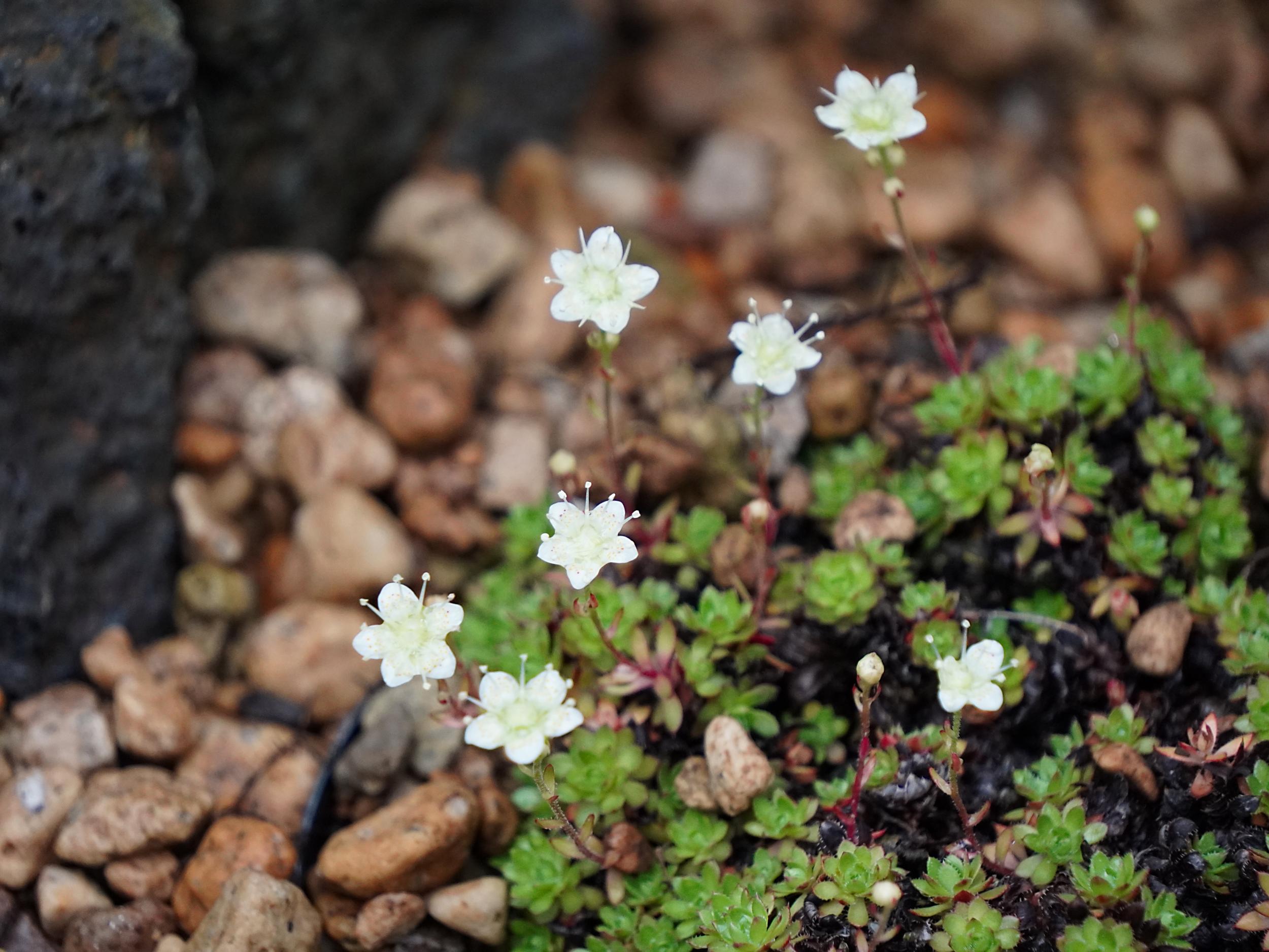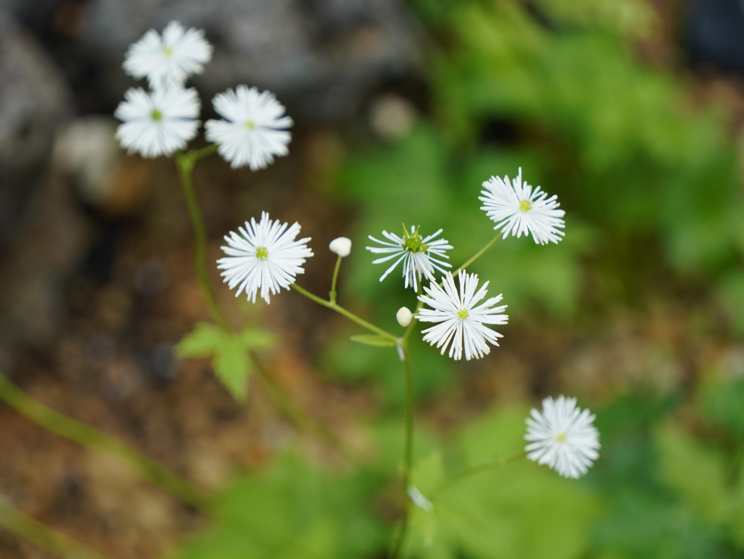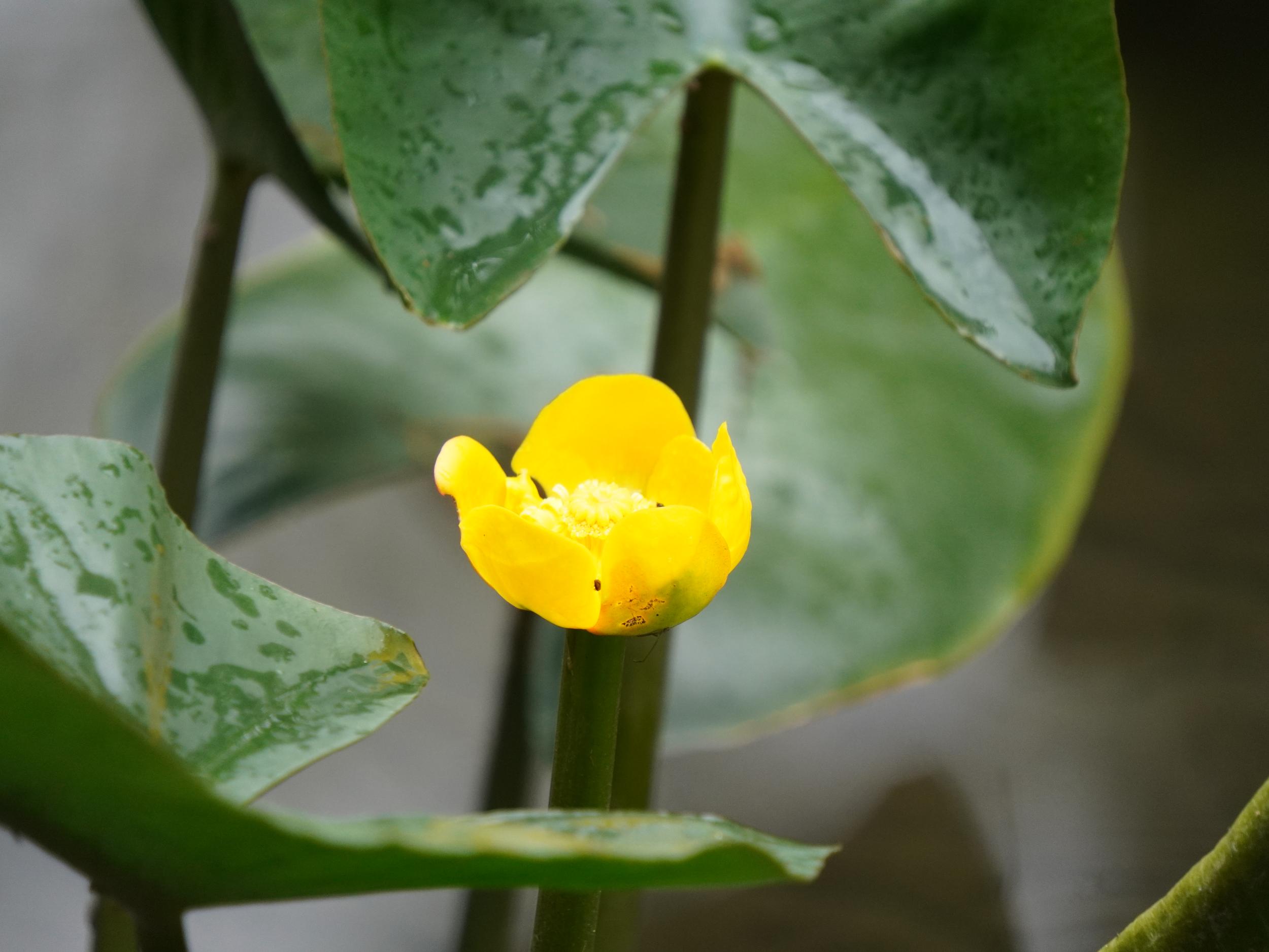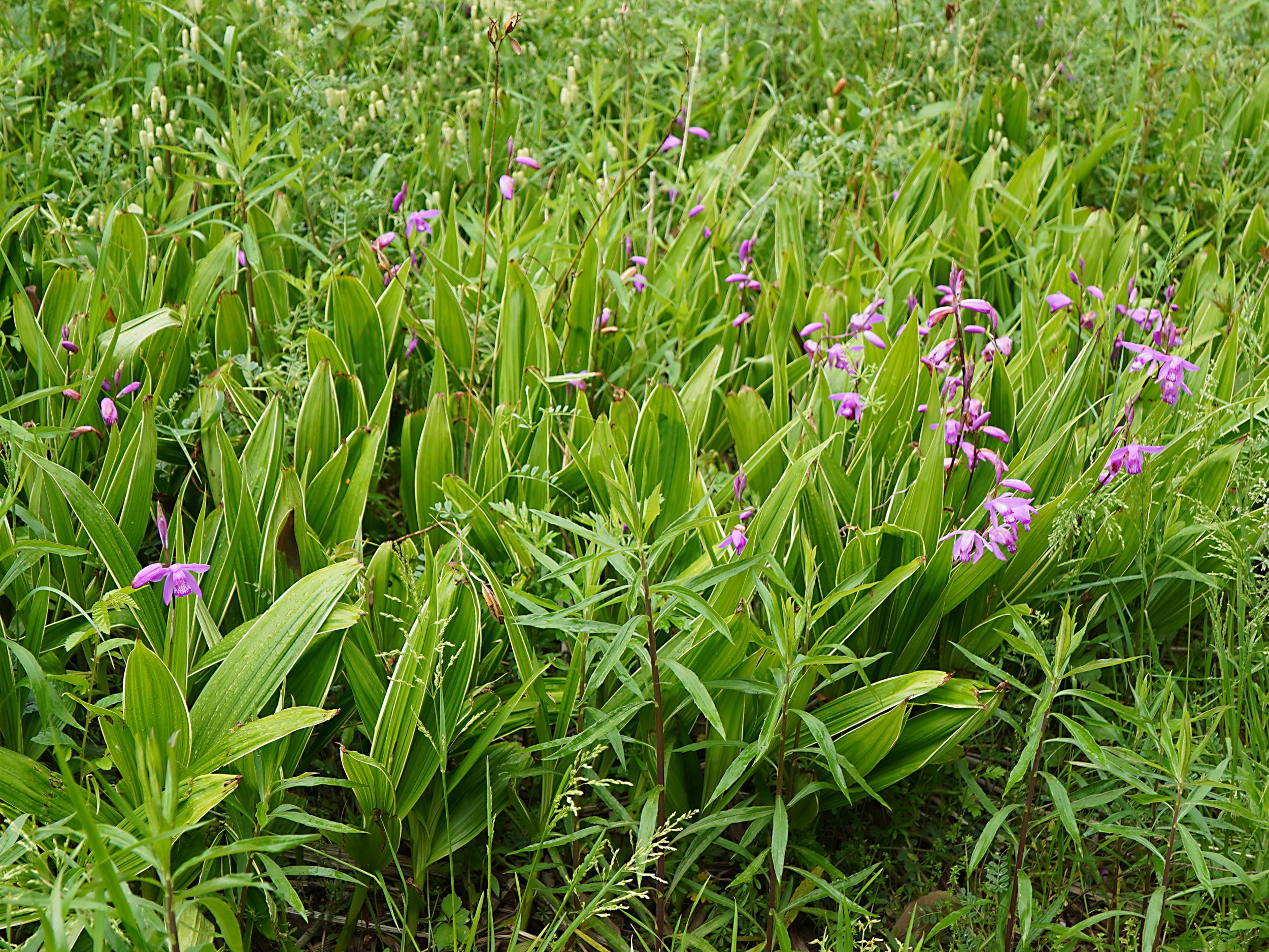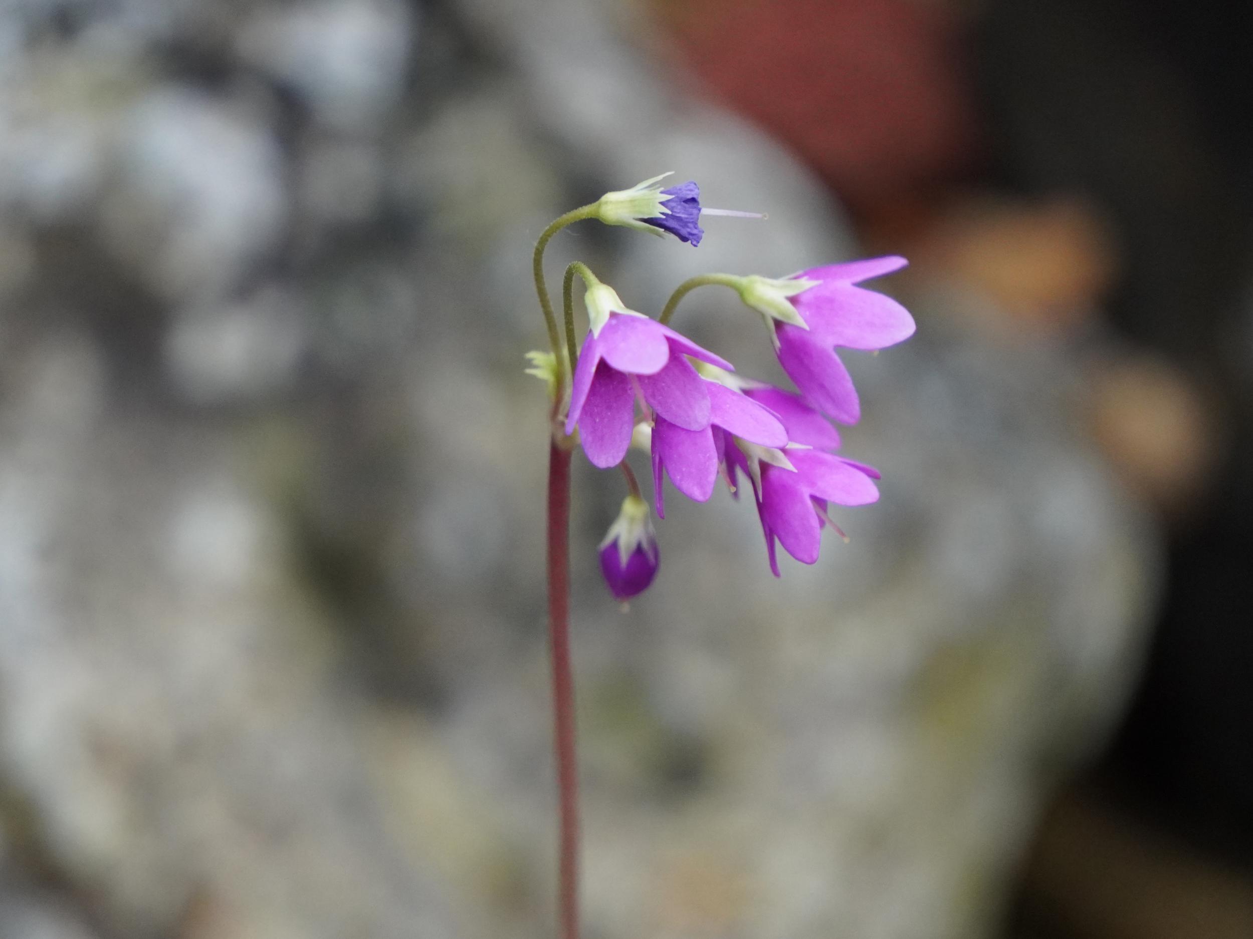 緑一色の滝壺に紅一点はエビスキア、この角度ではわかりませんが、縦に長い花です。