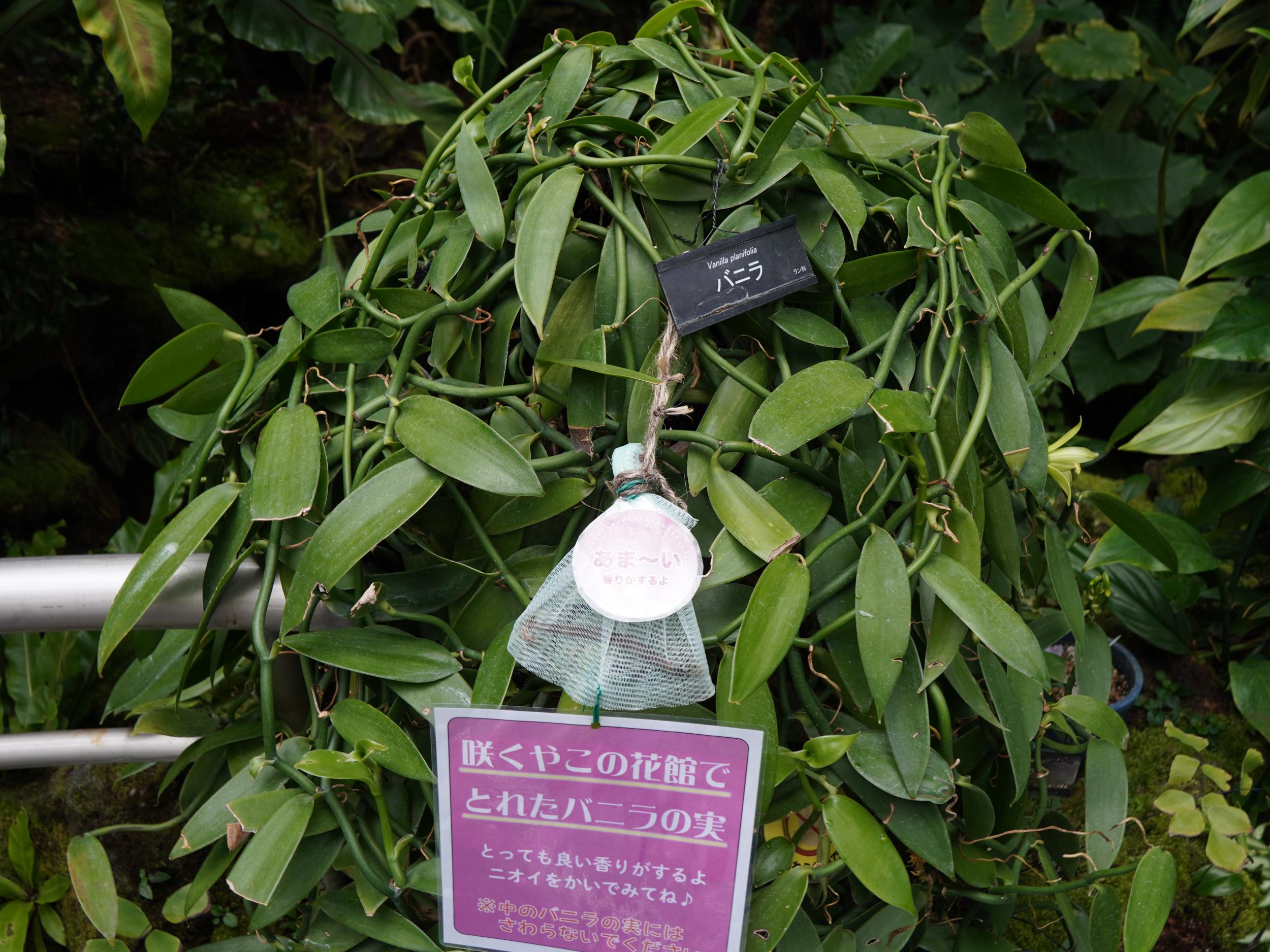 バニラの木に掛けられたバニラビーンズの入ったネットに鼻を近づけると甘いバニラの香り。収穫したばかりの豆に香りはなく、発酵と乾燥を繰り返すことでこの香りが出るそうです。(参考)