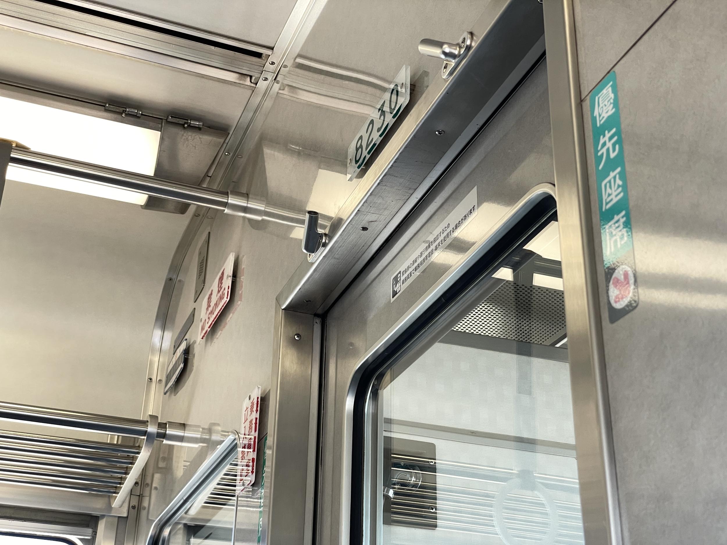 乗車している8000系のナンバープレートや製造銘板などの全てのプレートが壁から浮いた状態で取り付けられているのに気づきました。特に機能的な意味合いは無さそうですが、高品質感は演出できています。