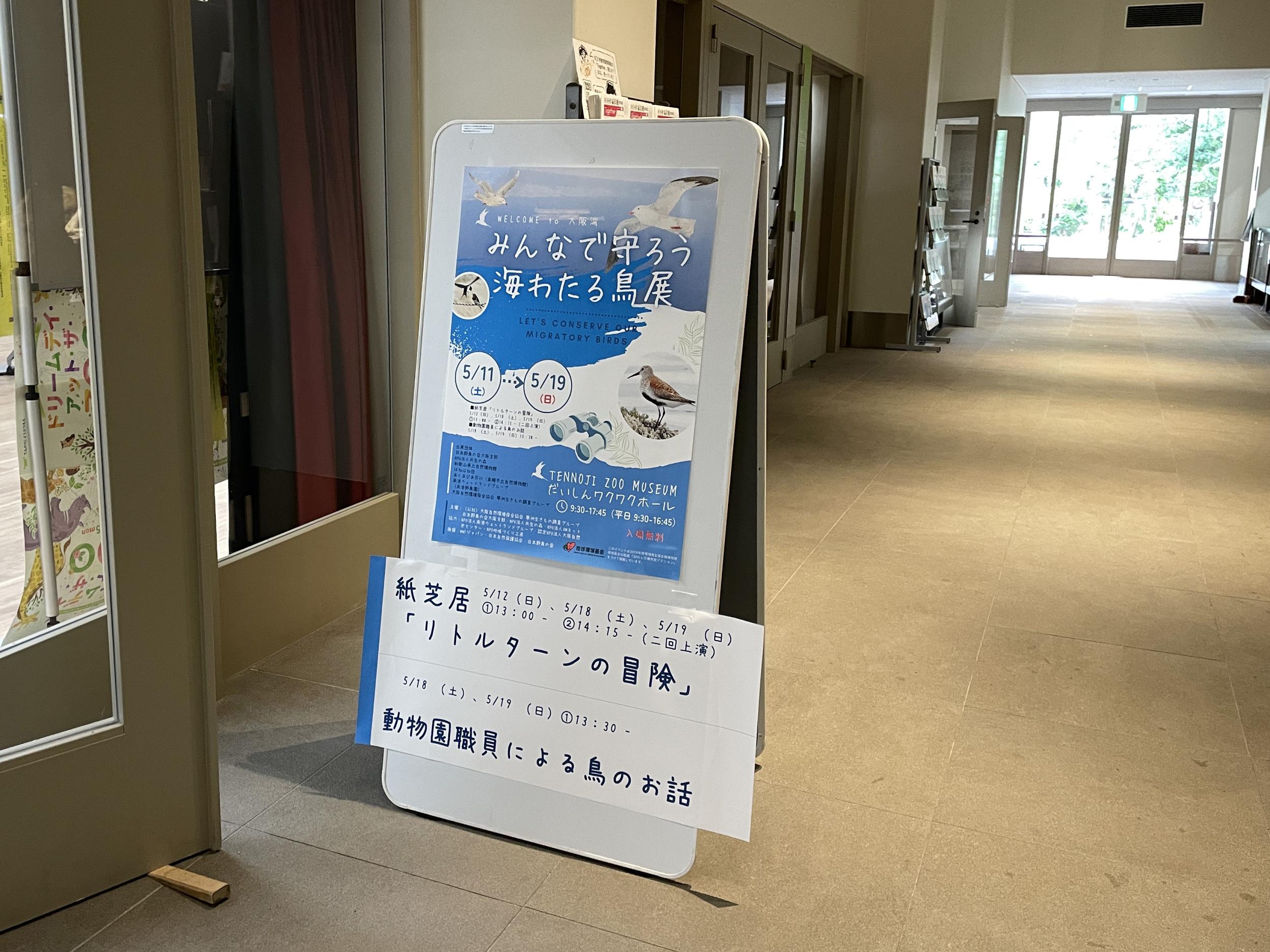 エントランスゲートで教えてもらったパネル展示会場のZOO MUSIUM、「みんなで守ろう海わたる鳥展」とあってイベントタイトルが違ってますがここで間違い無さそうです。一般立入禁止の夢洲や堺の埋立地にある共生の森のコアジサシやシギチたちの様子をパネル展示も以前ダーウィンが来た!で紹介されていた内容と大差ない感じ。泉大津の埋立地にも干潟ができてシギチたちが集まっているとの情報は知らなかったもののやはり一般立入禁止とのこと。残念ながら男里川河口の紹介はありませんでした。