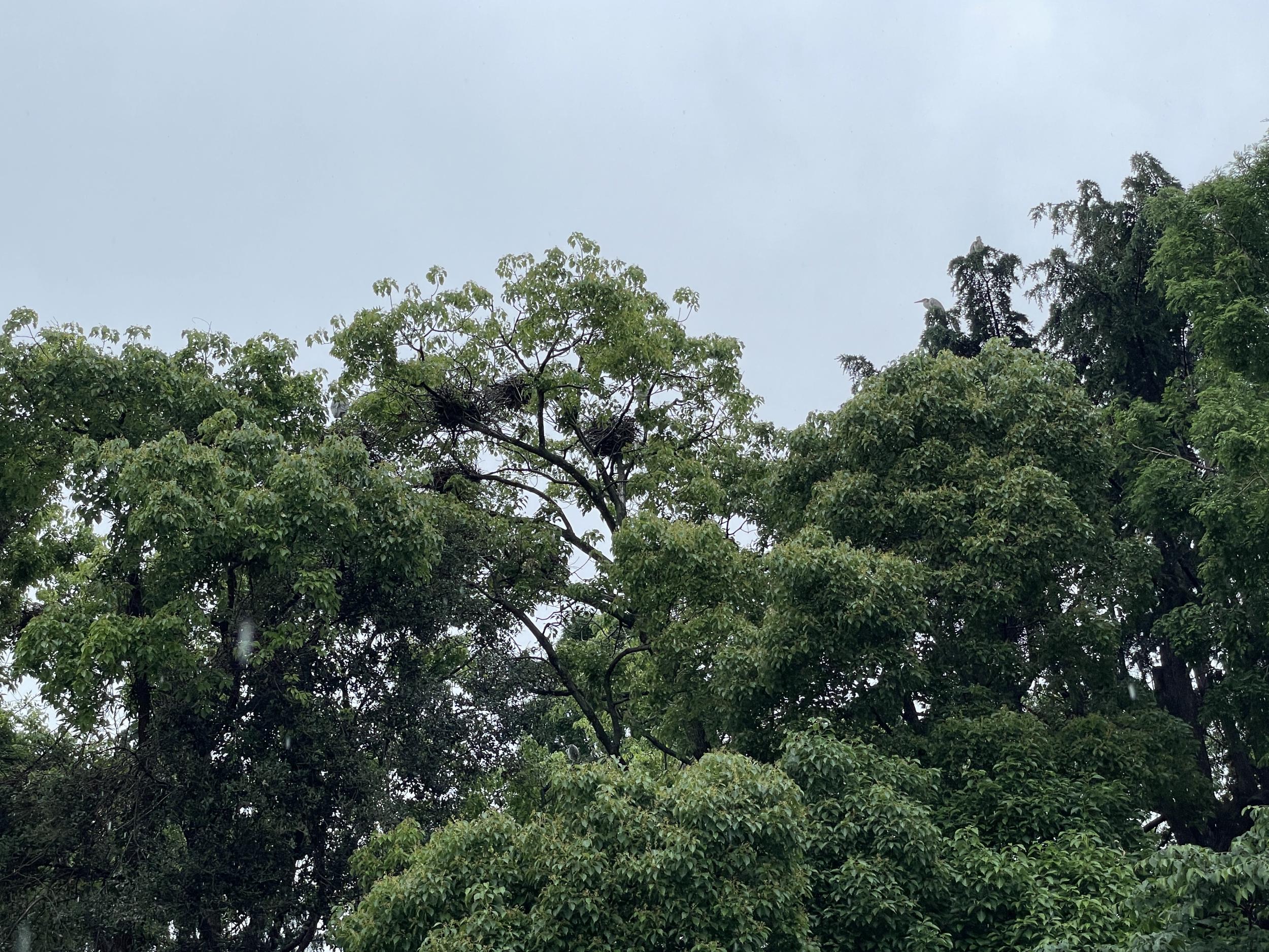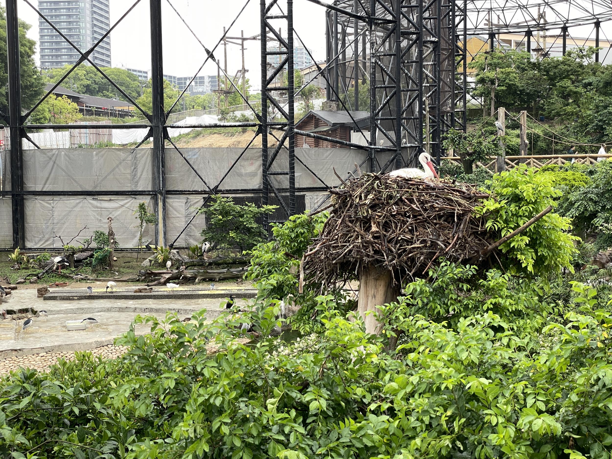 鳥の楽園の外をアオサギが飛んでます。ホッキョクグマの上の木にはアオサギの巣が見えます。