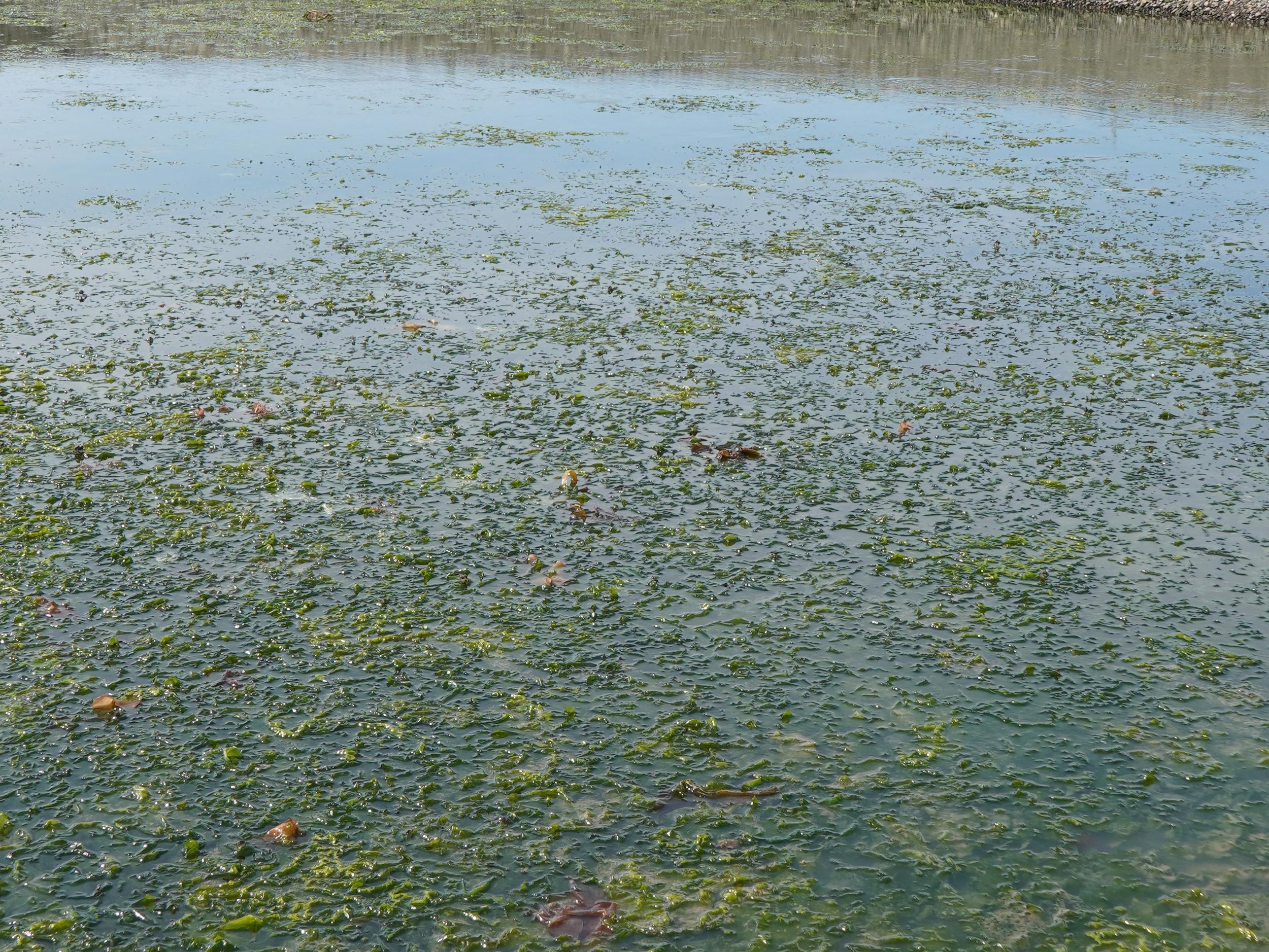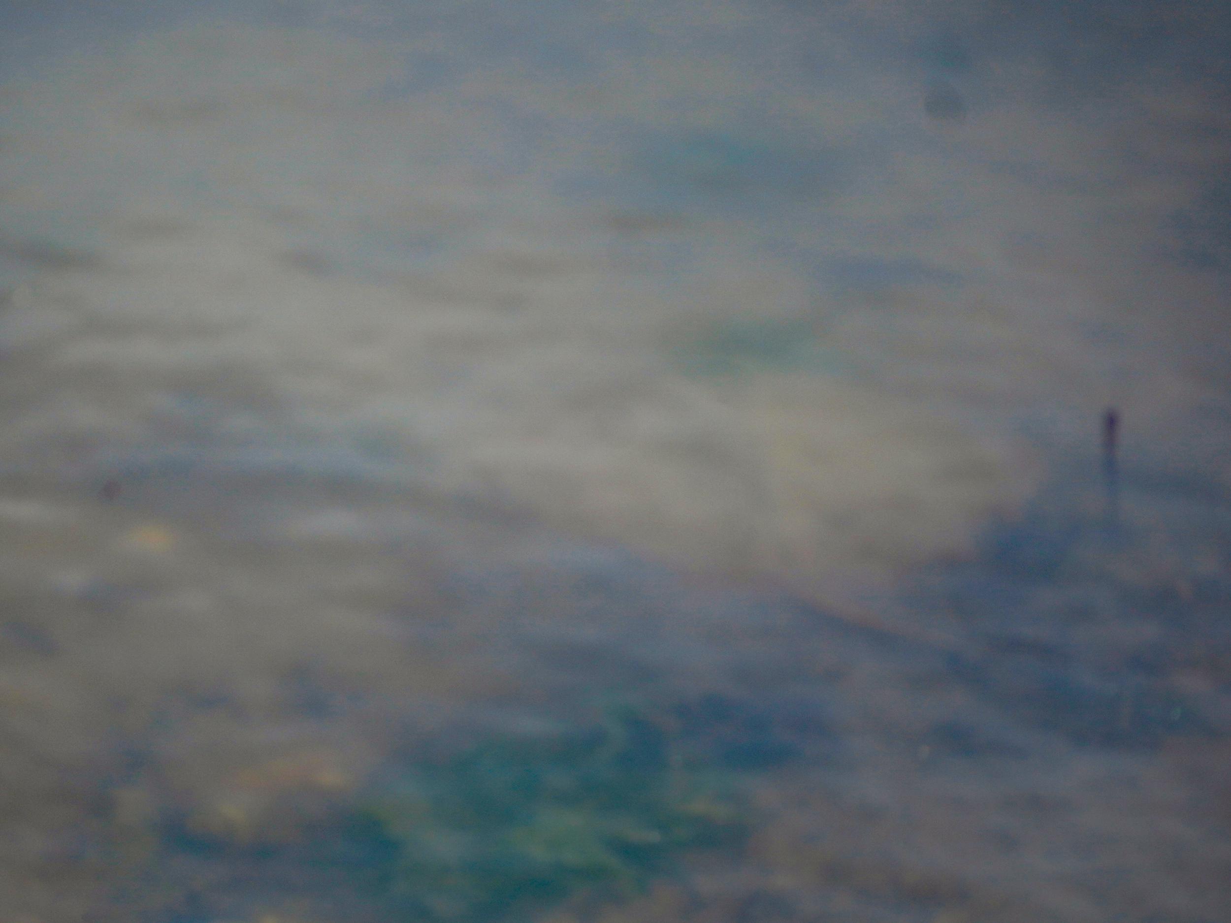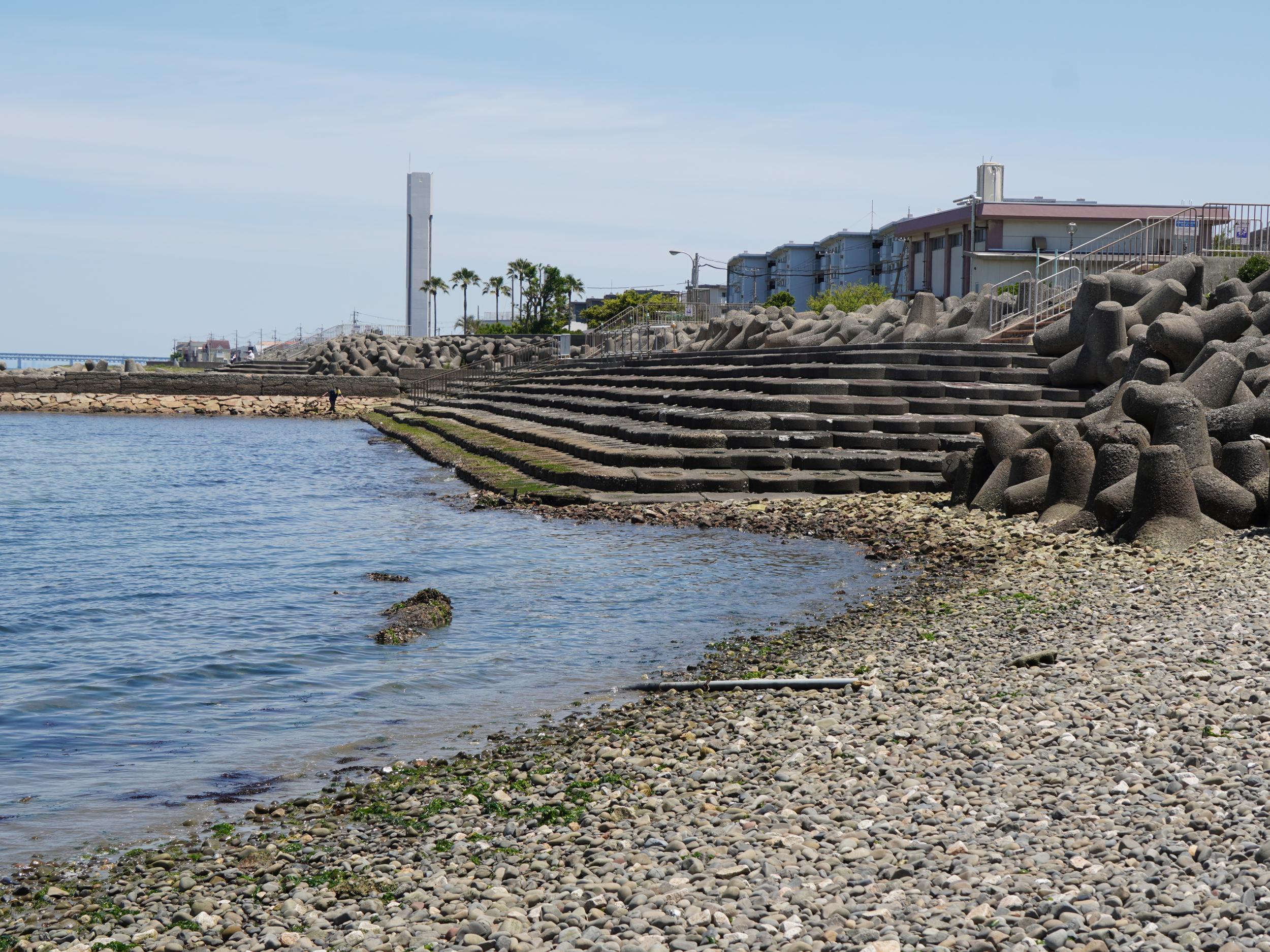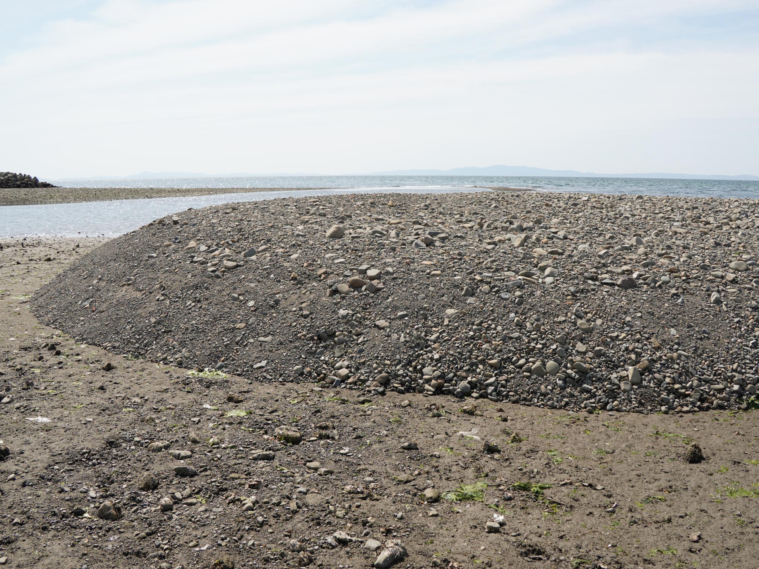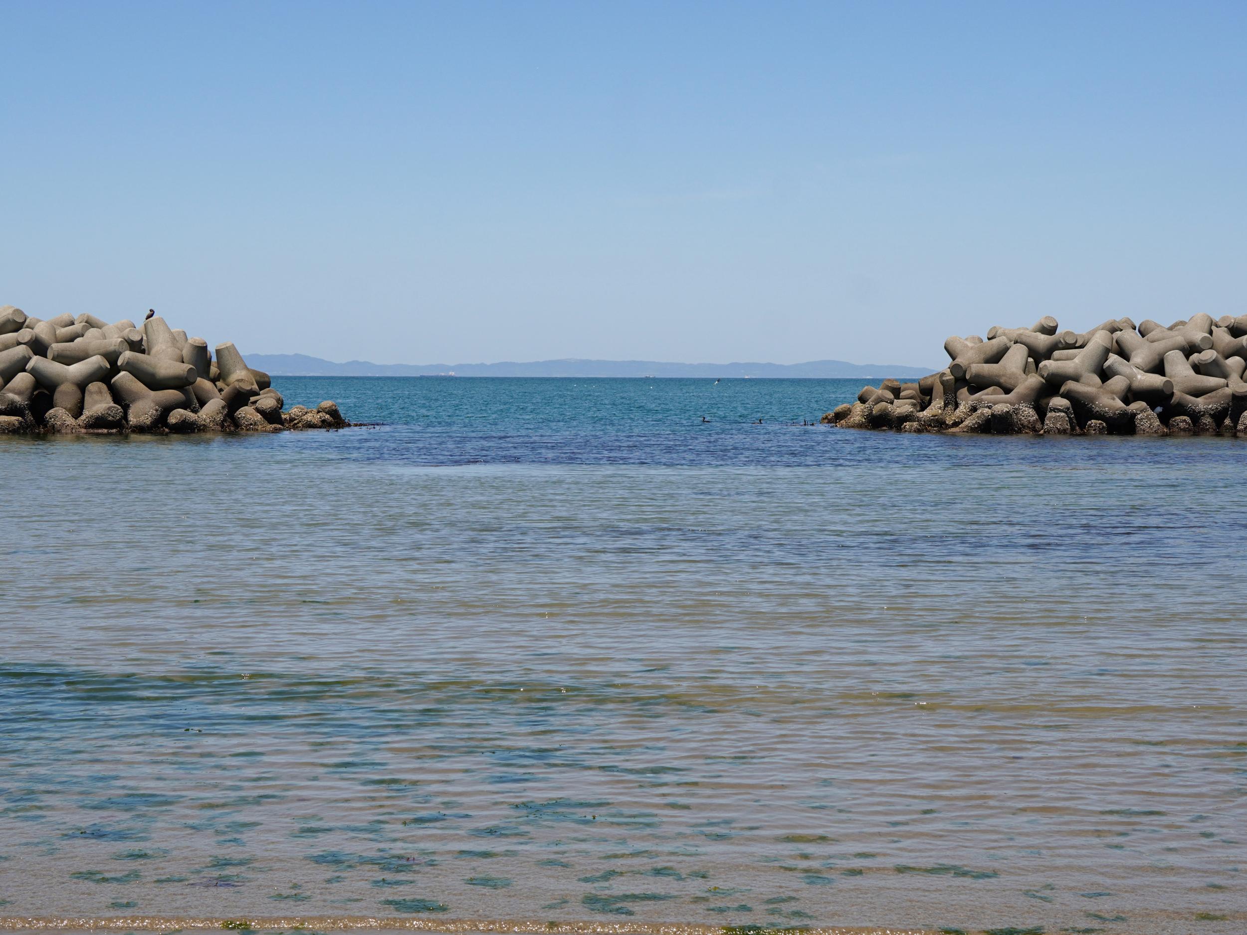 テトラポッドの向こうからコアジサシらしき鳴き声が響いてきます。Google Mapの航空写真を拡大するとテトラポッドの向こう側に定置網の陰が見えます。この定置網のブイにコアジサシが集まっているようです。