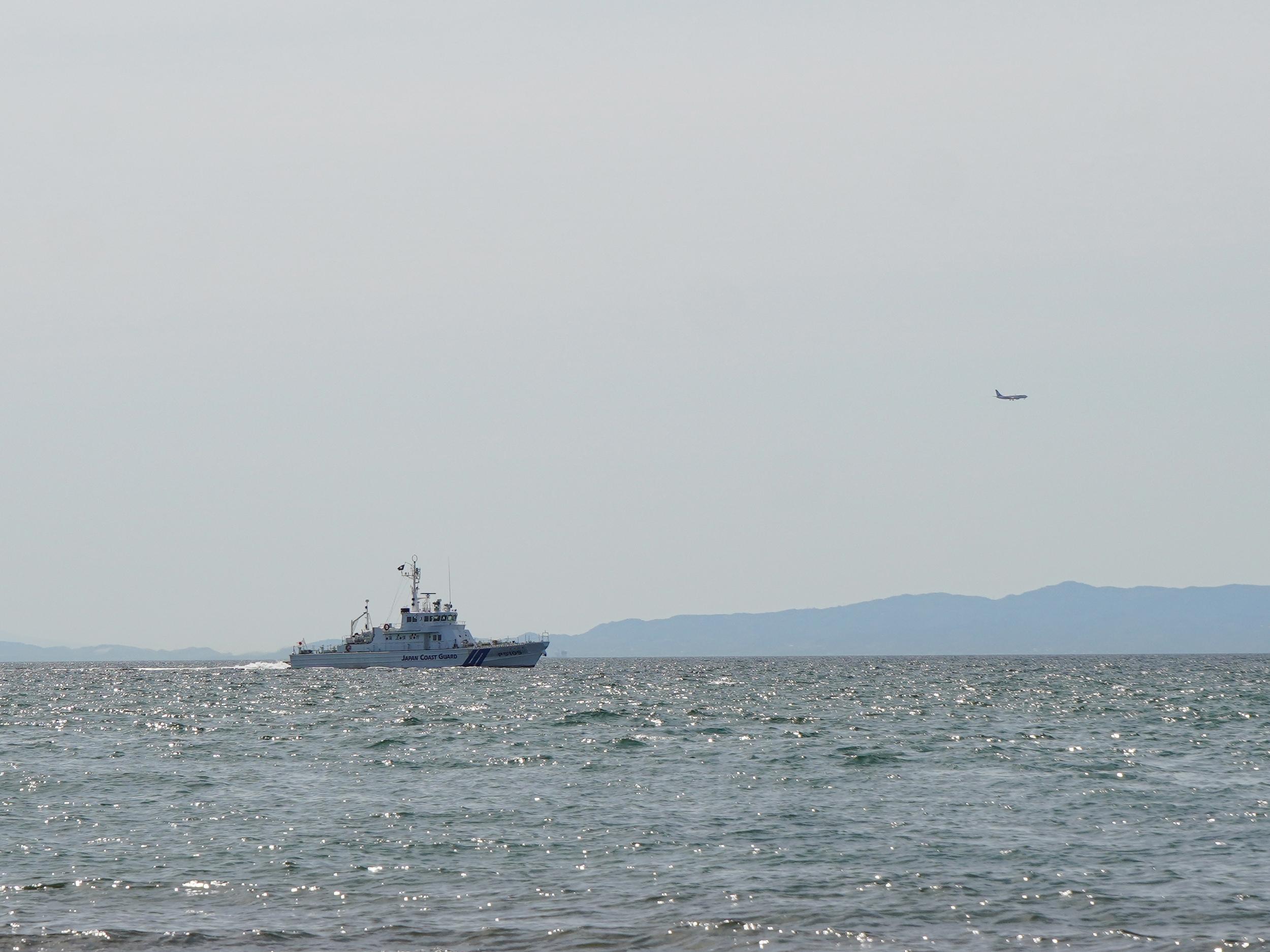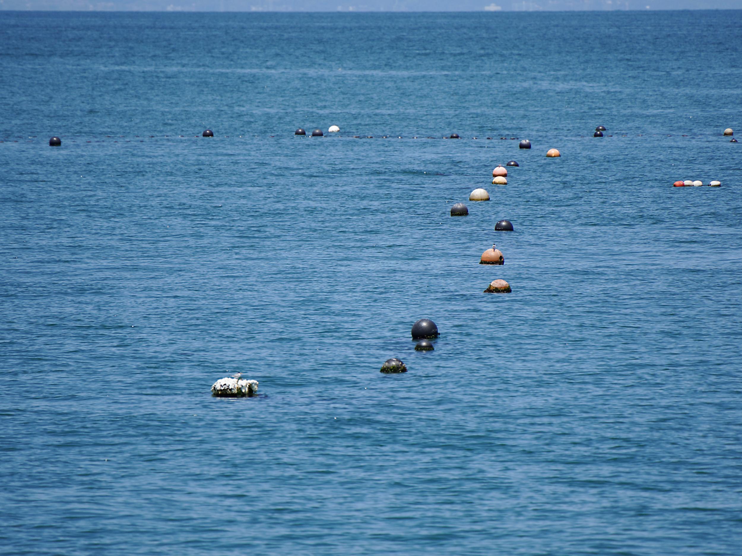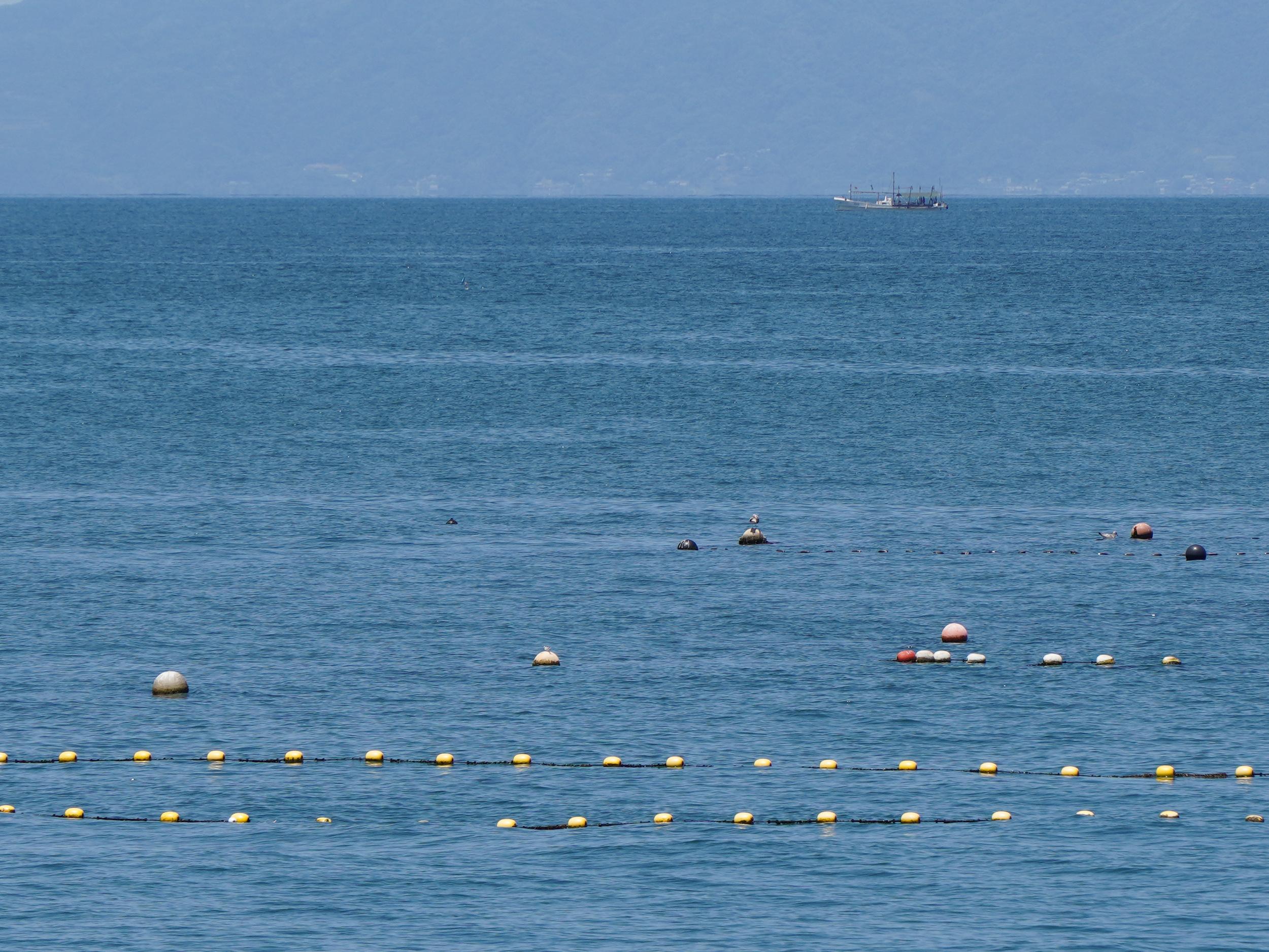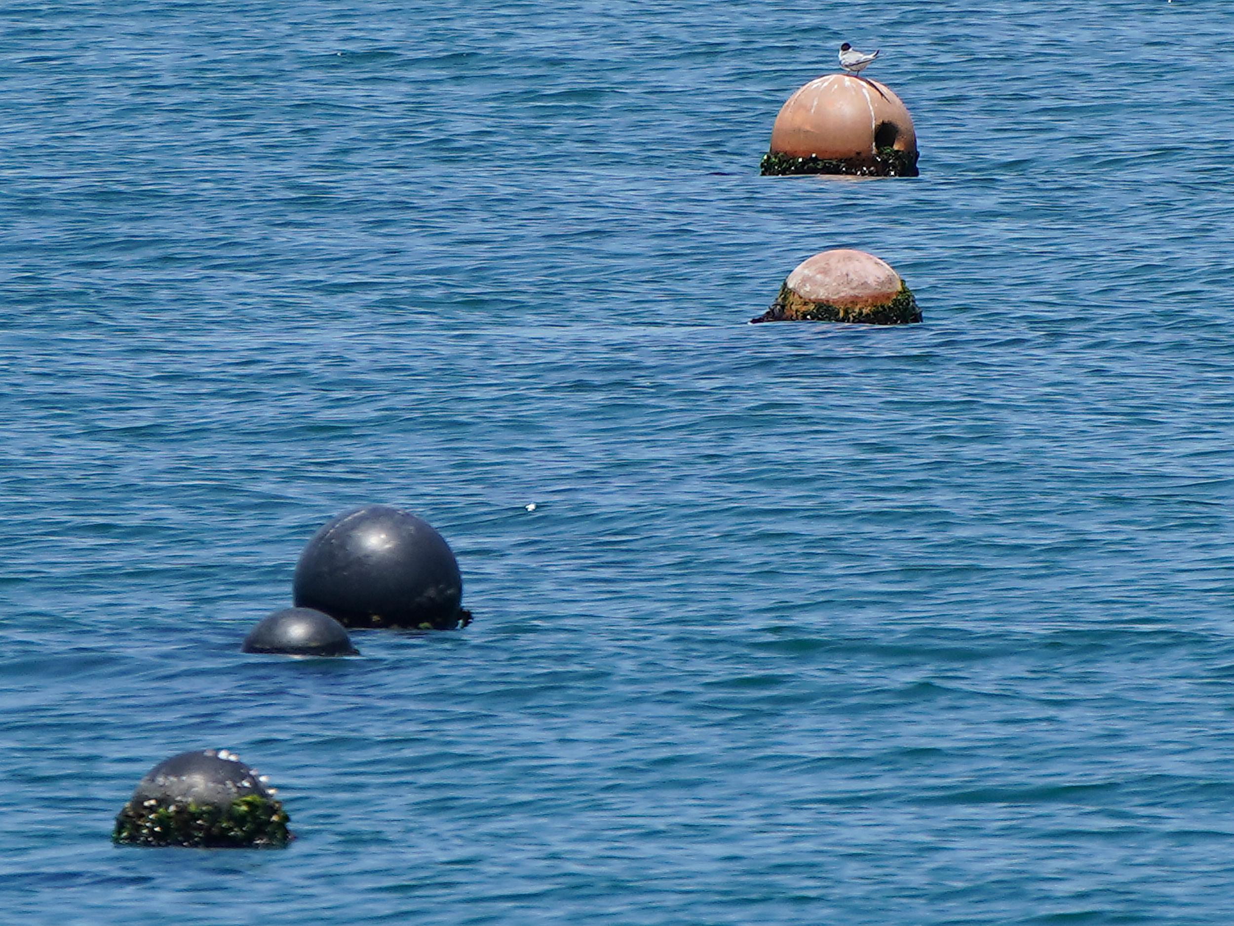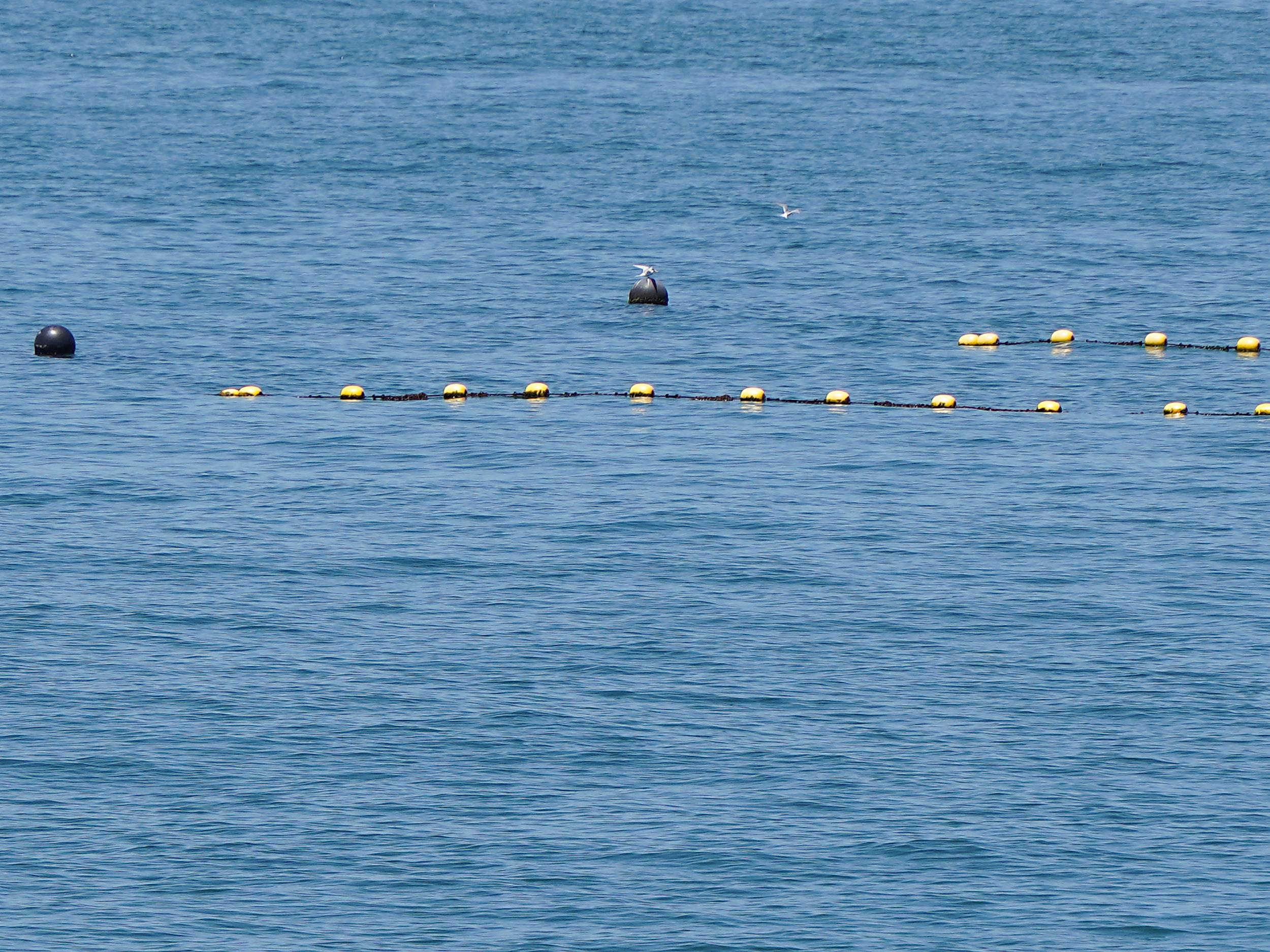 沖に浮かぶ定置網のブイが白いフンで汚れ、いくつかのブイにコアジサシが止まっています。コロナ禍真っ只中だった3年前以来です。
