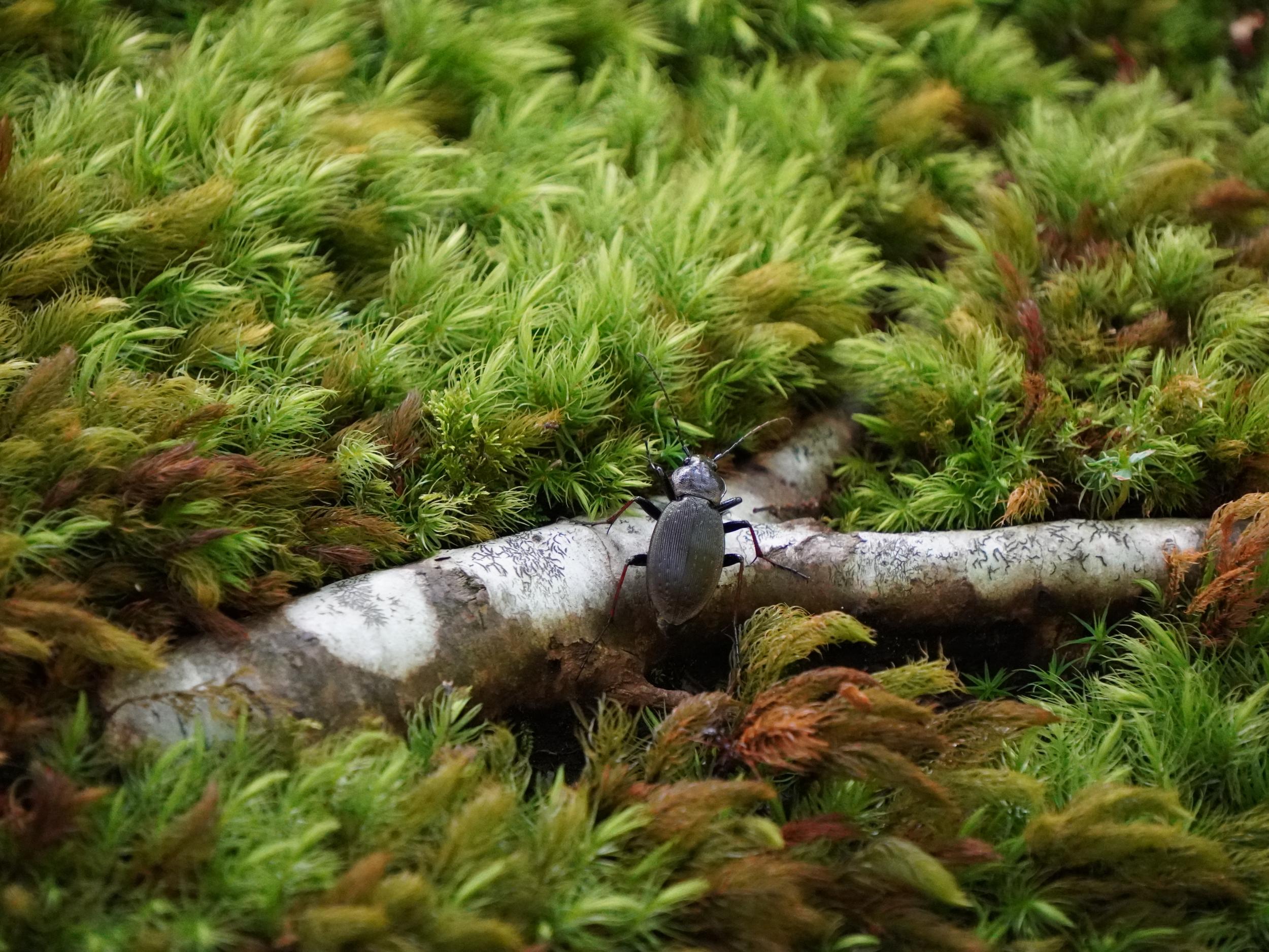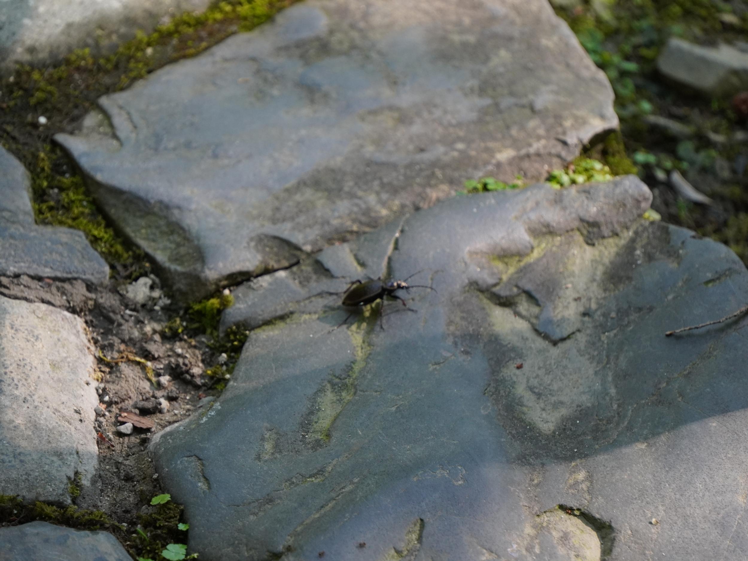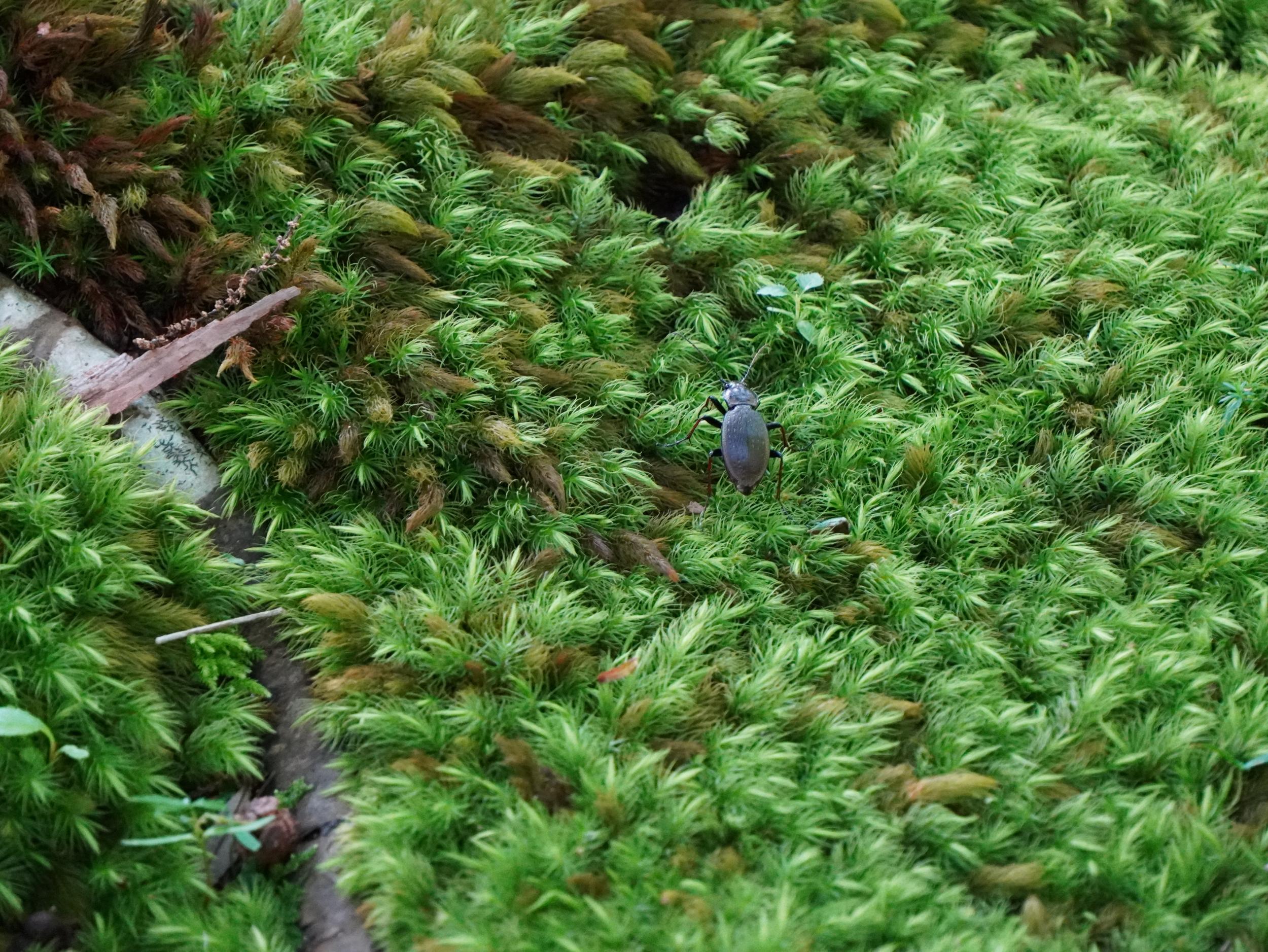 足元にオサムシ。苔の上をハンミョウより少し遅いくらいの速度で駆けて枯れ枝でひと休み。