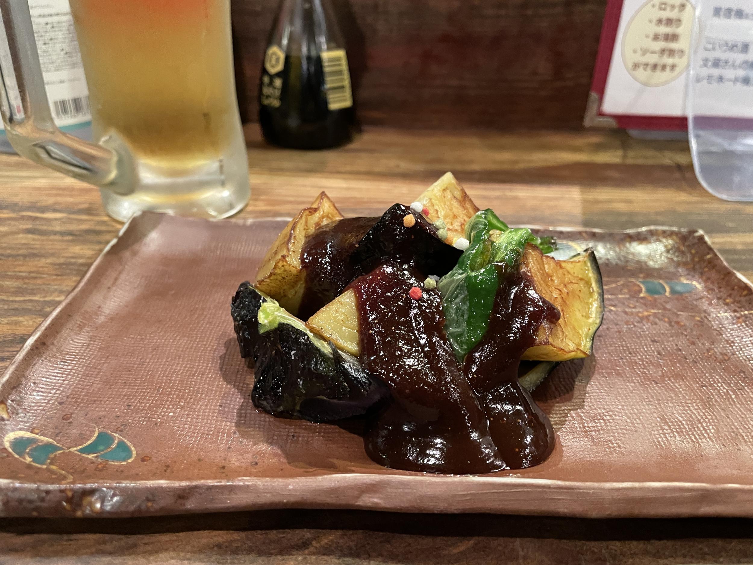 おばんざい3点セットがここのおすすめですが、生ビールにとりあえず茄子の田楽を注文、生の茄子を焼くのではなくて素揚げしてたっぷりの八丁味噌(たぶん)がかけられて出てきたのですがかなり美味でビックリ。このまま他のものを注文しようか悩んでやはりハンバーグが食べたくなりました。