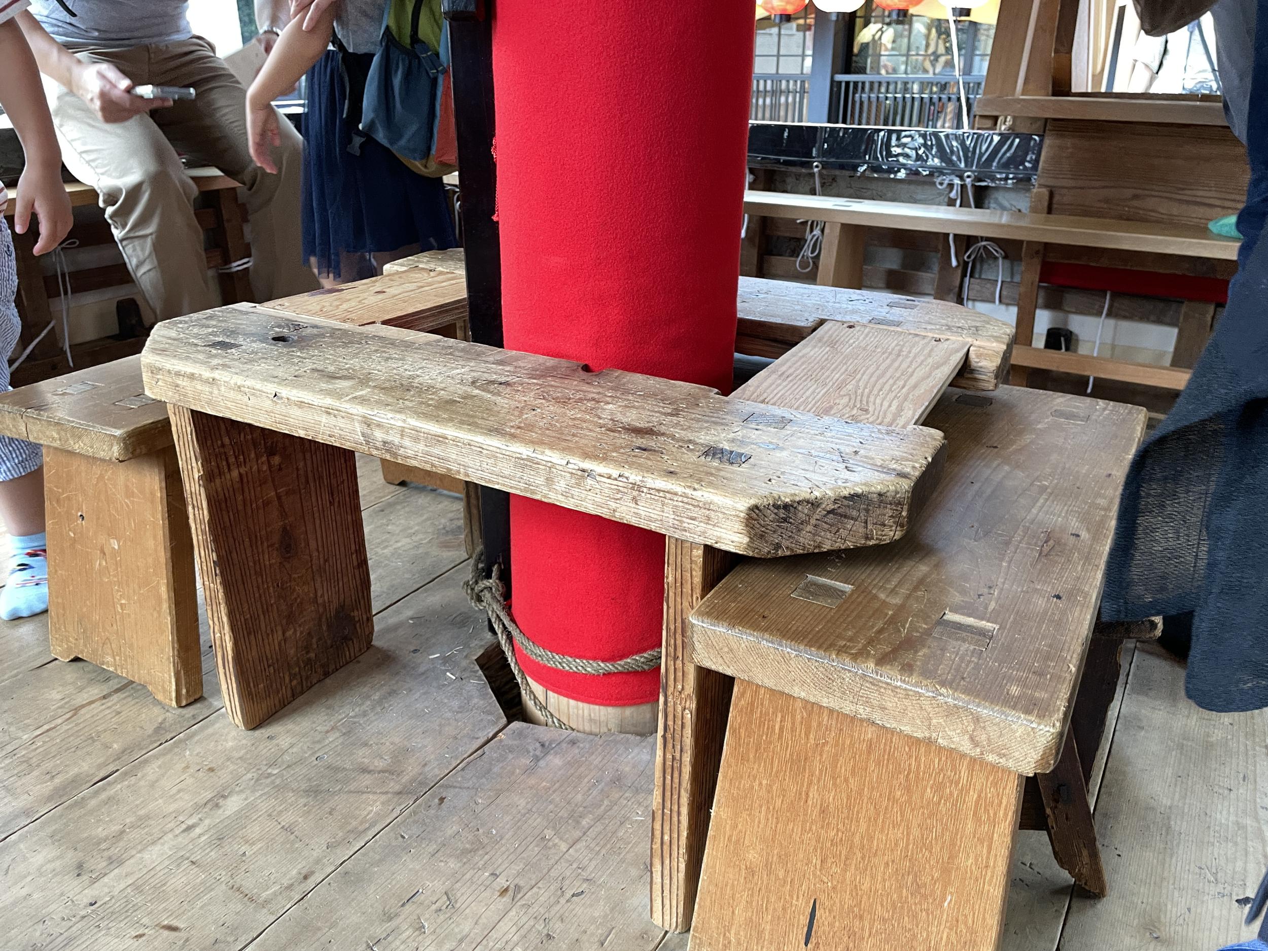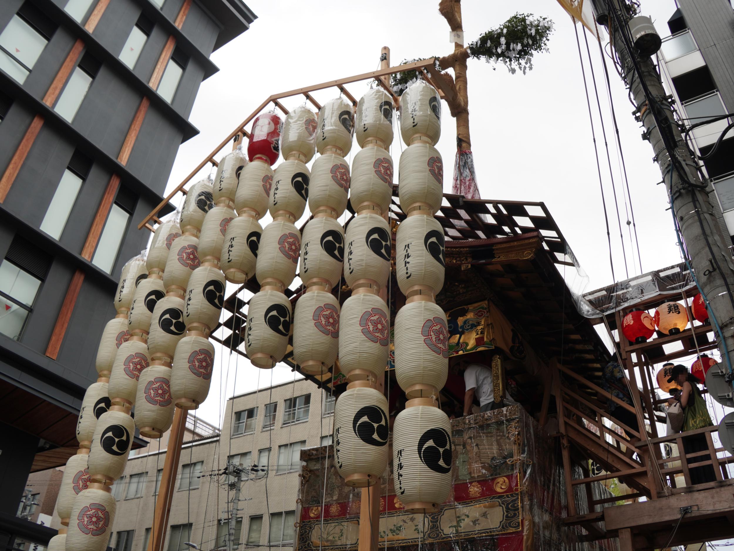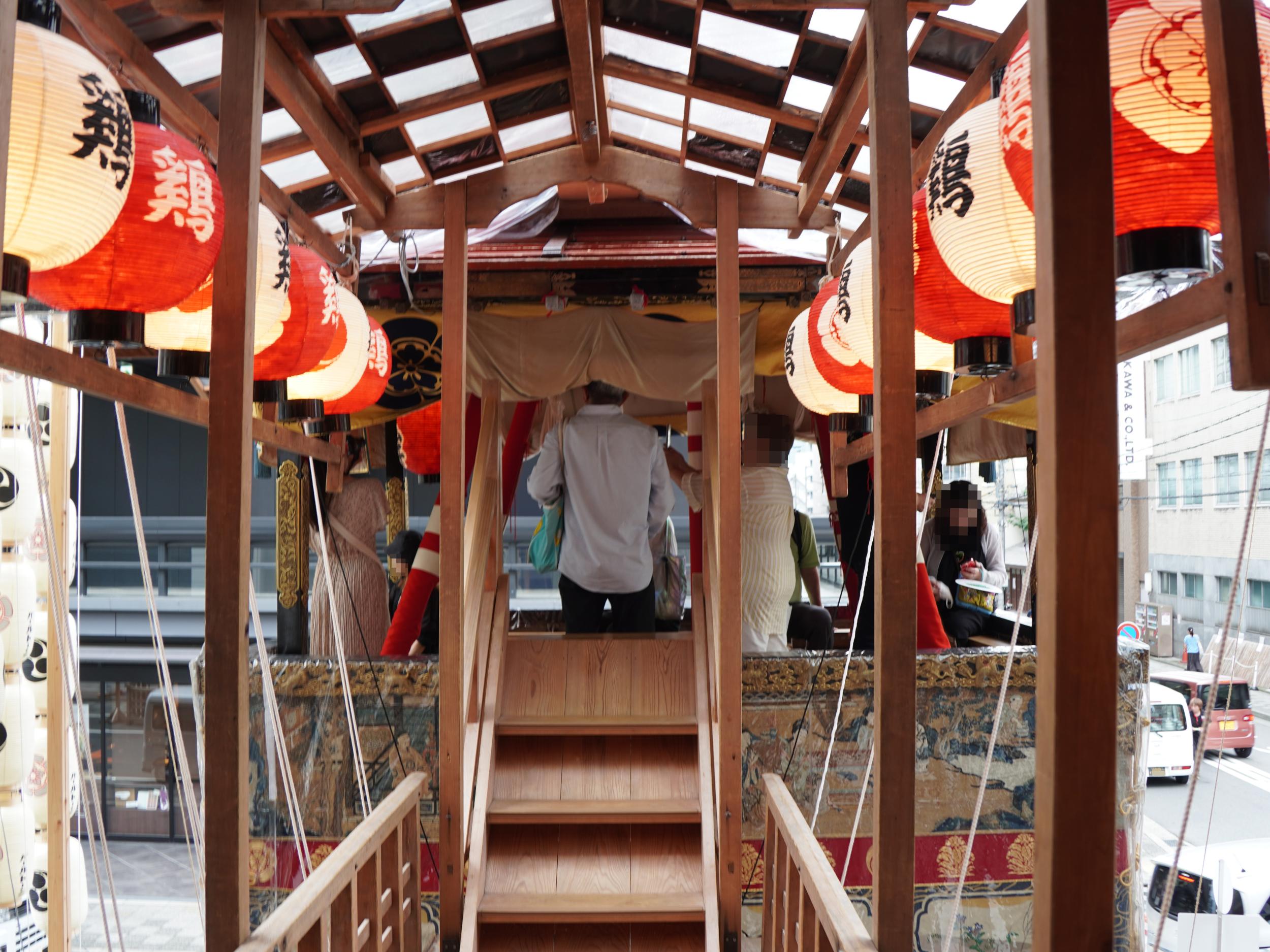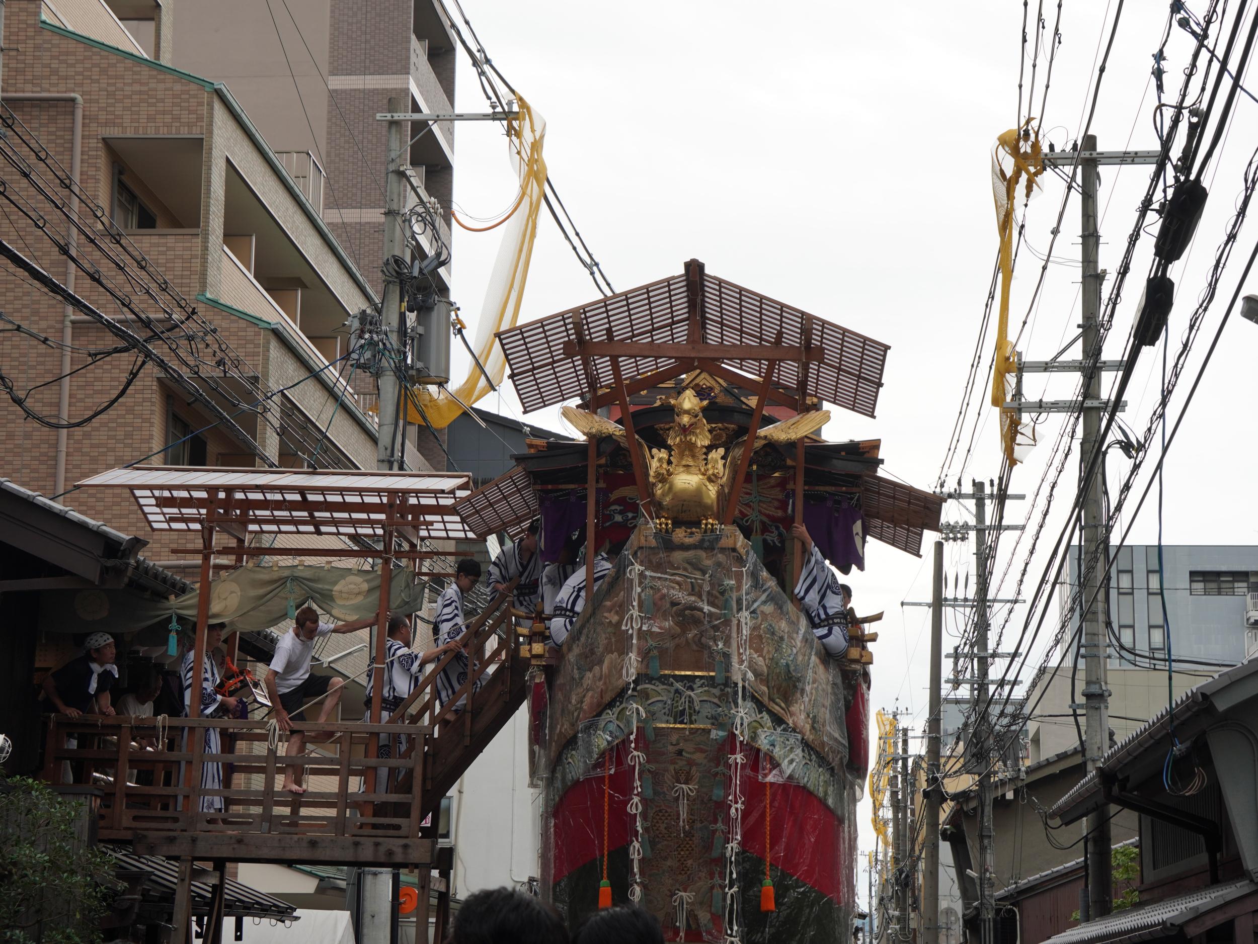 岩戸山と囃子方が乗り込むところの船鉾です。去年の前祭曳き初め一日目より混み合っていて居場所を見つけるのが大変でした。土曜日ということもあるものの、去年の四条通より新町通がずっと狭いためと思われます。